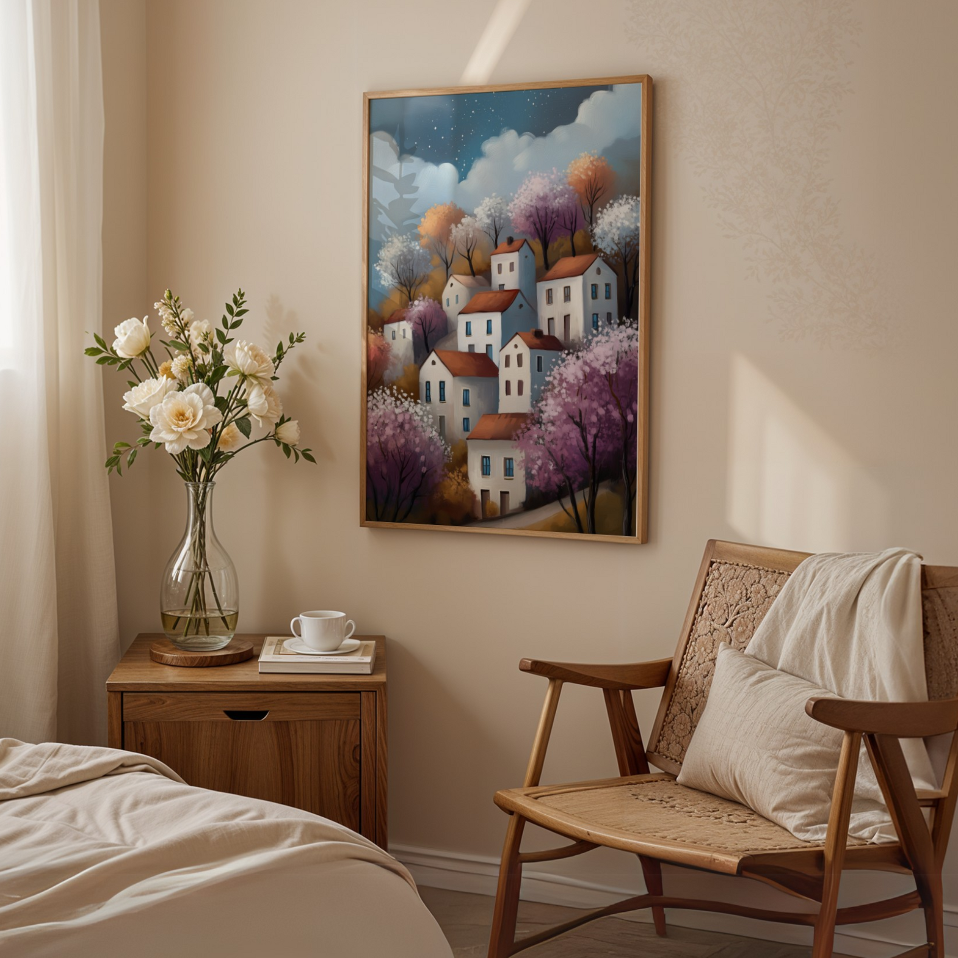 Charming Spring Village Cottages Wall Art Starry Night Landscape. High Resolution Digital Download 300 DPI.