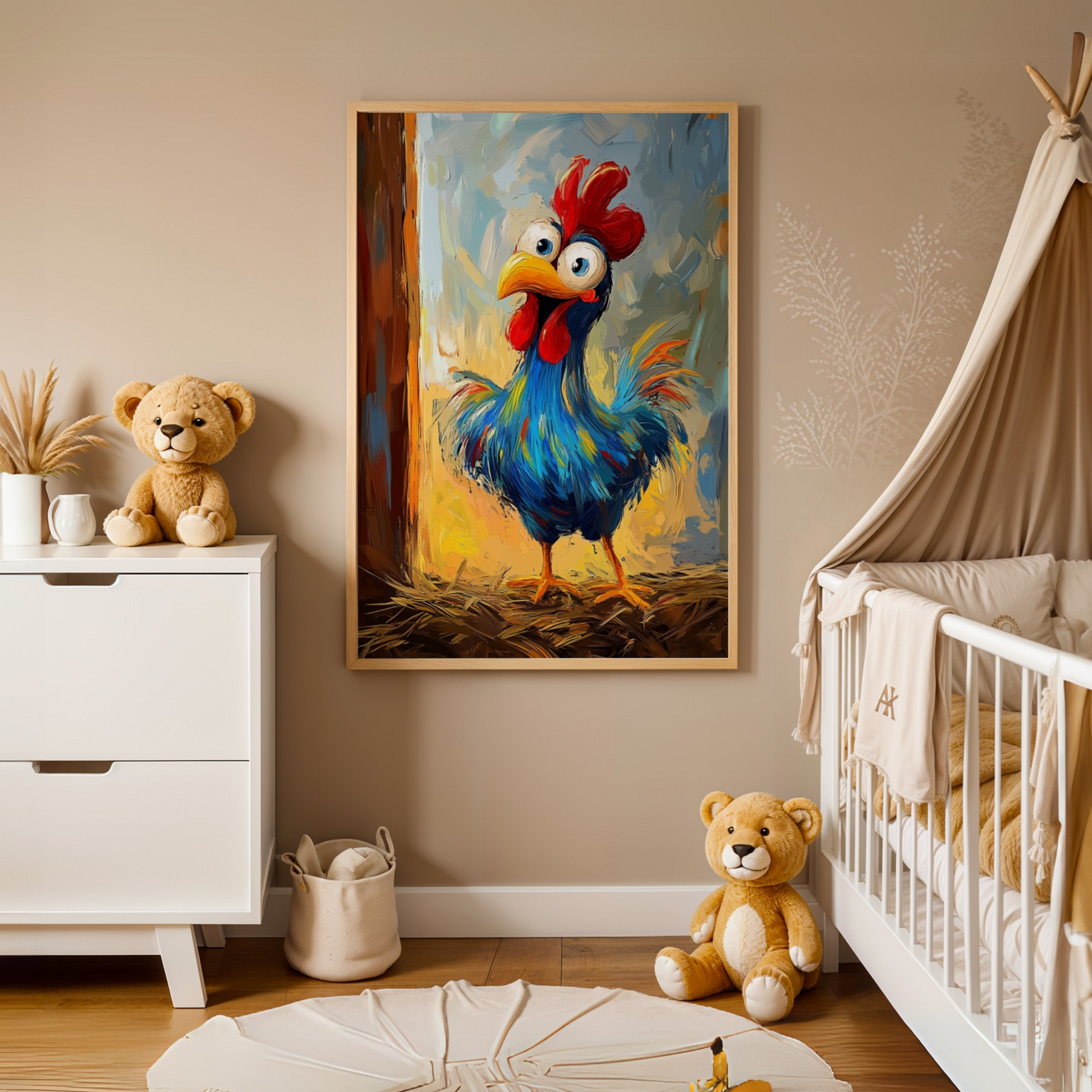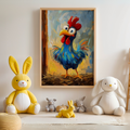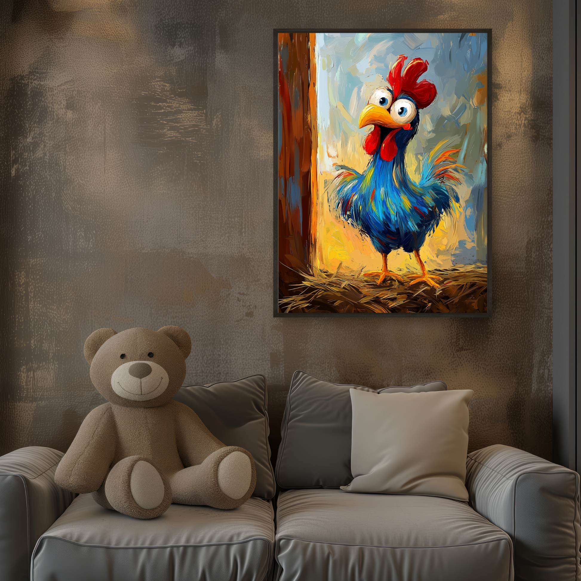 Brighten your space with this cheerful rooster wall art, showcasing a vibrant-feathered rooster perched on straw in an old barn window. Bathed in the warm glow of sunrise, the rooster’s colorful wings and body radiate charm and happiness. Its wide, expressive eyes and upright beak against its red comb create a playful yet heartwarming scene. This artwork captures the rustic beauty of farm life, making it a perfect addition to farmhouse, country, or rustic-themed interiors. This rooster wall art brings a sense of warmth and joy to any room, whether displayed in your kitchen, living room, or entryway. The detailed depiction of the rooster and the soft sunrise lighting combine to create a cozy and inviting atmosphere. Ideal for animal lovers or anyone looking to infuse their home with countryside charm, this piece is both a delightful decor element and a conversation starter.