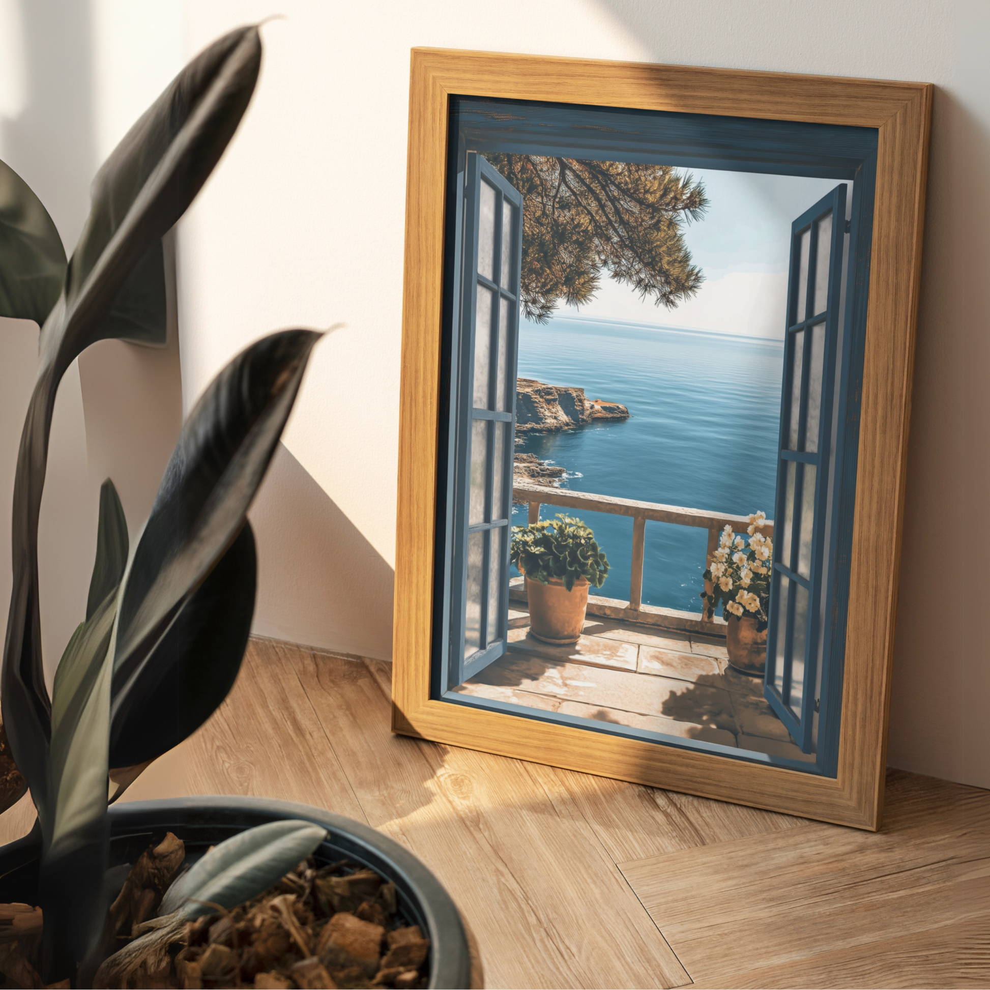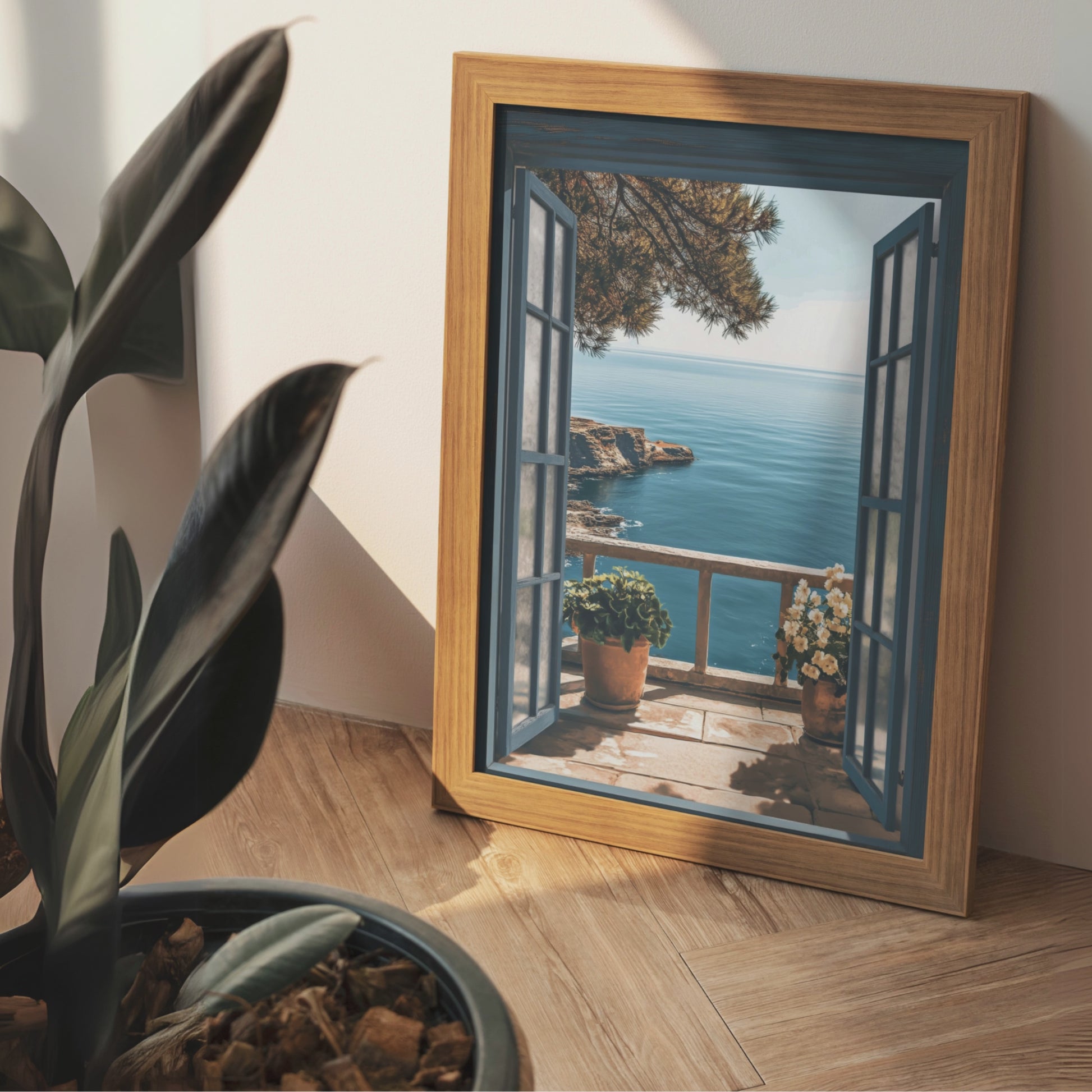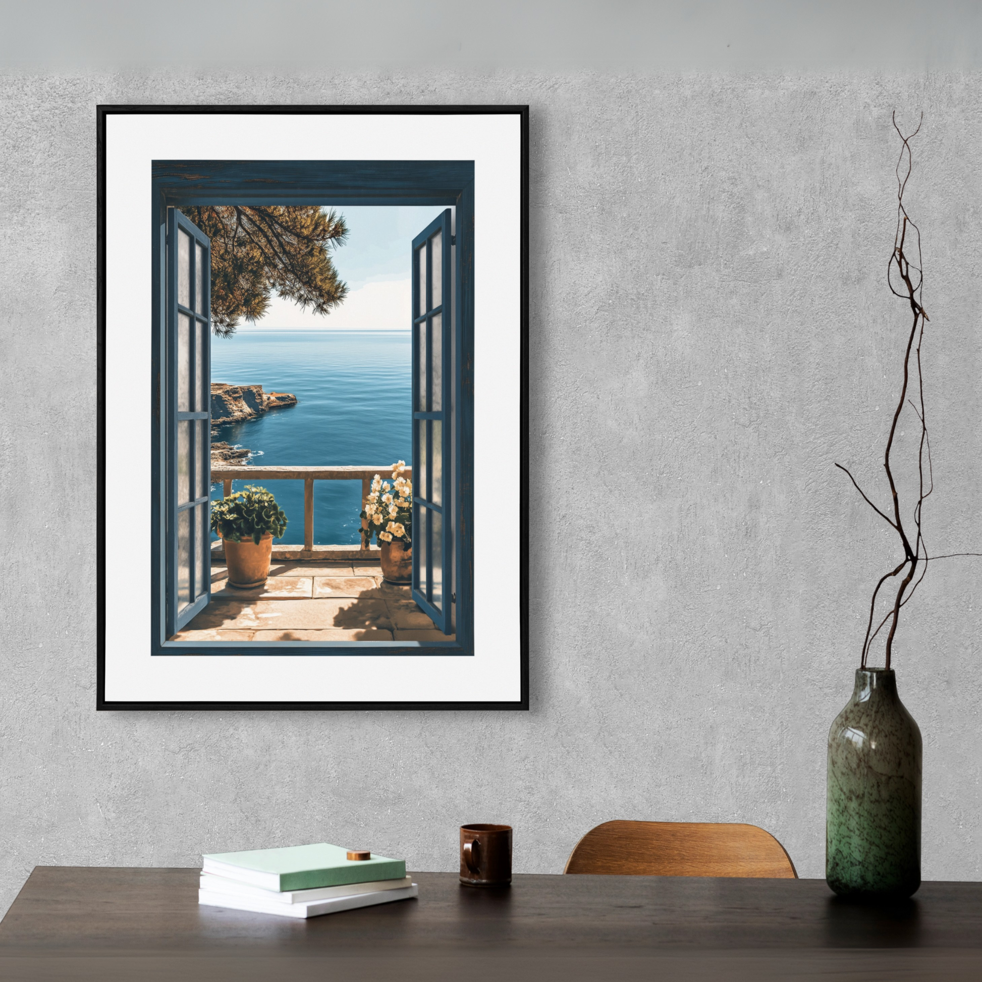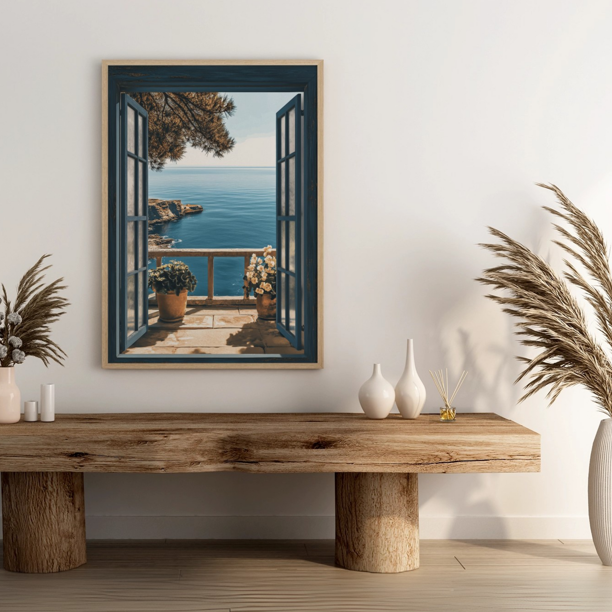 Escape to a sun-drenched Mediterranean paradise with this captivating wall art piece. The scene invites you onto a charming balcony, its blue wooden railings framing a breathtaking view of the azure sea and rugged cliffs beyond. Two vibrant flower pots add a pop of color and life to the foreground, perfectly complementing the natural beauty of the coastal landscape. The artwork captures the essence of a perfect sunny day, with the interplay of light and shadow bringing depth and warmth to the scene. This stunning art brings the relaxing atmosphere of a seaside retreat into your home or office. The composition masterfully balances the intimate, homey feel of the balcony with the expansive, awe-inspiring vista of the sea and cliffs, creating a sense of both comfort and adventure. The rich blue hues of the railing and sea, contrasted with the earthy tones of the cliff and the bright colors of the flowers, create a visually striking yet harmonious piece. Whether you're a lover of coastal decor, dream of Mediterranean getaways, or simply seek a daily visual escape, this artwork offers a window to serenity and natural beauty in any room.