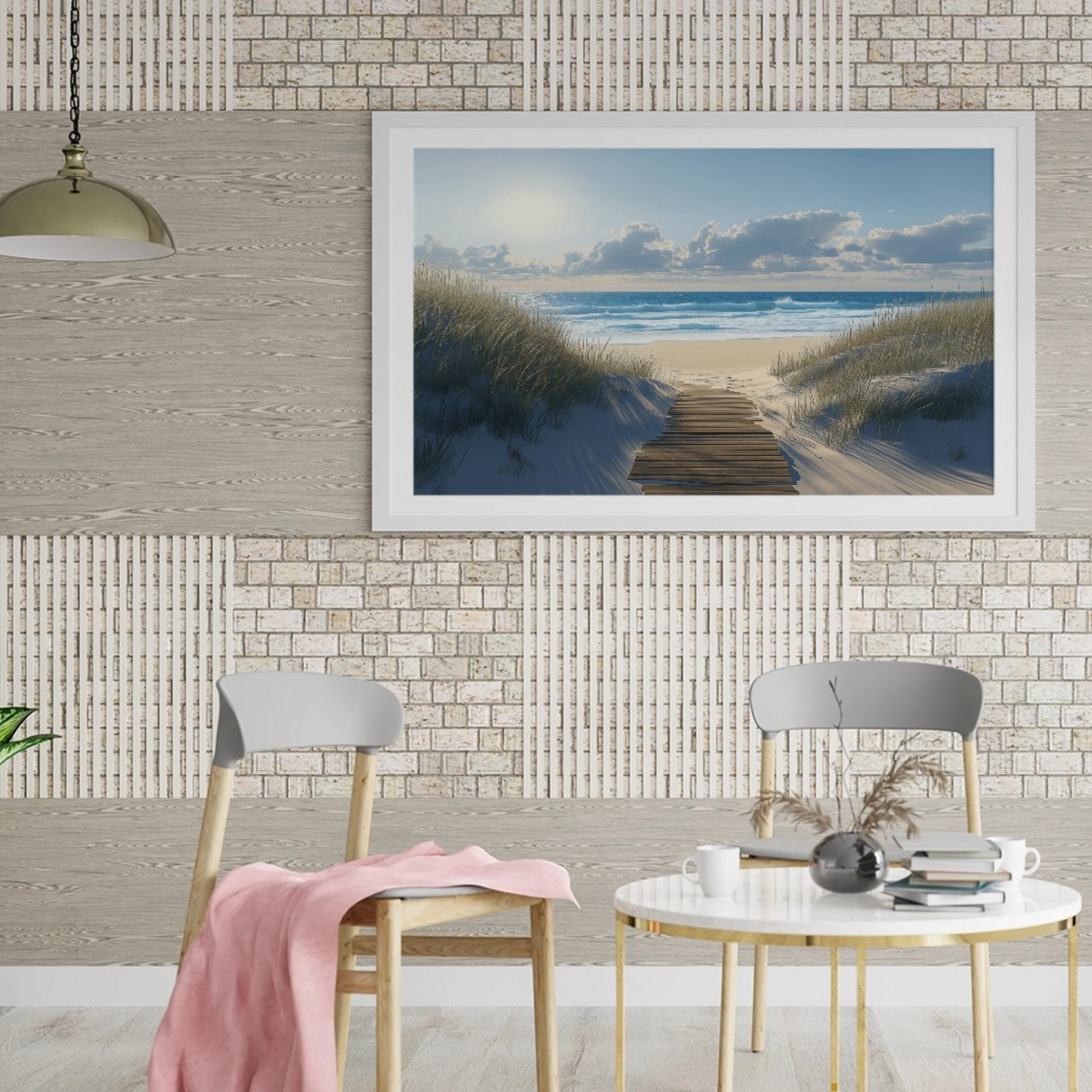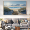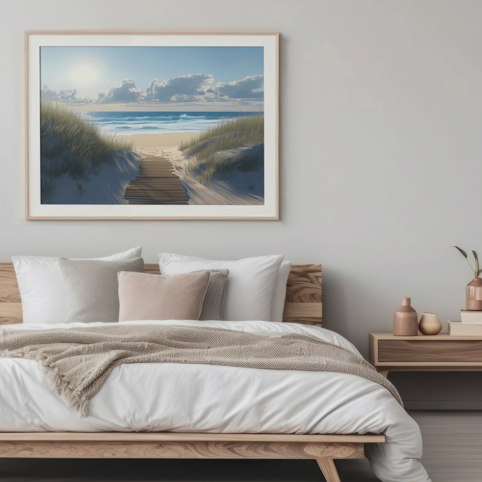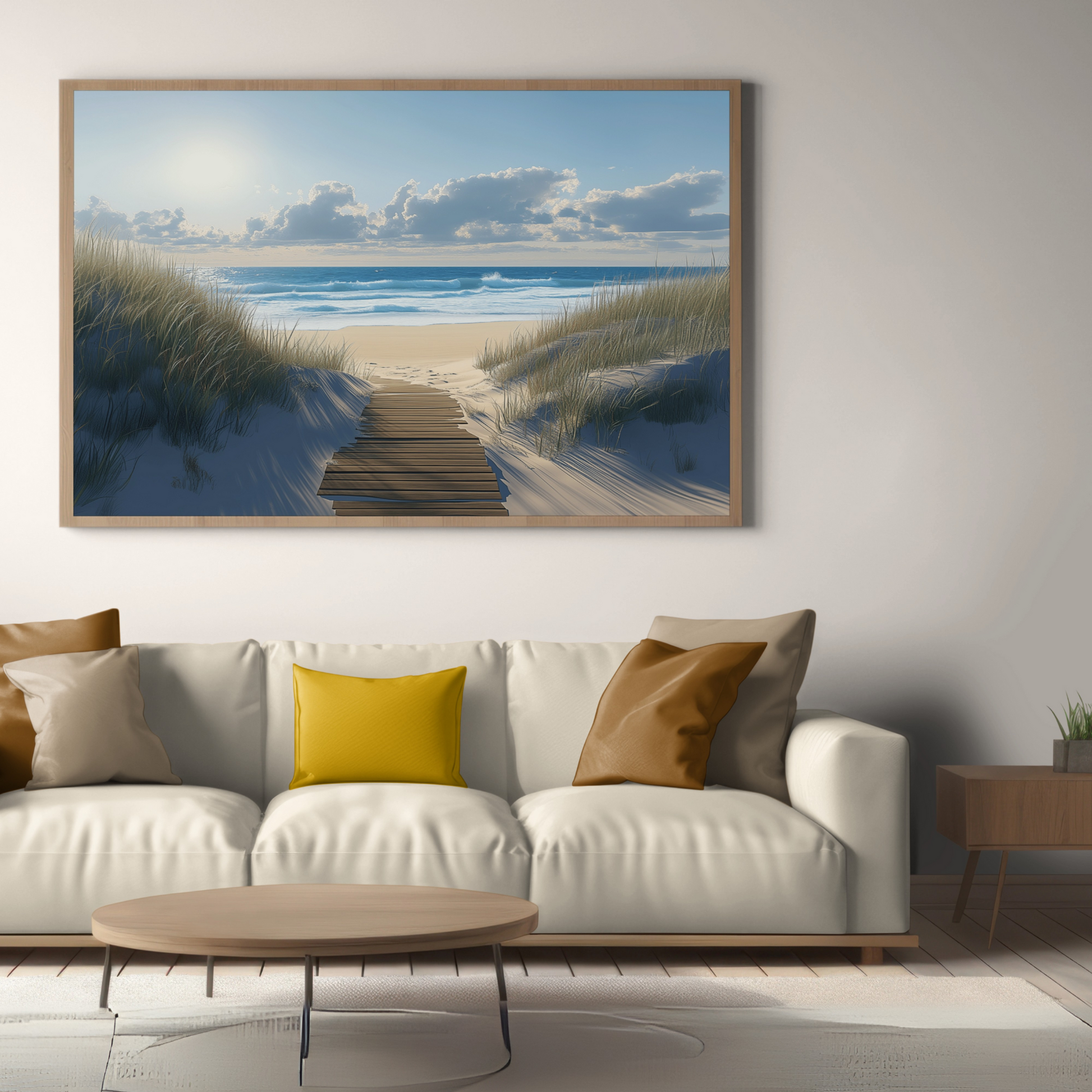 Step into a world of tranquility with this stunning hyper-realistic wall art piece. The artwork captures a serene beach entryway with exquisite detail, inviting viewers to experience the calm of a coastal retreat. A winding path of sand and weathered wooden planks guides the eye through swaying beach grass towards the gentle ocean beyond. The overcast sky casts a soft, diffused light across the scene, enhancing the peaceful atmosphere and bringing out the rich textures of each element. This masterful piece showcases the fine details, from individual grains of sand to the delicate blades of grass. The muted color palette of natural tones perfectly captures the essence of a quiet day by the sea. Ideal for bringing a sense of calm and natural beauty to any space, this artwork serves as a window to a peaceful coastal world. Whether displayed in a living room, bedroom, or office, it offers a moment of escape and reflection, making it a perfect addition to any home or workspace seeking a touch of seaside serenity.