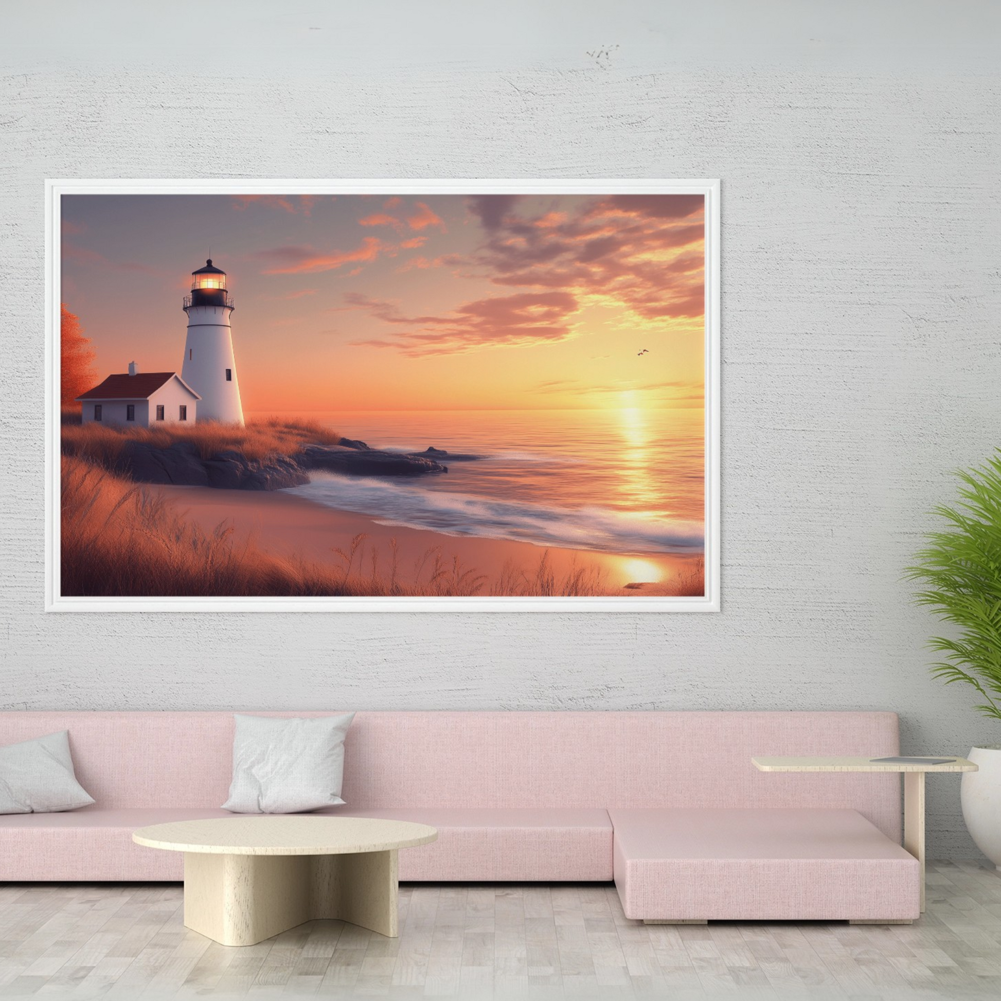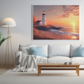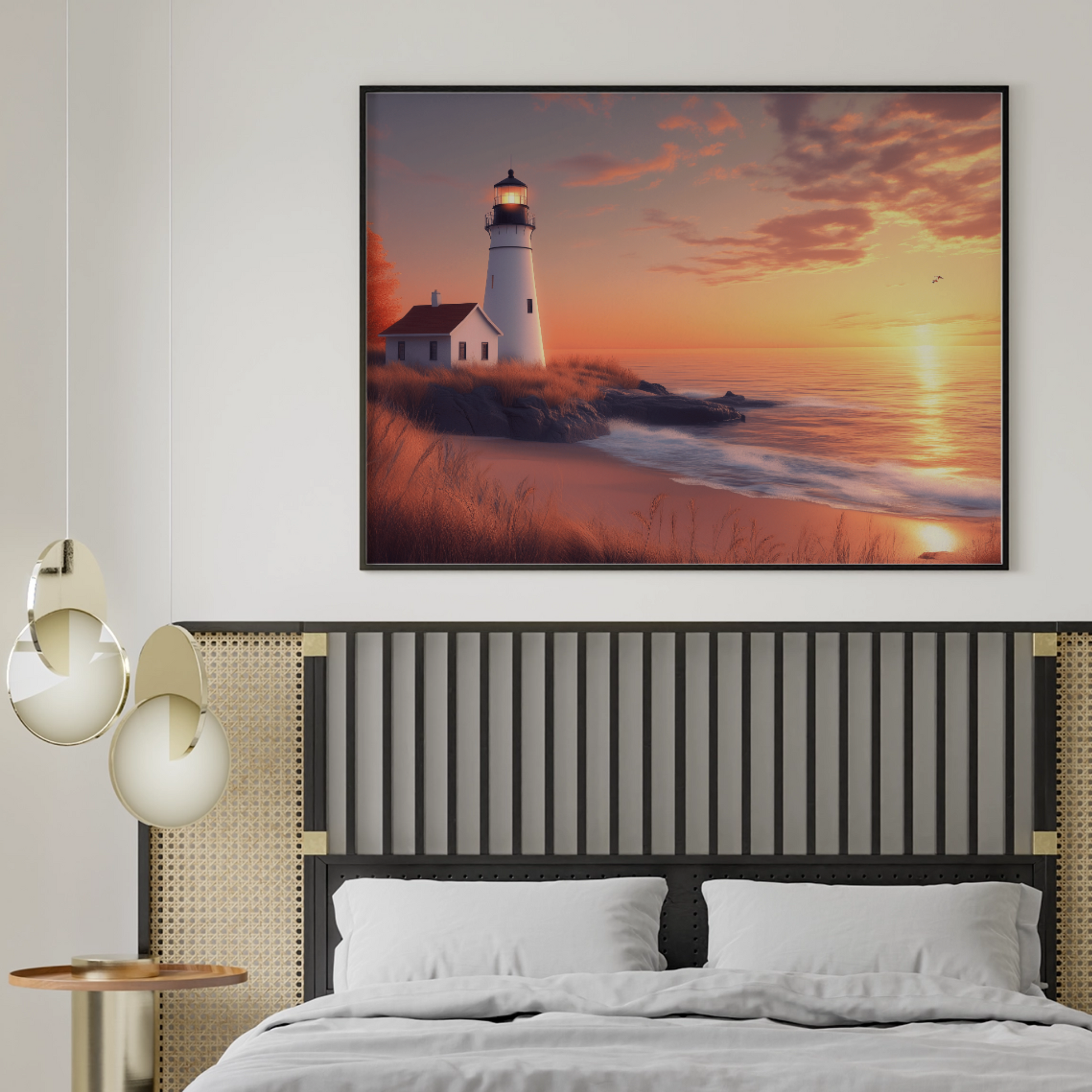 Immerse yourself in the tranquil beauty of this captivating coastal scene. A majestic white lighthouse with a distinctive black top stands proudly alongside a charming white house adorned with a vibrant red roof. As the day fades into evening, the lighthouse's warm, inviting glow pierces the twilight, guiding ships safely to shore. The structures, perched atop a rugged rocky outcrop, are surrounded by swaying golden grass that adds movement and life to the scene. Below, a pristine sandy beach stretches towards the gently lapping waves, creating a perfect balance between land and sea. This stunning artwork brings the serene atmosphere of a coastal sunset into your home or office. The use of a warm color palette bathes the scene in soft, golden light, with the sky transitioning from deep orange to delicate pink and lavender hues. The shimmering path of sunlight on the water draws the eye towards the horizon, where two birds soar in the distance, adding a touch of freedom to the composition. The painterly style and smooth textures create a dreamy, almost ethereal quality, inviting viewers to lose themselves in the peaceful coastal landscape. Whether you're a lover of maritime scenes, an admirer of lighthouses, or simply seeking a moment of calm in your daily life, this art offers a window to a world of natural beauty and tranquility.