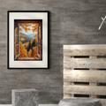 Experience the warmth and beauty of autumn from the comfort of a charming wooden cottage with this captivating wall art piece. The artwork invites you to gaze through a rustic window frame, offering a breathtaking view of rolling hills adorned with a tapestry of pine and oak trees in their full autumnal glory. The rich palette of reds, oranges, and golds captures the essence of fall, creating a scene that radiates warmth and tranquility. This stunning art brings the cozy feeling of a secluded forest retreat into your home. The unique perspective from inside the cottage adds depth and intimacy to the landscape, making viewers feel as if they're truly part of the scene. The intricate details of the wooden window frame contrast beautifully with the soft, impressionistic rendering of the autumn foliage, creating a perfect balance of textures and styles. Whether displayed in a living room, bedroom, or office, this artwork serves as a daily reminder of nature's seasonal beauty and the simple joys of a peaceful retreat in the woods.