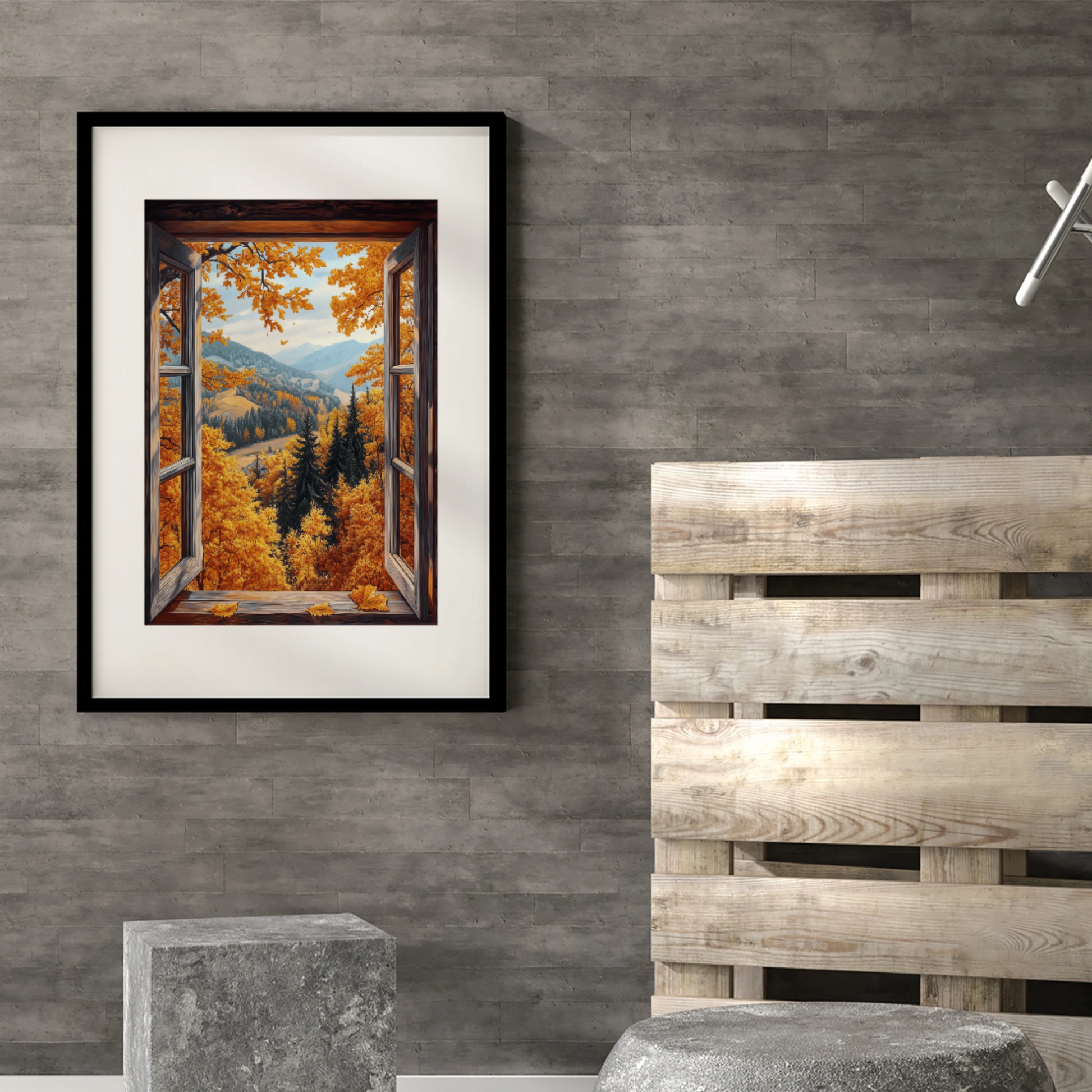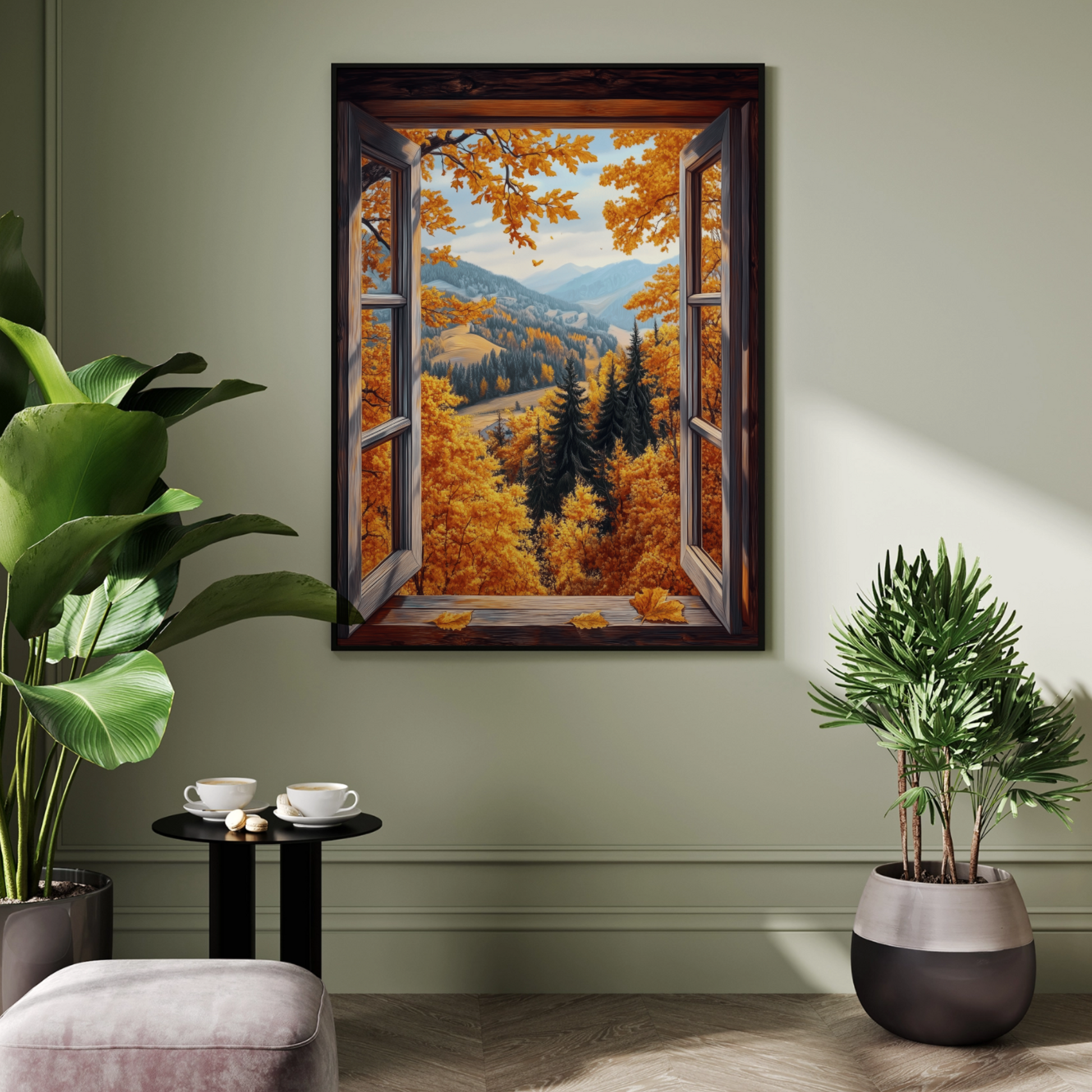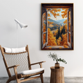 Cozy Autumn Vista: Rustic Cottage Window Fall Landscape Wall Art. High Resolution Digital Download 300 DPI.