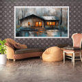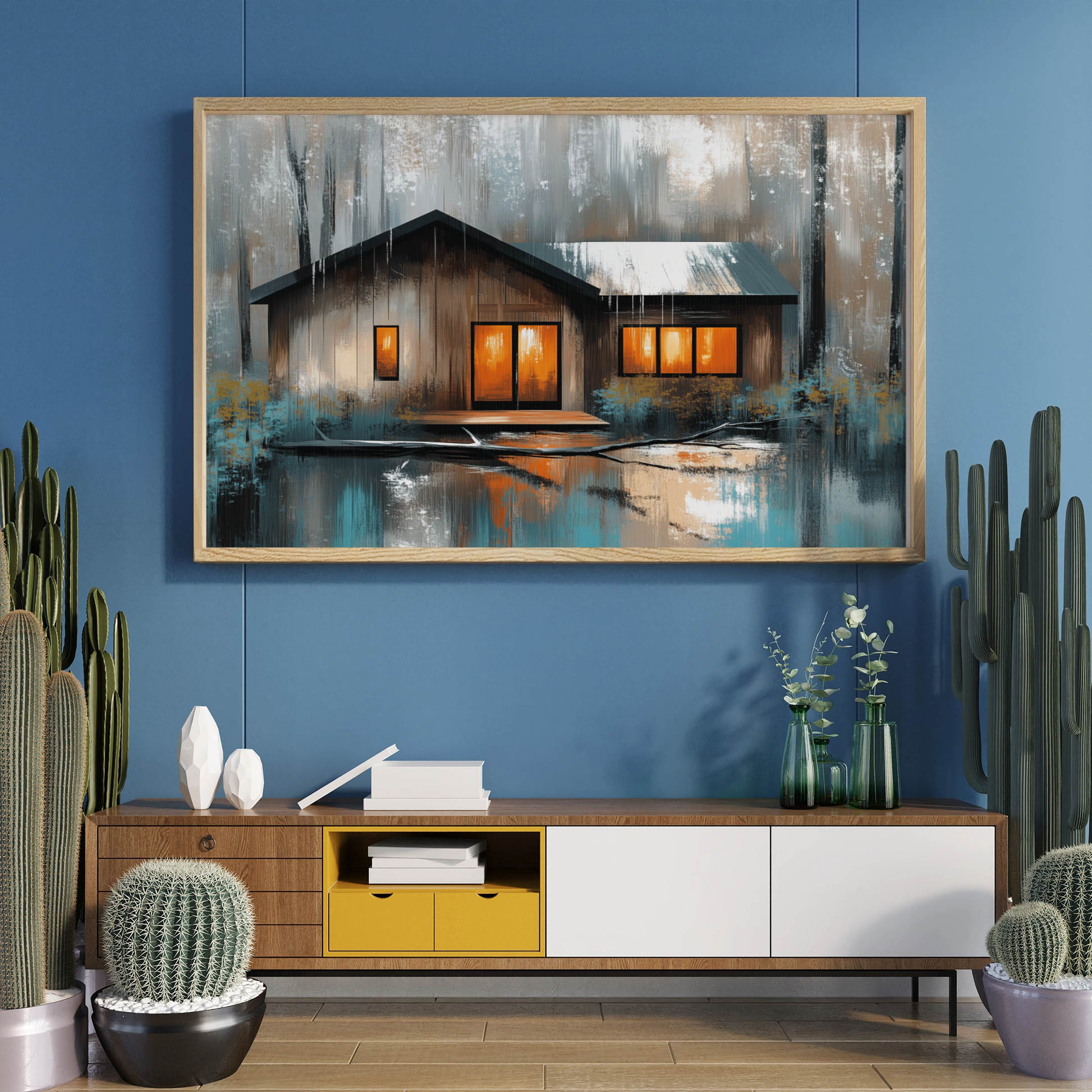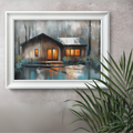 Experience the enchanting allure of nature's drama with this captivating wall art piece. A quaint wooden cabin stands resilient amidst a tempestuous forest scene, its warm orange lights glowing invitingly through the windows. The contrast between the raging storm outside and the implied comfort within creates a powerful visual narrative that speaks to the heart of anyone who's ever sought shelter from life's metaphorical storms. This artwork masterfully captures the raw beauty of a woodland downpour. Lightning illuminates the sky, casting an ethereal glow on the lush green bushes and a fallen tree in the foreground. The intricate details - from the texture of the cabin's wooden exterior to the glistening raindrops - invite viewers to lose themselves in the scene. Perfect for nature enthusiasts and those who appreciate the juxtaposition of comfort and wildness, this piece adds a touch of rustic charm and atmospheric depth to any room.