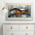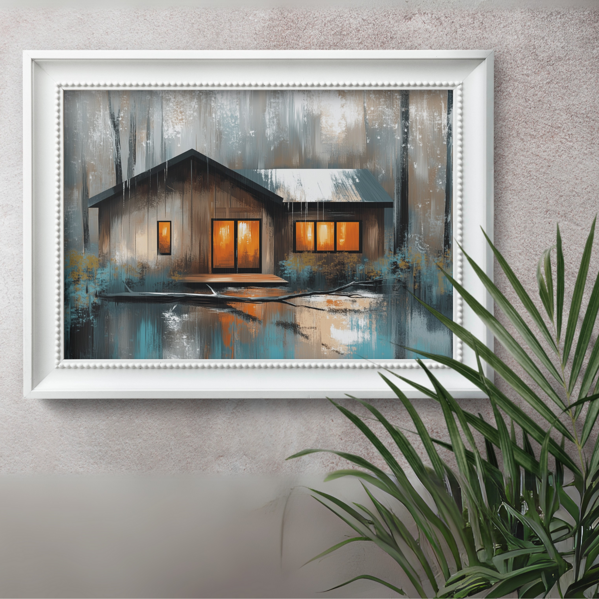 Cozy Woodland Cabin: Stormy Night Illuminated Forest Retreat Art. High Resolution Digital Download 300 DPI.