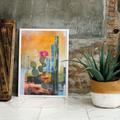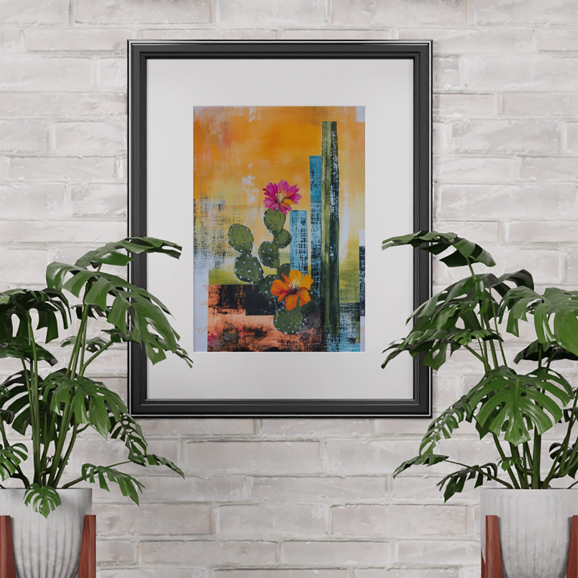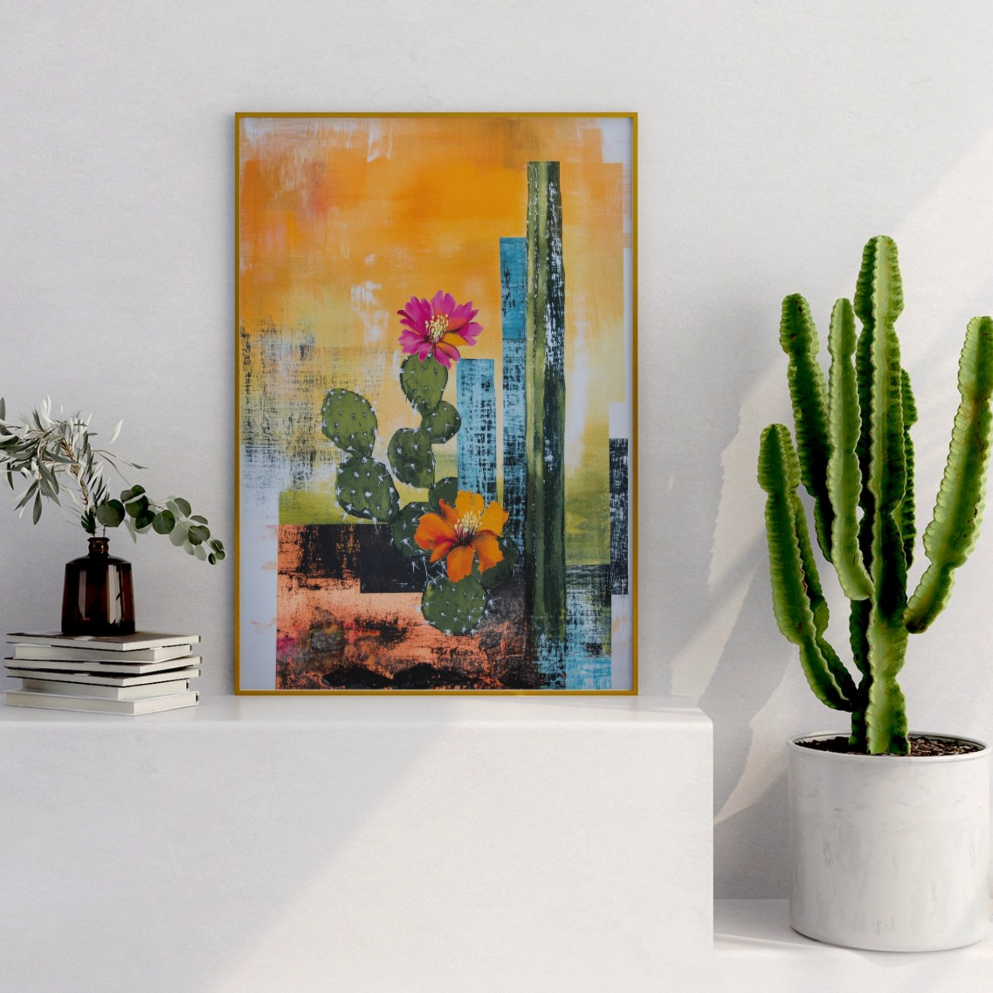 Desert Bloom Oasis: Cactus Flowers Rock Formation Green-Orange Wall Art. High Resolution Digital Download 300 DPI.
