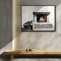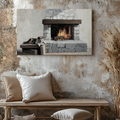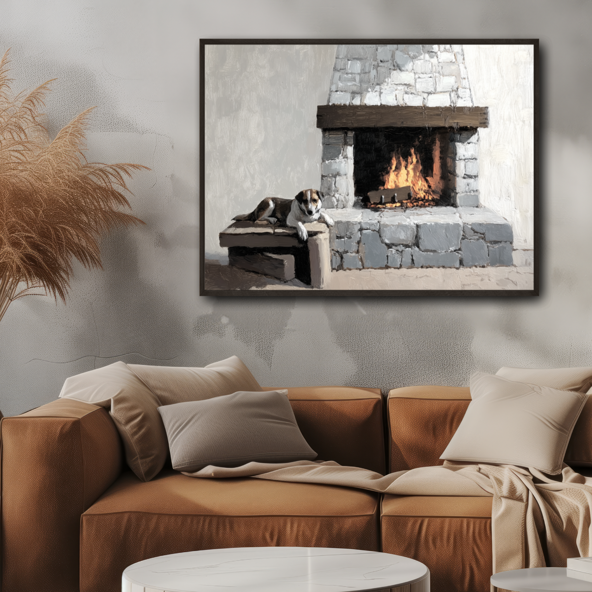 Dog by Fireplace Wall Art Ancient Home Cozy Oil Painting Scene. High Resolution Digital Download 300 DPI.