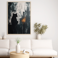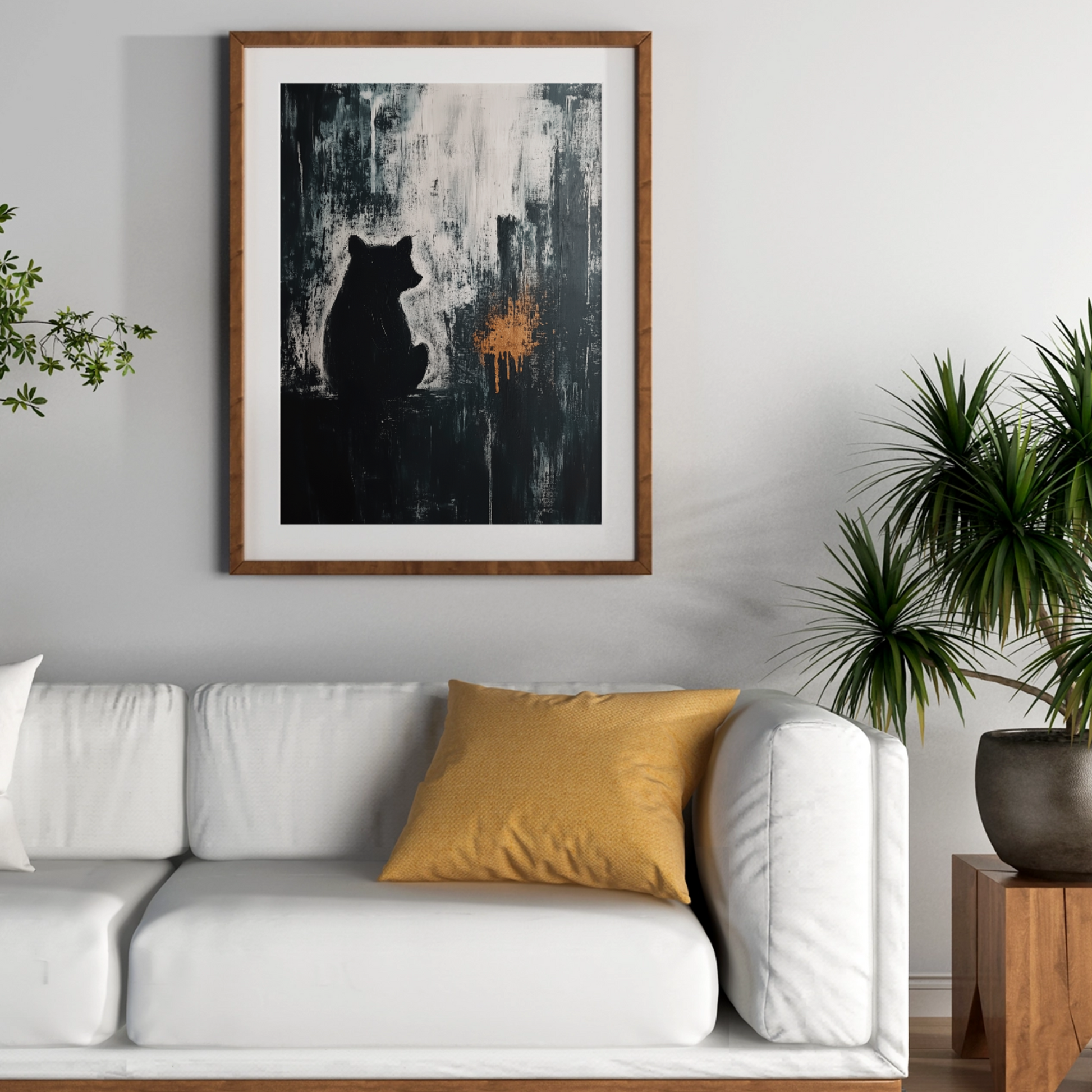 Elevate your space with this striking canvas art featuring a powerful bear silhouette set against a moody, textured background. The simple yet bold profile of the bear creates a strong focal point, while an unexpected splash of vibrant orange paint adds a dynamic and intriguing element to the composition. This burst of color, seemingly dripping down the canvas, creates a captivating contrast with the dark tones surrounding it, infusing the piece with energy and visual interest. The background of this masterful artwork is a rich tapestry of black and white brush strokes, creating an abstract and atmospheric backdrop that enhances the overall mood. This high-quality print is perfect for those who appreciate contemporary art with a touch of wilderness. Whether displayed in a living room, office, or bedroom, this dramatic bear silhouette art will add depth, intrigue, and a touch of the wild to any interior space, serving as a conversation starter and a striking visual centerpiece that commands attention.