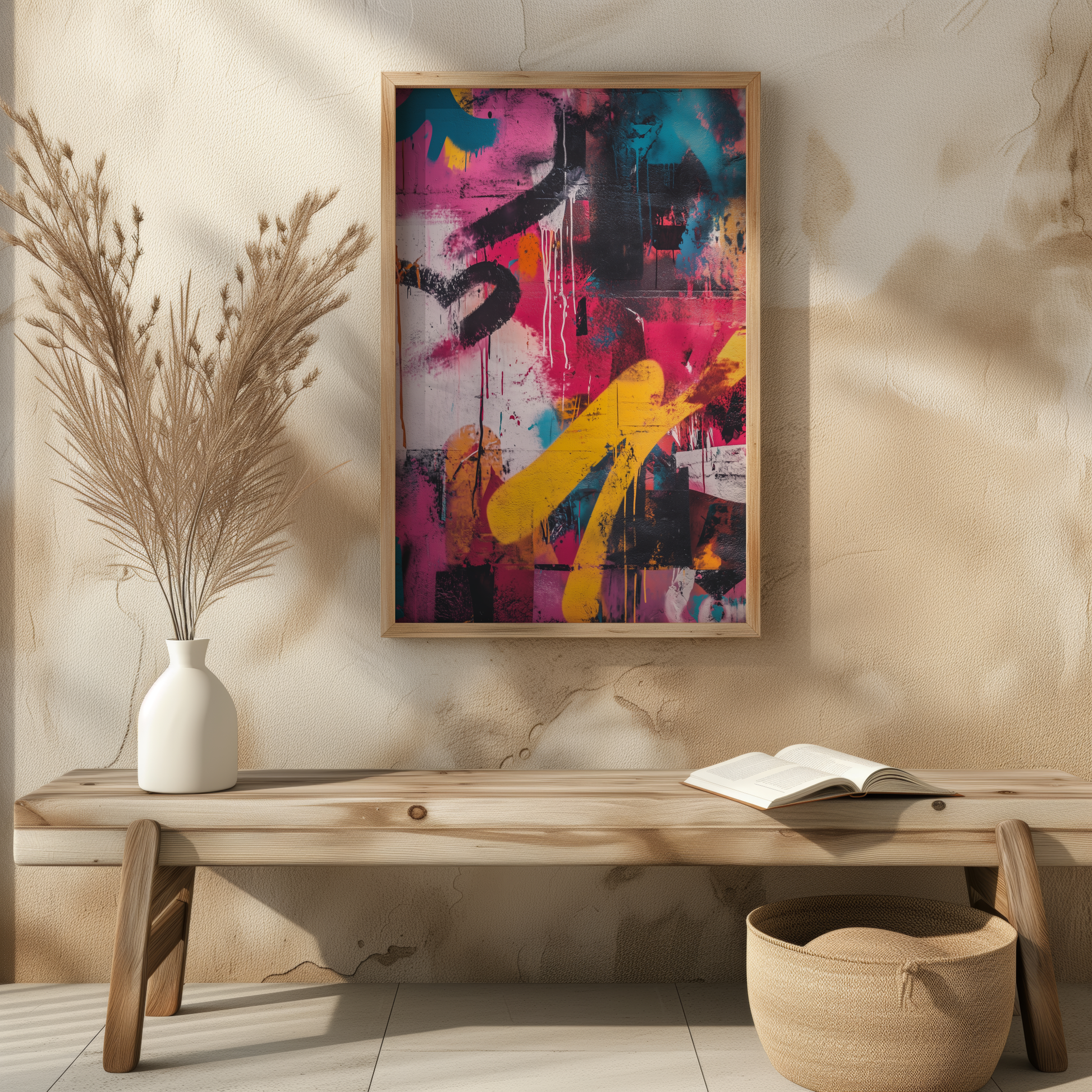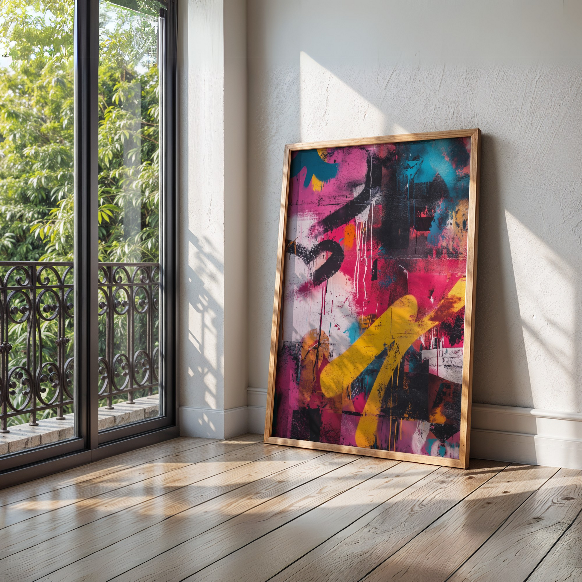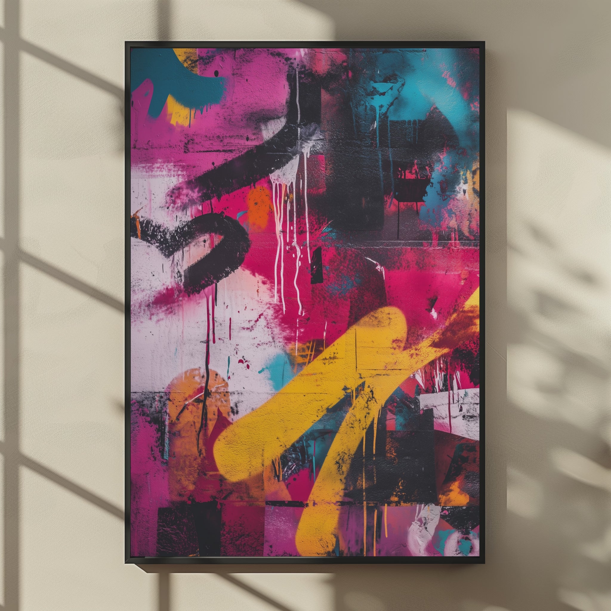 Experience the vibrant energy of city life with this richly detailed urban wall art, where layers of paint splashes, drips, and overlapping graffiti tags create a visually intricate and balanced composition. Neon and pastel hues collide across fragmented sections, blending abstract expressionism with the raw edge of street art. Fine spray paint details and naturally blended color zones emerge against a subtle grunge background, evoking the authentic texture of a concrete wall and adding immersive depth to the scene. This artwork masterfully combines controlled chaos and artistic precision, offering a dynamic backdrop that celebrates the spirit of urban creativity. Perfect for modern interiors, studios, or anyone passionate about contemporary art, this piece brings a burst of color, movement, and cultural flair to any space.