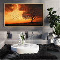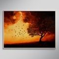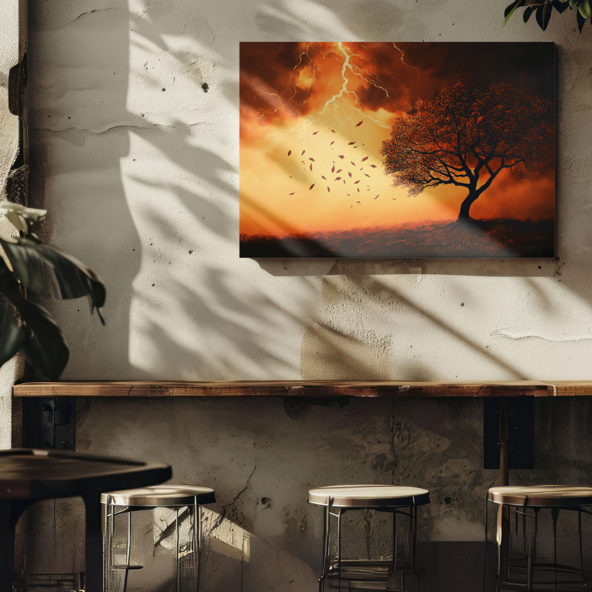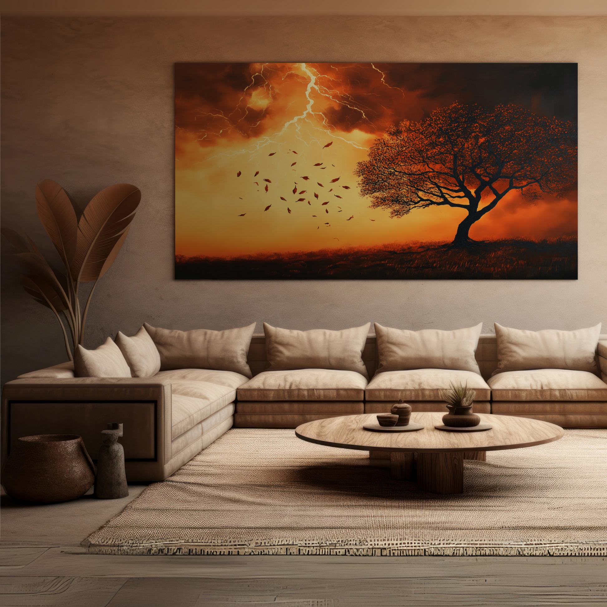 Embrace the power of nature with this striking modern wall art piece. A simplistic tree silhouette, shedding leaves, stands boldly against a vibrant gradient background of orange to brown. The sky above erupts with a gigantic lightning storm, its electric bolts cutting through the air with dramatic intensity. This oil painting-inspired artwork combines the raw energy of a thunderstorm with clean, minimalist design elements, creating a visually arresting composition that demands attention. Perfect for contemporary interiors and lovers of modern art, this piece offers a fresh take on nature-inspired decor. The high-contrast colors and clean lines create a graphic, eye-catching effect, while the use of negative space adds a sense of depth and sophistication. The juxtaposition of the delicate falling leaves against the fierce lightning storm creates a compelling narrative of strength and vulnerability. This art print is an ideal focal point for any room, bringing a touch of drama and modern flair to your living space.