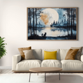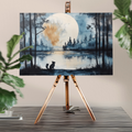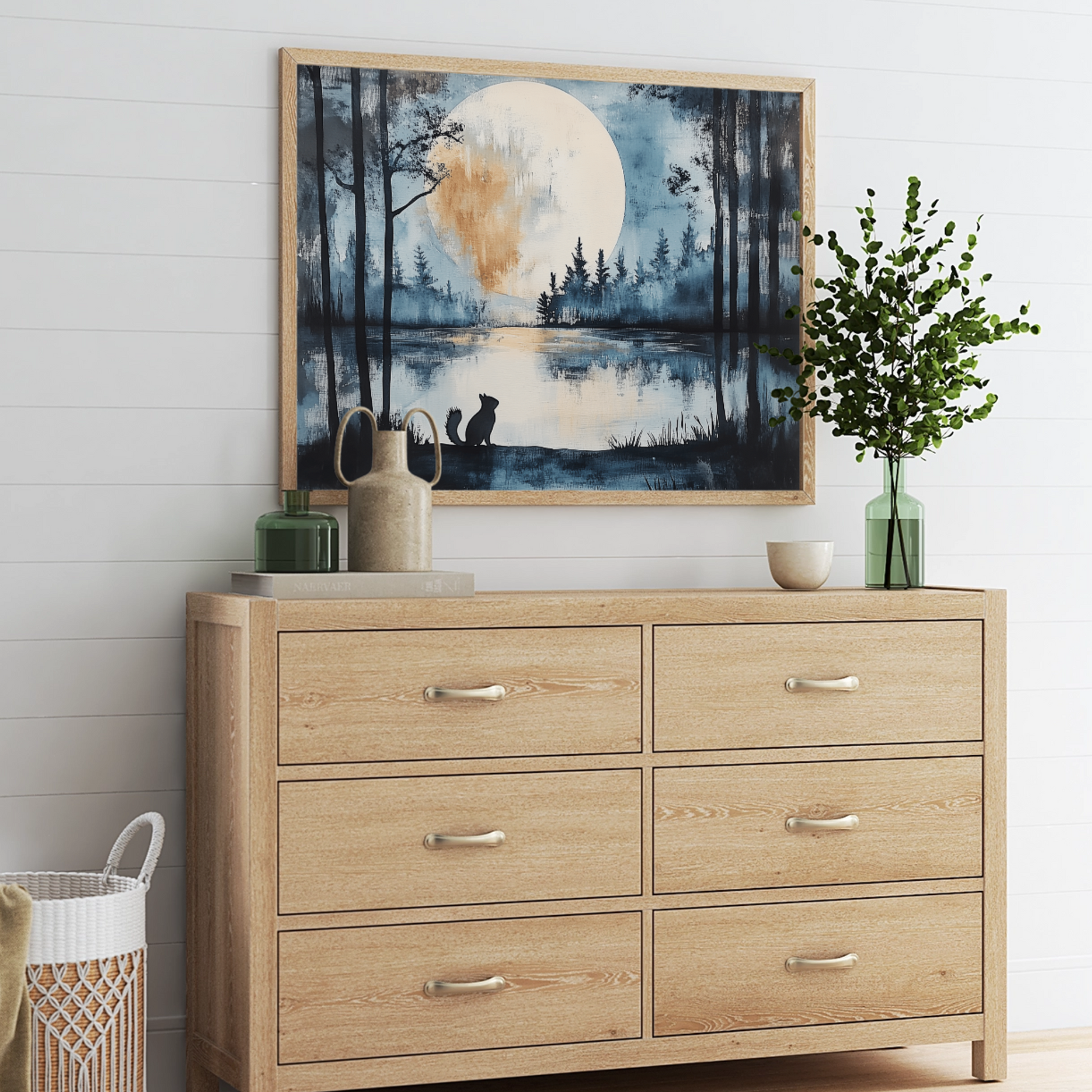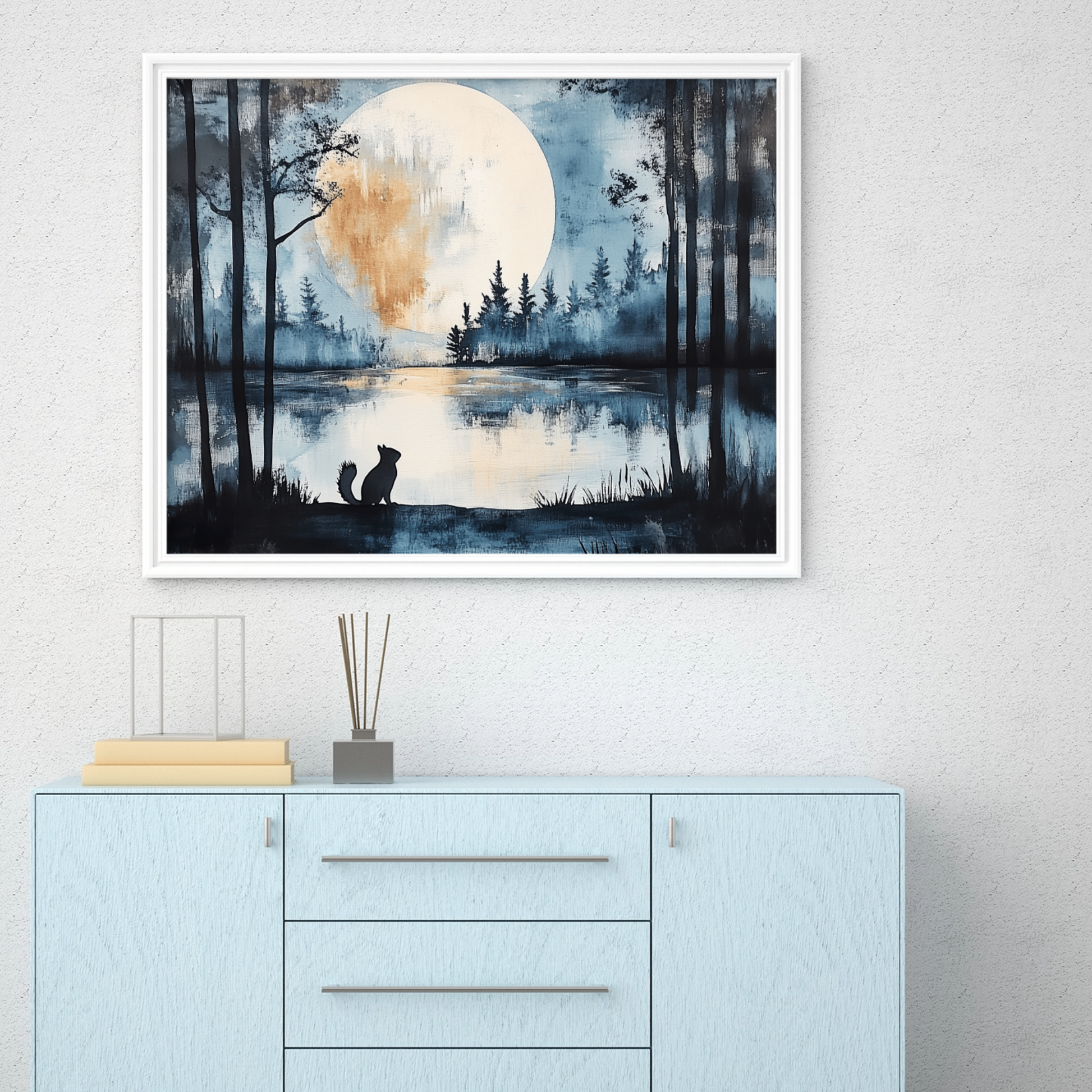 Step into a world of nocturnal wonder with this captivating wall art piece. As the moon ascends, its ethereal glow is perfectly mirrored in a tranquil forest lake, creating a mesmerizing lunar illusion. The scene is brought to life by a curious squirrel, venturing towards the shimmering waters. This artwork masterfully captures the magic and mystery of a moonlit forest, inviting viewers to lose themselves in its serene beauty. The interplay of light and shadow in this piece creates a sense of depth and intrigue. Dark silhouettes of trees frame the luminous lake, while the lone squirrel adds a touch of whimsy and movement to the still scene. Perfect for nature lovers and those who appreciate the quiet magic of nighttime landscapes, this wall art brings a sense of tranquility and enchantment to any room. It's an ideal focal point for bedrooms, living spaces, or meditation areas, offering a window into a world of nocturnal serenity.