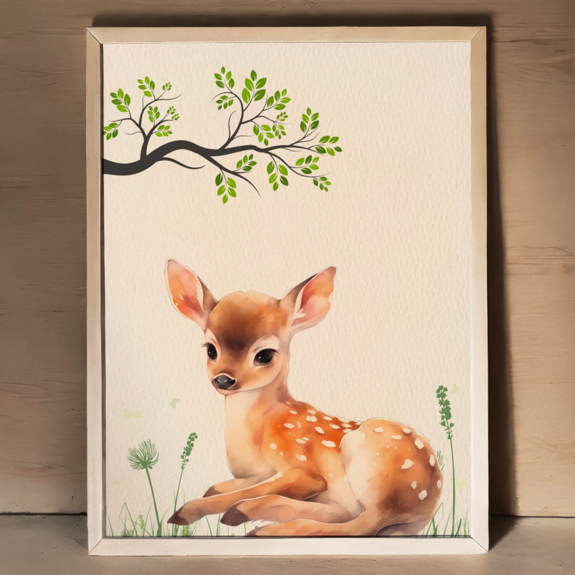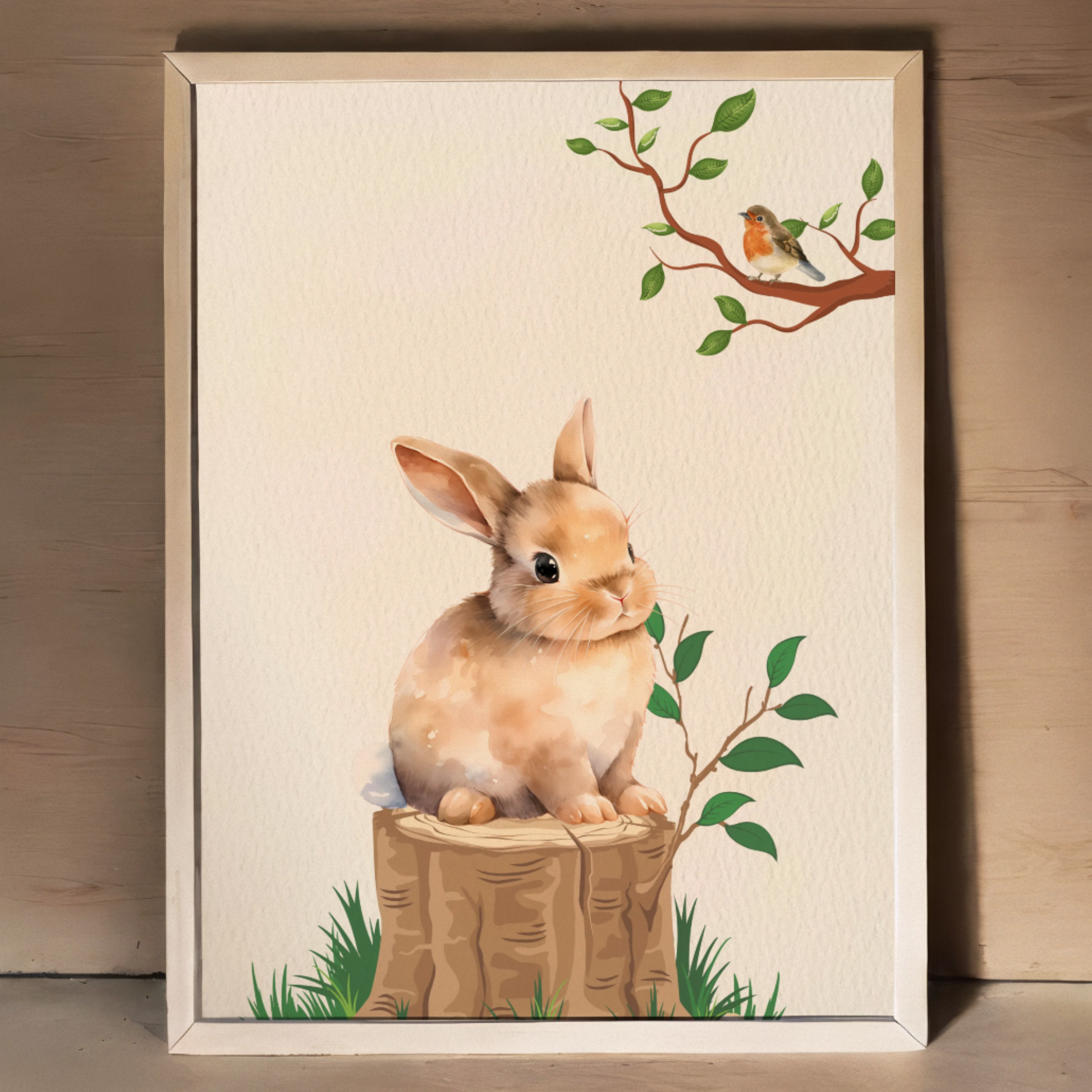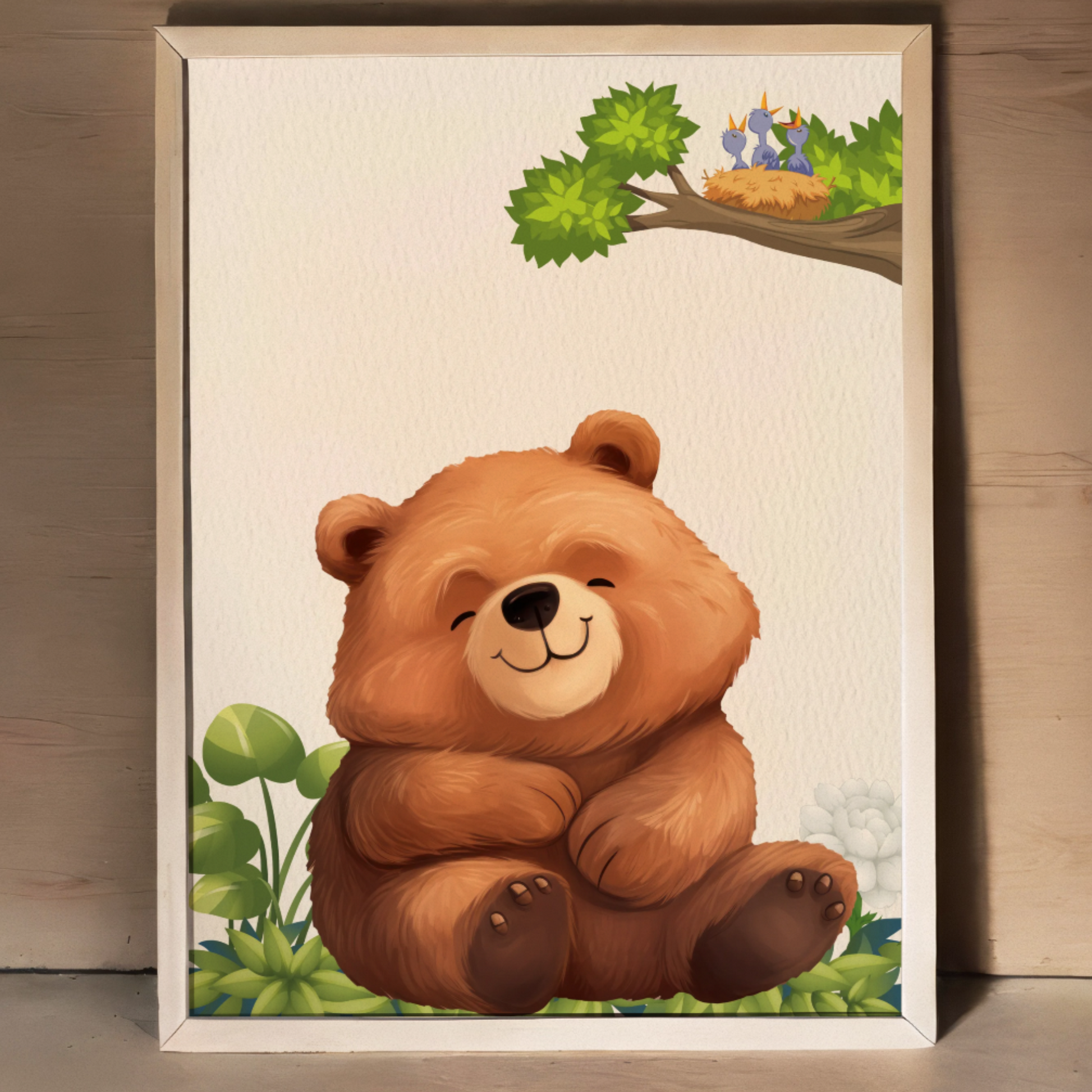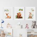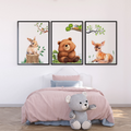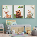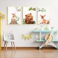 Bring the charm of nature indoors with this delightful wall art print featuring a whimsical illustration of a cute bear, gentle fawn, and playful rabbit in a serene woodland setting. Perfect for nurseries, children's rooms, or any space needing a touch of forest magic.