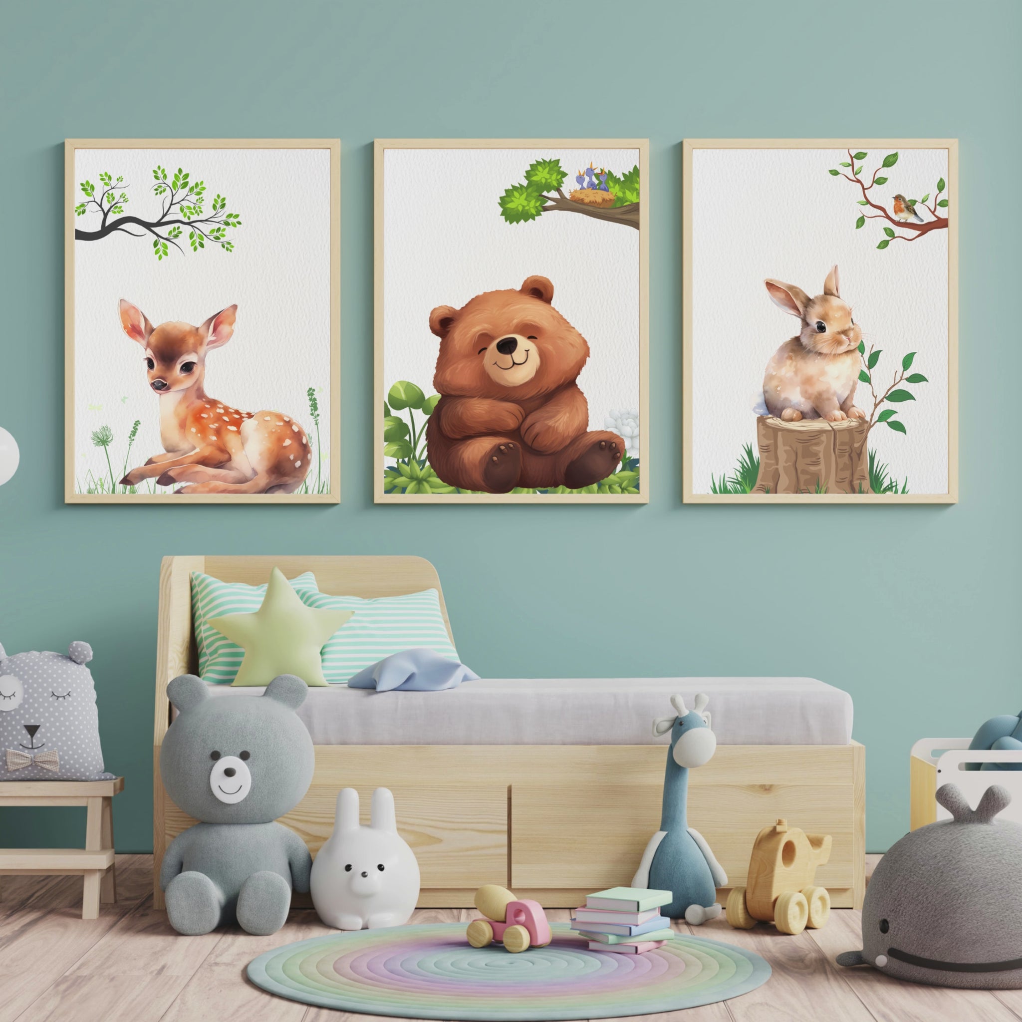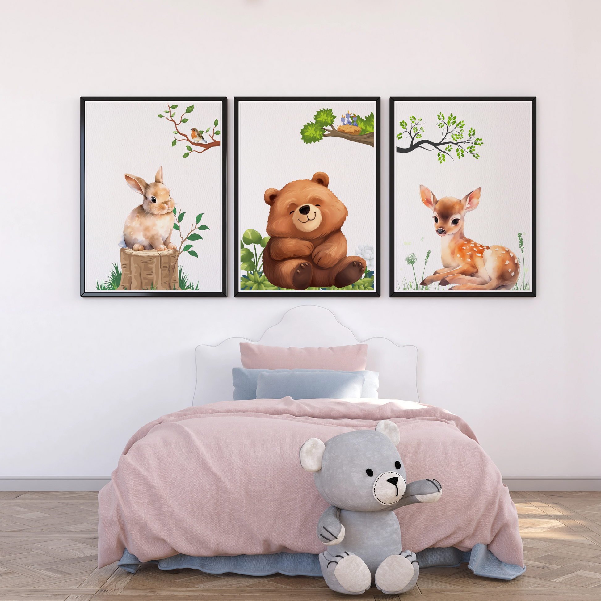 Enchanting Woodland Friends: Adorable Bear, Fawn, and Rabbit Wall Art Print. High Resolution Digital Download 300 DPI.