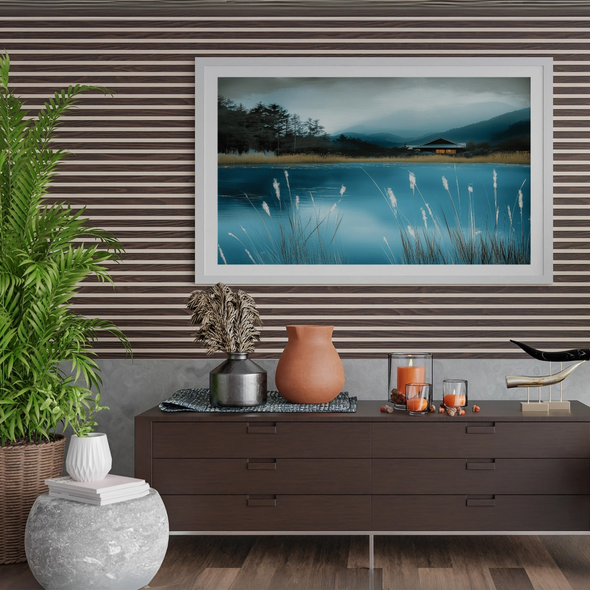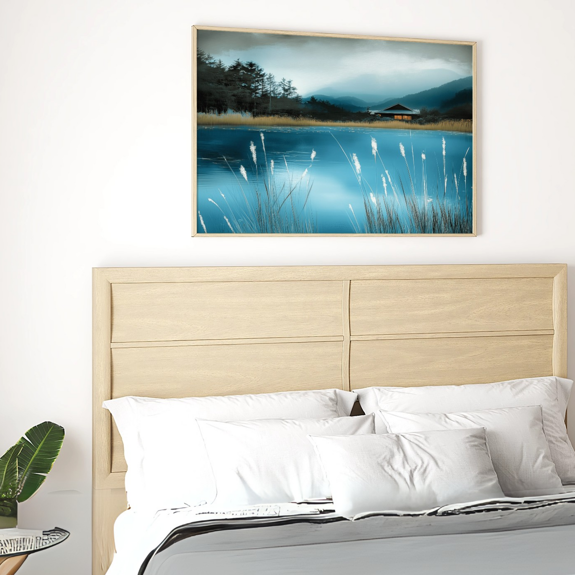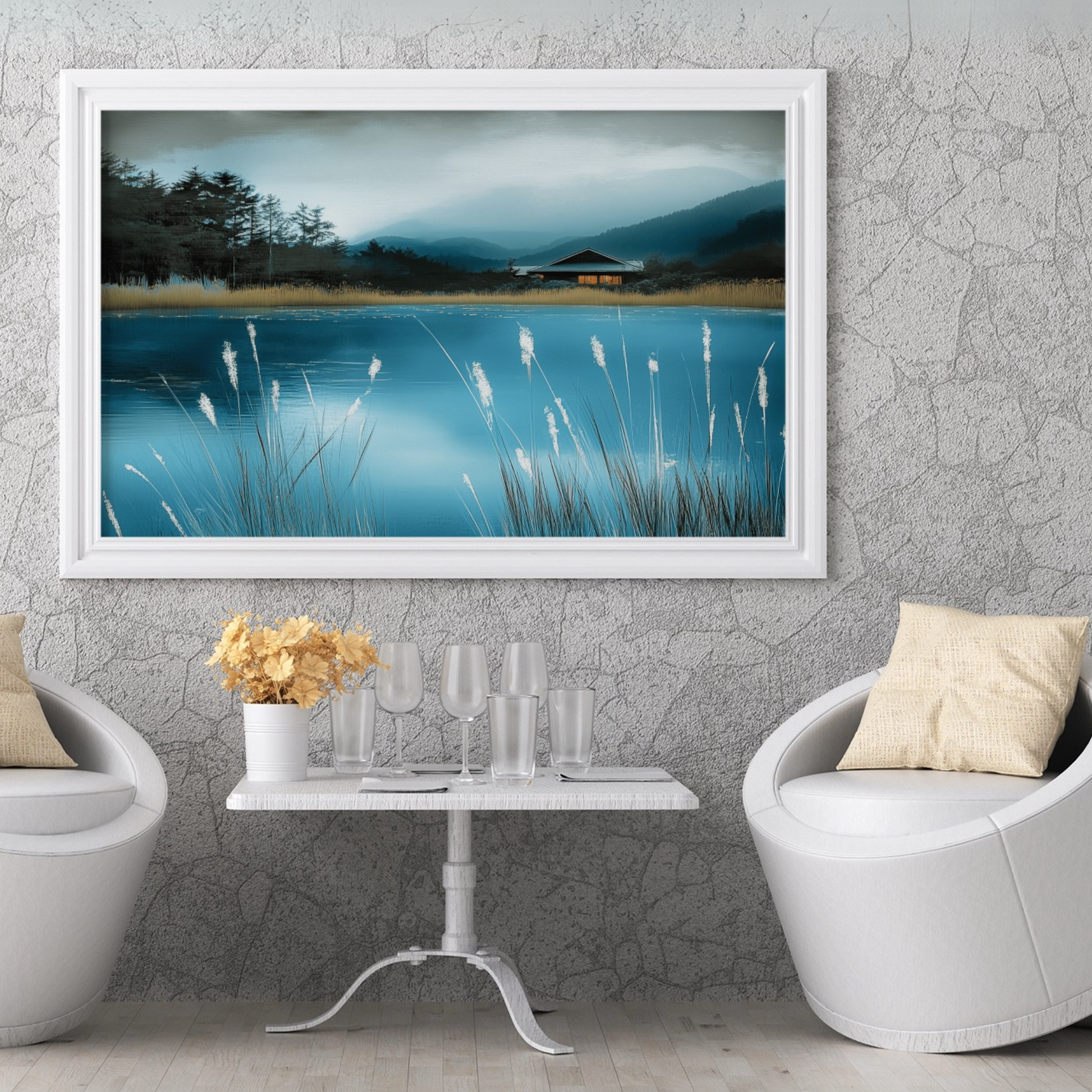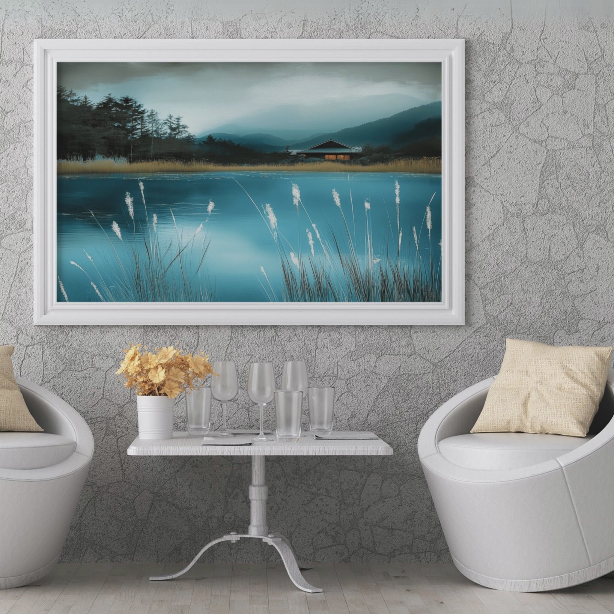 Immerse yourself in the serene beauty of this sophisticated wall art piece. The "Ethereal Blue Pond" captures a moment of pure tranquility, where gentle illumination bathes the scene in a soft, diffused light. The delicate interplay of light and shadow creates a cozy atmosphere, inviting viewers to pause and reflect. This artwork is perfect for those seeking to bring a touch of calm elegance to their living spaces. The mesmerizing blue hues of the pond take center stage, their depth and clarity expertly rendered to draw the eye. Surrounding elements are subtly portrayed, enhancing the pond's allure without overshadowing it. This piece is versatile enough to complement various interior styles, from modern minimalist to classic decor. Whether displayed in a living room, bedroom, or office, this wall art promises to be a captivating focal point that soothes and inspires.