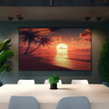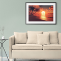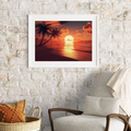 Immerse yourself in the breathtaking beauty of a tropical paradise with this photo-realistic wall art. A massive, vibrant orange sun dominates the horizon, casting its warm glow across an expansive, seemingly endless beach. The golden light bathes the landscape, creating a mesmerizing interplay of light and shadow. In the foreground, a few perfectly silhouetted palm trees stand sentinel, their graceful forms adding depth and tropical flair to the scene. This stunning artwork captures the magic of a perfect beach sunset in exquisite detail. The long stretch of sand invites the viewer's eye to wander, evoking a sense of peace and limitless possibility. The rich, warm colors of the sky reflect off the wet sand, creating a mirror-like effect that enhances the scene's drama and beauty. Whether displayed in a living room, bedroom, or office, this piece brings the serenity and romance of a tropical getaway into any space, serving as a daily escape to a world of natural wonder and tranquility.