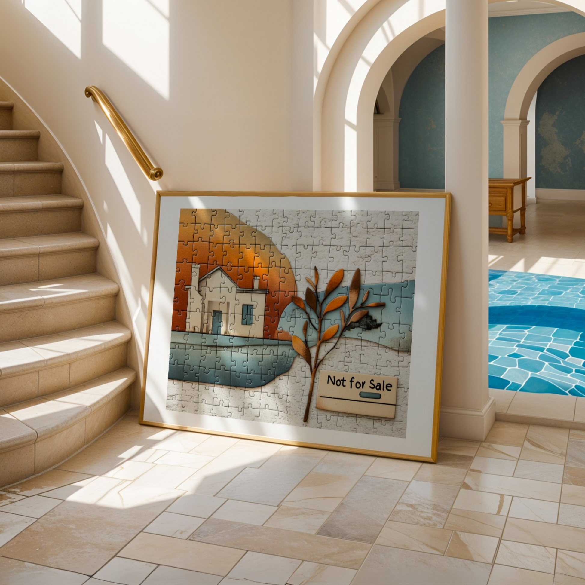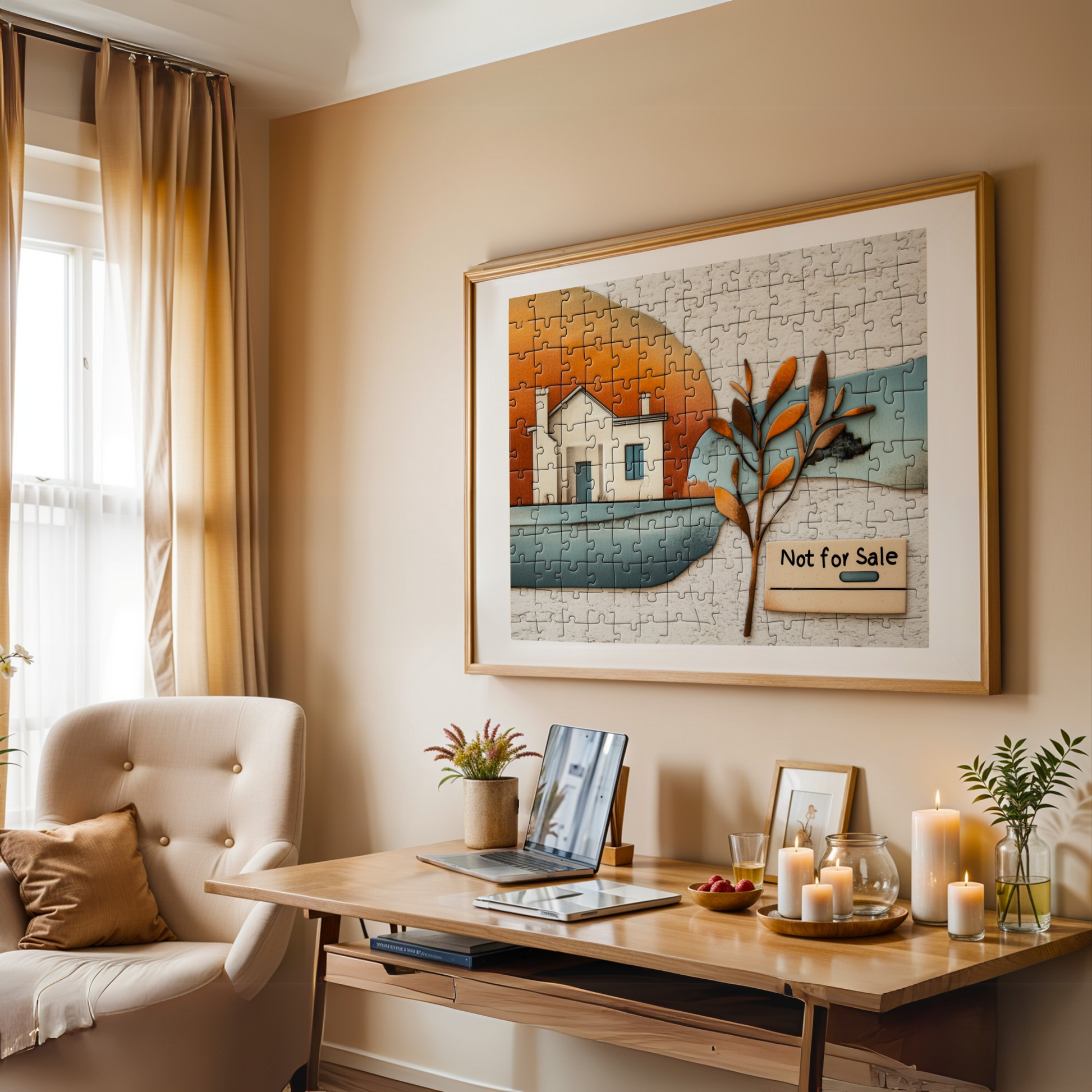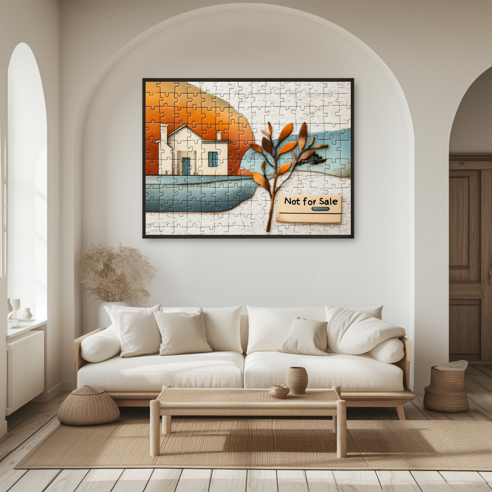 This thought-provoking jigsaw puzzle wall art combines powerful imagery with emotional depth. One part of the puzzle reveals a warm and inviting home, symbolizing comfort, family, and dreams. The other part unveils a bold "Not for Sale" sign, representing protection, identity, and the priceless value of what truly matters. Together, these elements craft a meaningful visual statement that speaks to the importance of preserving what we hold dear. Perfect for modern or rustic interiors, this artwork makes a striking centerpiece in living rooms, offices, or entryways. Its symbolism resonates with themes of home ownership, resistance, and personal values, making it both decorative and deeply meaningful. The clean composition, soft tones, and impactful message offer a compelling blend of art and narrative.