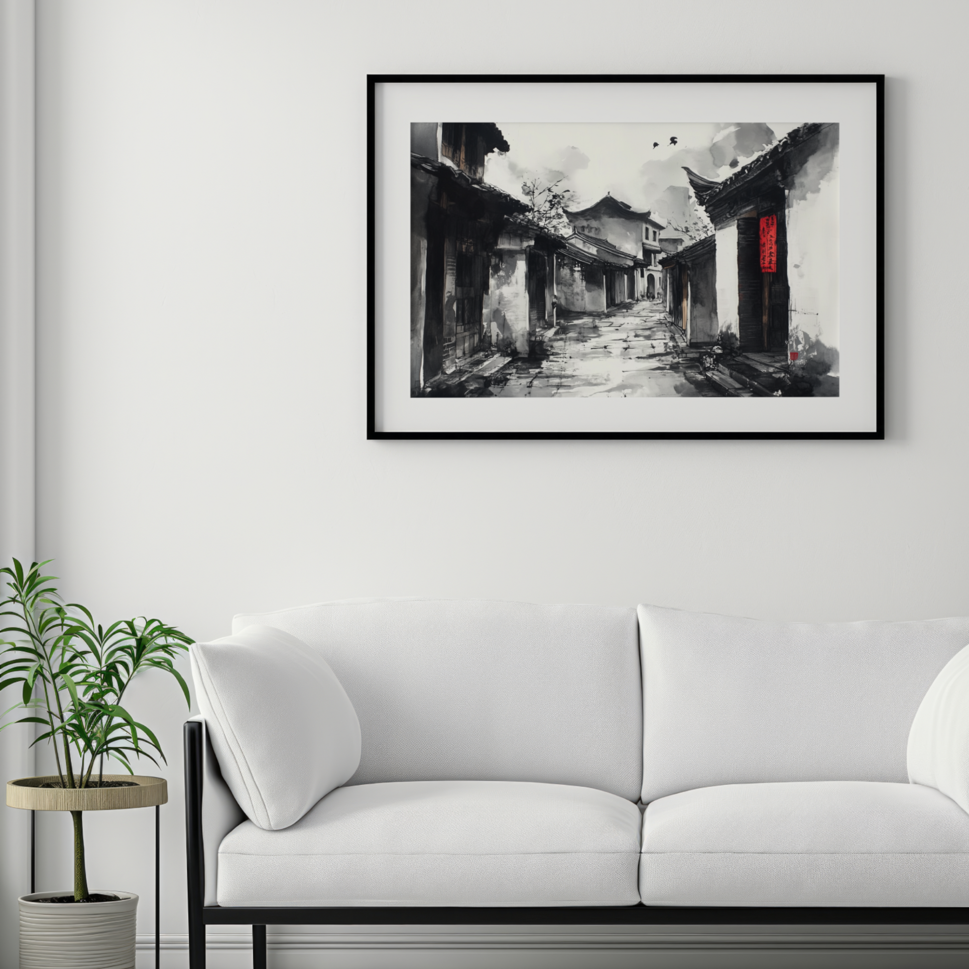 Kuanzhai Alley Wall Art Ink Painting Chengdu Historic Courtyard Chinese Style. High Resolution Digital Download 300 DPI.