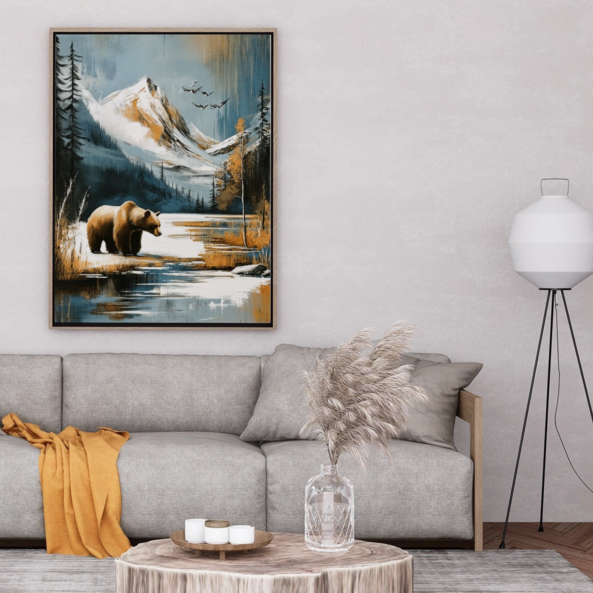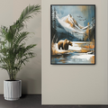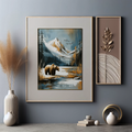 Immerse yourself in the raw beauty of nature with this stunning winter landscape wall art. A magnificent brown bear takes center stage, standing near the edge of a serene lake that reflects the towering, snow-capped mountains beyond. The scene is framed by a forest of evergreen pine trees, their branches dusted with snow, creating a perfect winter wonderland. Above, birds soar through the crisp sky, adding movement and life to this tranquil scene. This captivating artwork brings the essence of the great outdoors into your living space. The intricate details capture the textures of the bear's fur, the smooth surface of the lake, and the rugged terrain of the mountains with remarkable precision. The cool color palette of whites, blues, and earth tones evokes the chill of a winter day, while the presence of wildlife adds warmth and connection to the natural world. Perfect for nature enthusiasts, outdoor adventurers, or anyone seeking to bring a touch of wilderness into their home or office, this piece serves as a daily reminder of the majesty and serenity found in untamed landscapes.