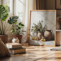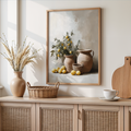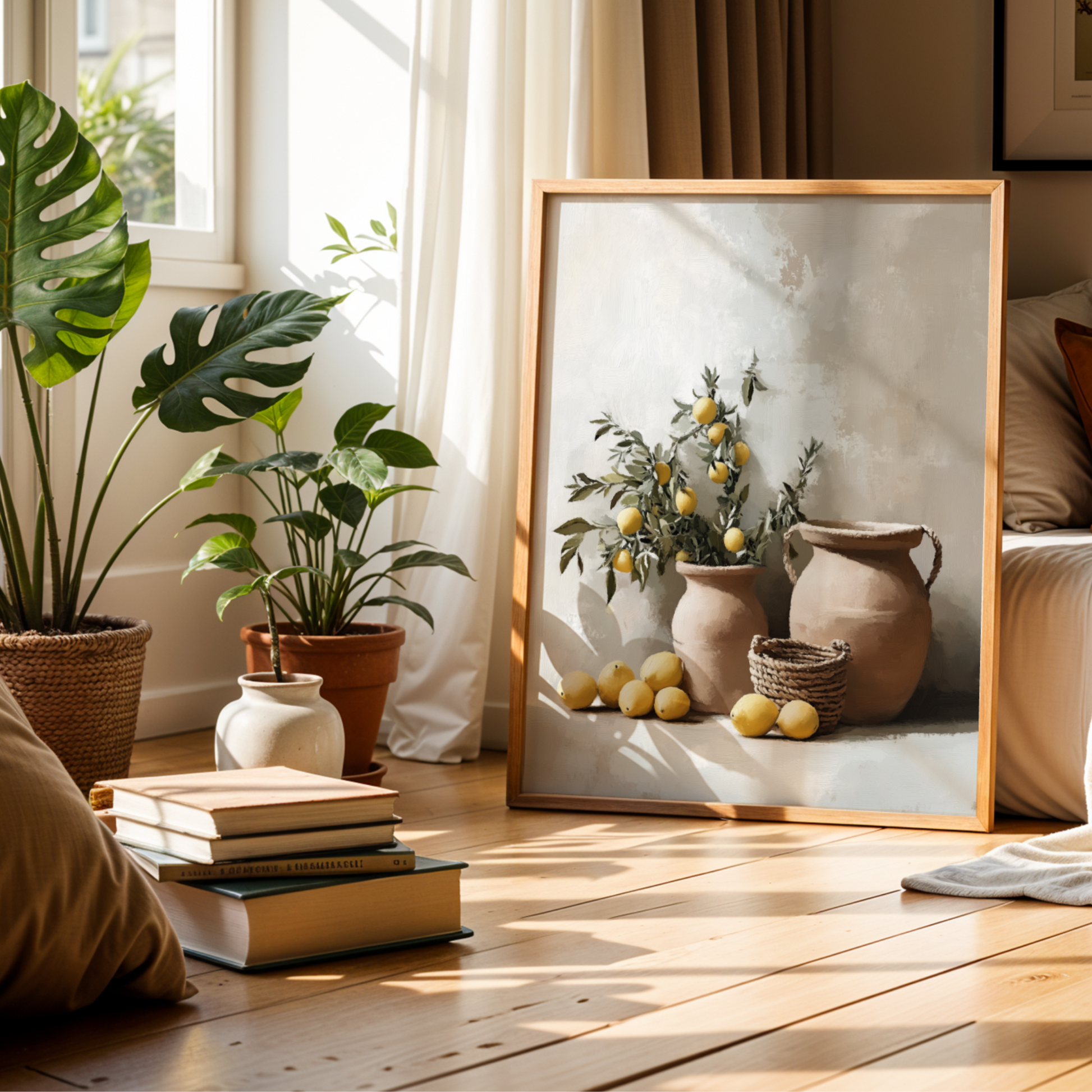 Bring the warmth and authenticity of Mediterranean living into your home with this photorealistic oil painting inspired by a classic interior display. The scene features a textured plaster wall in earthy terracotta and olive hues, beautifully illuminated by soft, museum-style lighting that highlights the arrangement without casting harsh shadows. Artfully positioned on the display are natural elements—lemons with leaves, woven baskets, and rustic ceramic pieces—that evoke the timeless charm of Italian home life. The composition’s serene ambiance and organic materials create a tranquil, inviting atmosphere reminiscent of sun-drenched Mediterranean interiors. Executed with meticulous detail, this artwork captures the essence of traditional Mediterranean design, blending natural textures and warm colors for an authentic, lived-in feel. The use of terracotta, olive tones, and handcrafted objects reflects the region’s rich heritage and relaxed lifestyle, making this piece a perfect accent for kitchens, dining rooms, or any space seeking a touch of rustic elegance and European flair