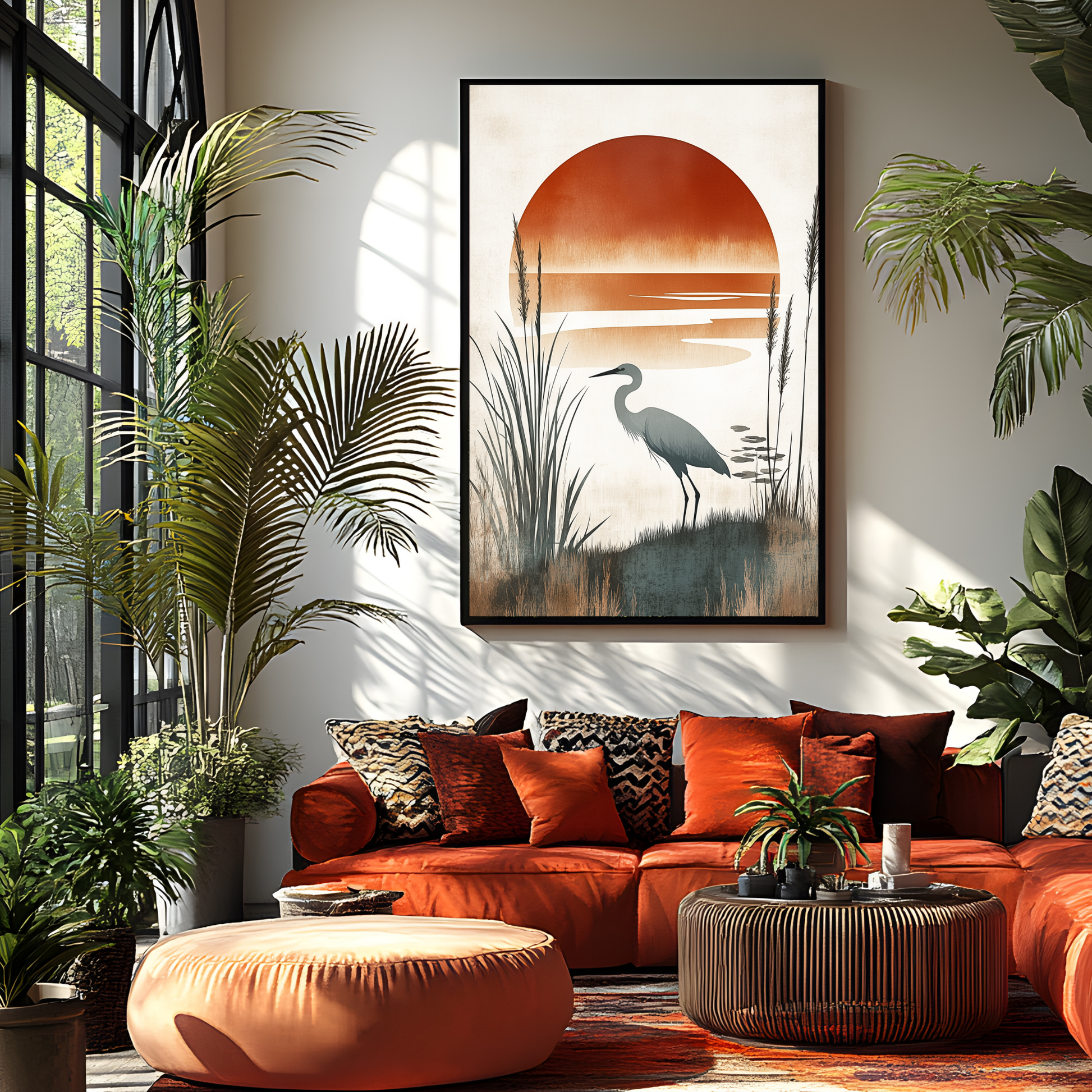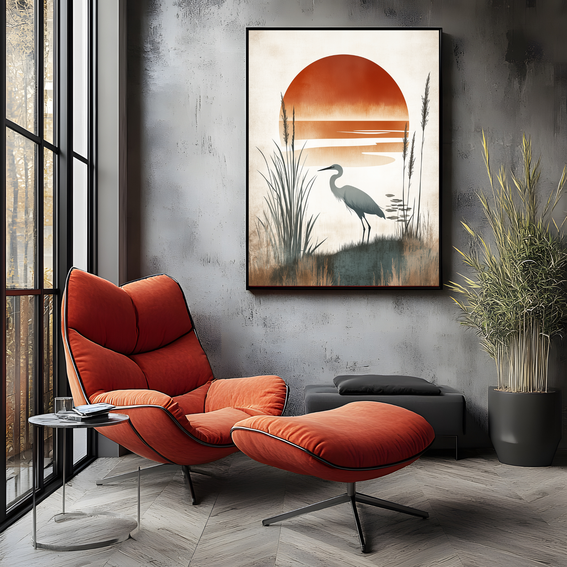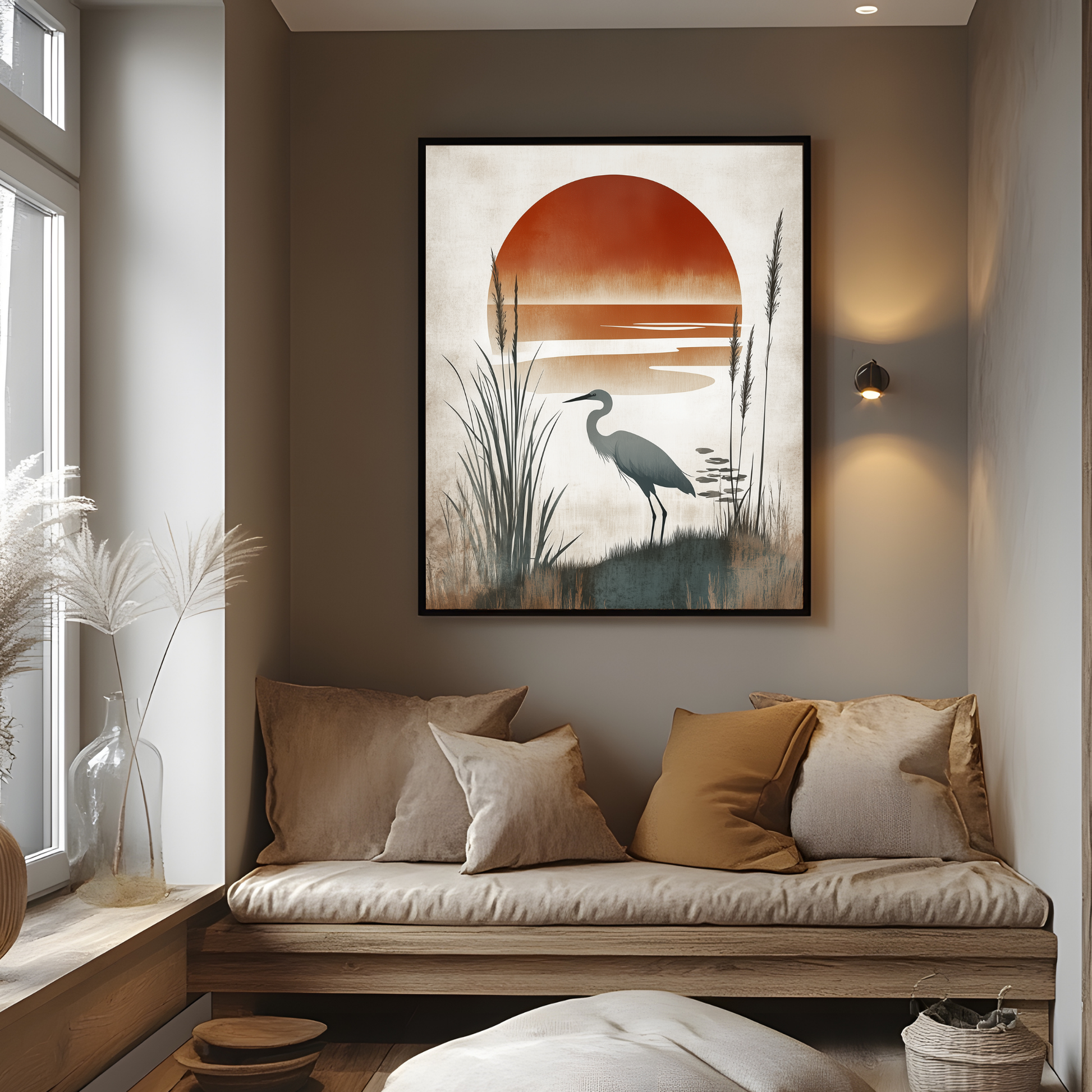 Transform your space with this captivating minimalist heron illustration wall art print. The elegant bird is depicted walking along the shore, rendered in simple shapes and clean lines that capture its graceful essence. Muted earth tones create a soothing palette, perfectly complementing the organic forms of the abstract landscape. Grasses, reeds, water lilies, and a river bank are artfully suggested, inviting viewers to immerse themselves in this serene natural scene. This graphic art seamlessly blends minimalist design with nature-inspired elements, making it a versatile addition to any interior. The understated elegance of the piece allows it to enhance a variety of decor styles, from modern and contemporary to rustic and coastal. Whether displayed in a living room, bedroom, or office, this heron illustration brings a touch of tranquility and artistic sophistication to your walls, creating a focal point that sparks conversation and contemplation.