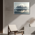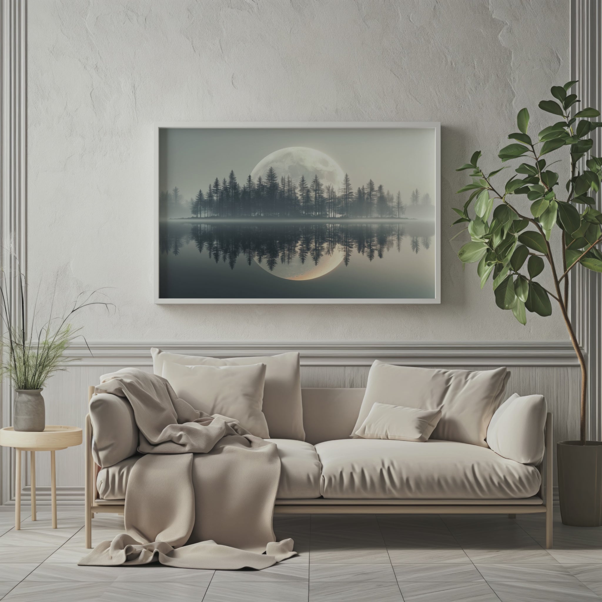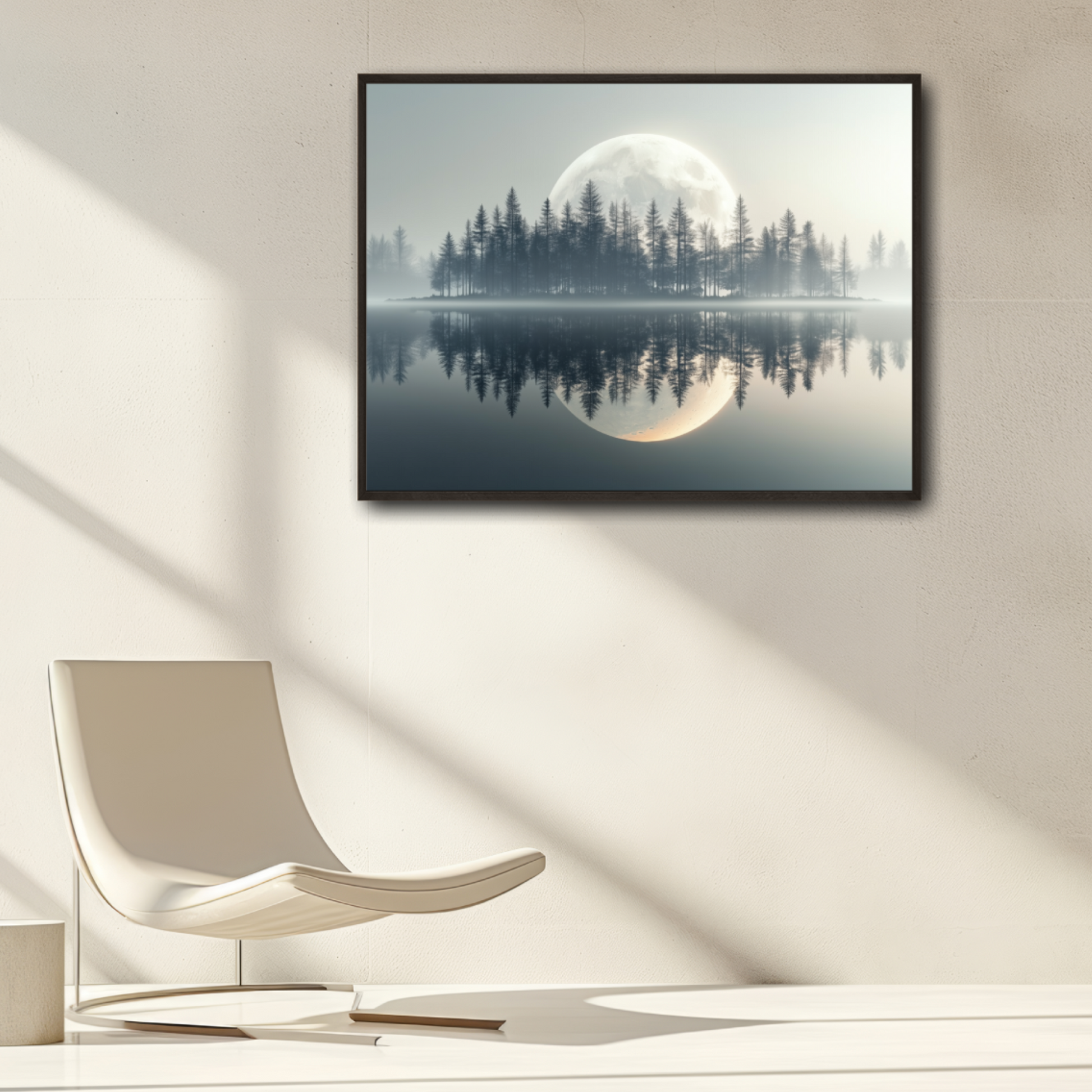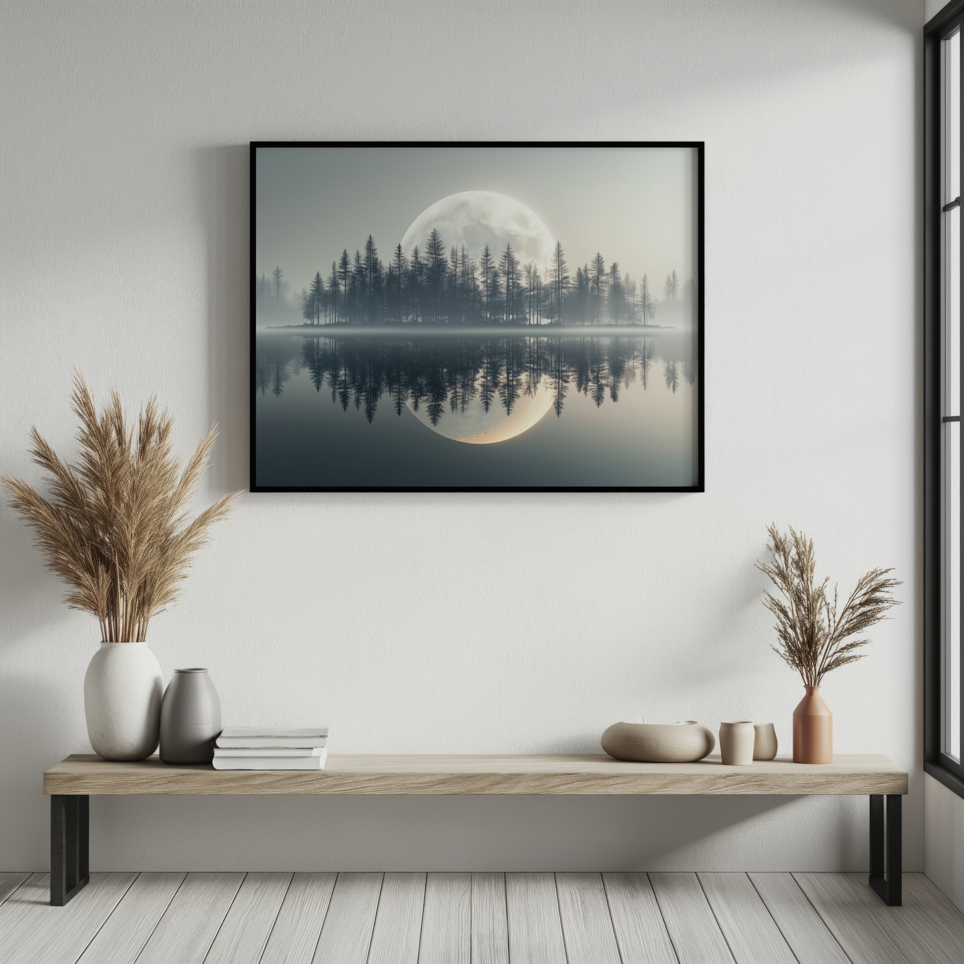 Transform your space with the serene beauty of this moonlit lake wall art, featuring a perfectly still lake that mirrors the full moon above. Surrounded by a tranquil forest of pine trees and gentle mist, the scene captures the essence of a peaceful night in nature. The reflection of the moon across the water, often called a “glitter path” or “moonpath,” adds a magical touch, while the soft, atmospheric lighting and cool tones evoke a calming, dreamlike mood. Rendered in a style that highlights the subtle interplay of light and shadow, this artwork brings a sense of quiet wonder and natural elegance to any room. Ideal for bedrooms, living spaces, or meditation areas, it invites viewers to pause and appreciate the timeless beauty of moonlight, mist, and still water creating a perfect retreat from the everyday.