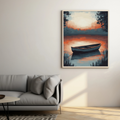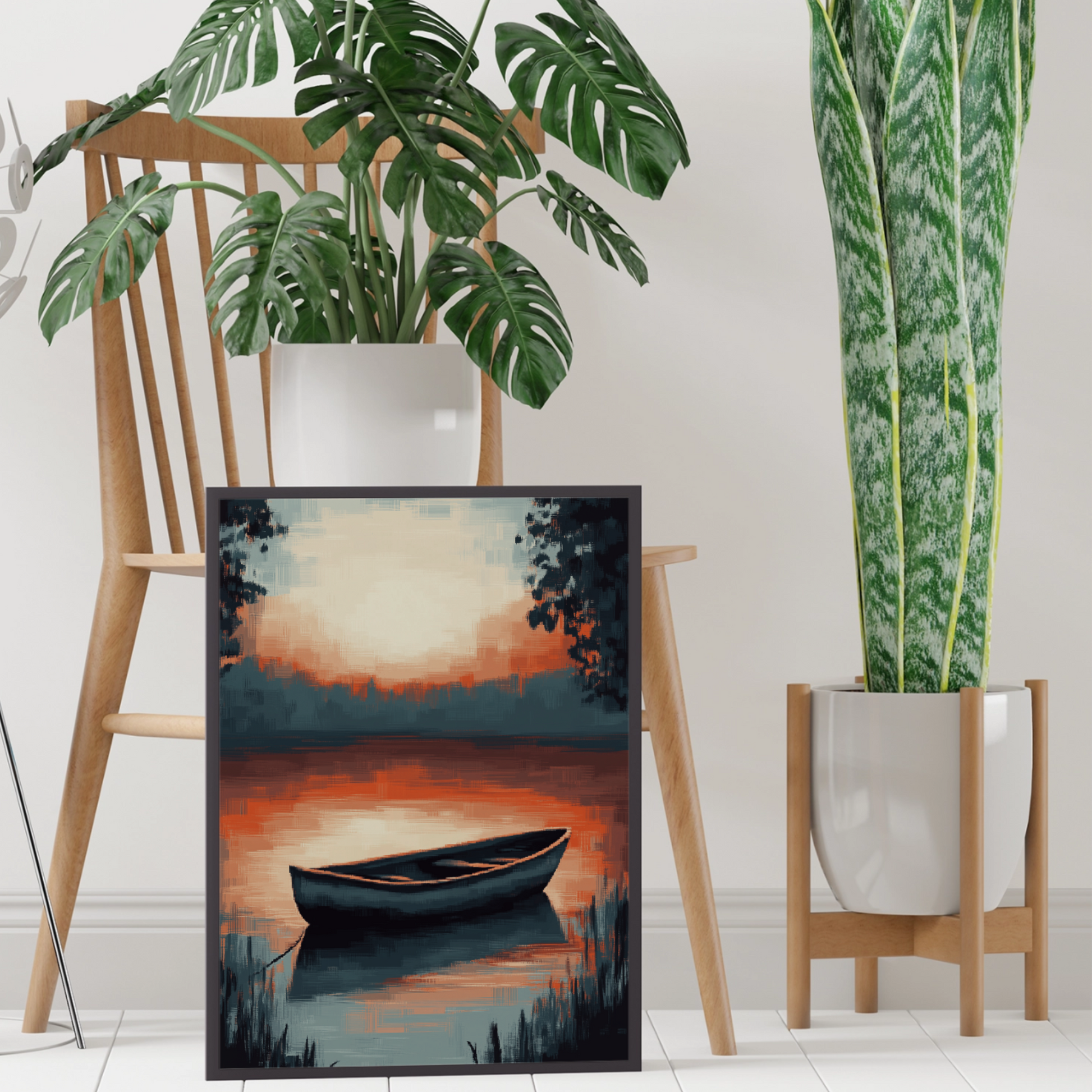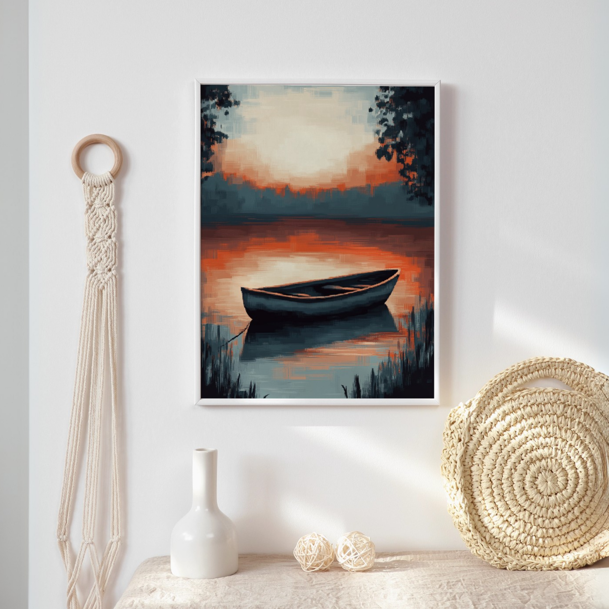 Pixelated Serenity: Retro Sunset Lake Boat Reflection Canvas Art. High Resolution Digital Download 300 DPI.