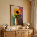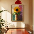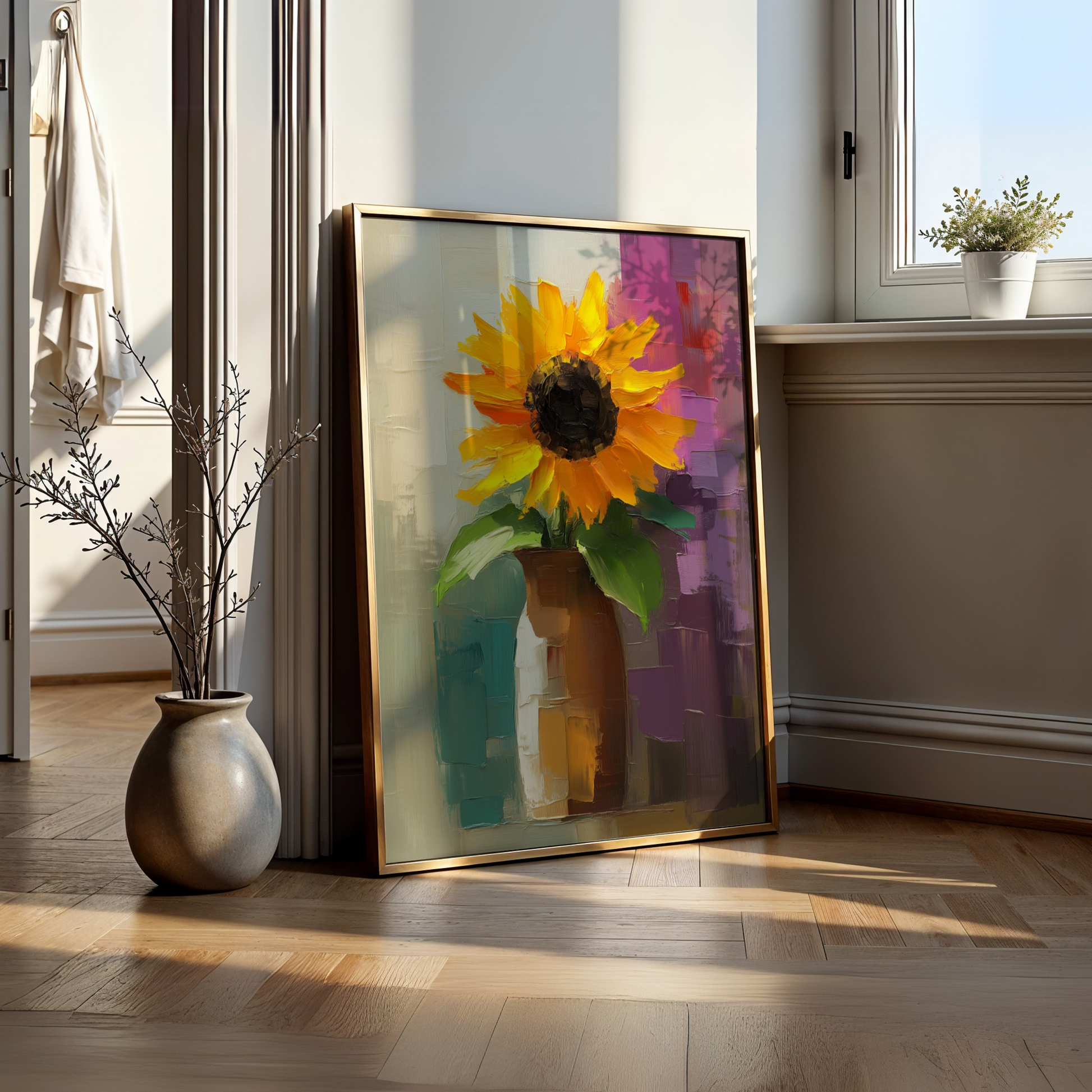 Brighten your home with this stunning wall art featuring a sunflower arranged in a classic clay vase, painted in a lively post-impressionist style. Expressive brushstrokes and a rich impasto texture bring the sunflower to life, capturing both its vibrant energy and the tactile beauty of thick, layered paint. The composition stands out against a colorful, abstract background, creating a striking balance between natural form and artistic freedom. Inspired by the techniques of Van Gogh and other post-impressionists, this high-quality piece infuses any space with warmth, creativity, and timeless elegance. The intricate textures and bold color palette make it a perfect focal point for living rooms, kitchens, or studios, celebrating the enduring charm of sunflowers through masterful artistry.