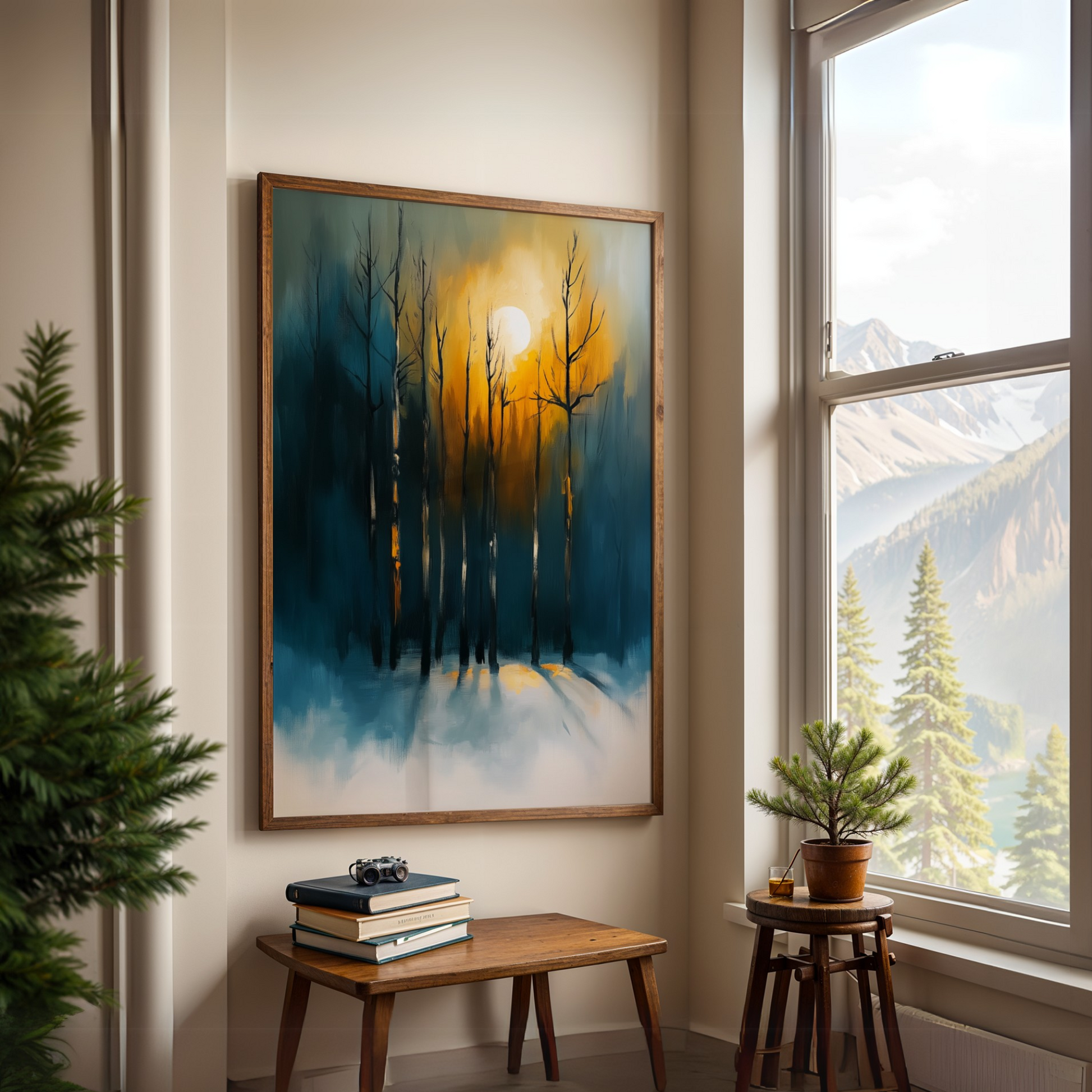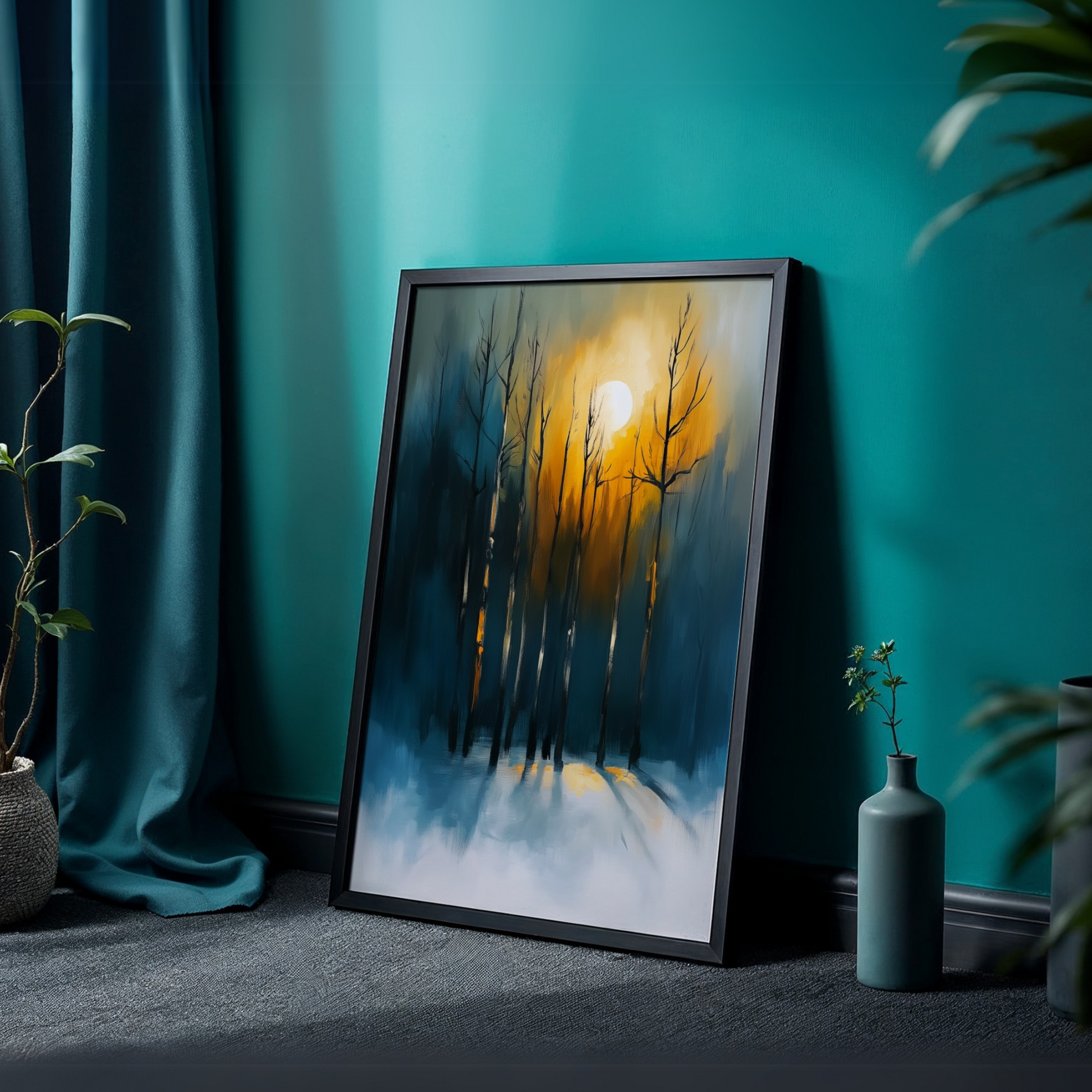 Elevate your décor with this stunning wall art print, showcasing a high-quality, realistic painting of trees in a sophisticated dark blue and beige palette. Set against a crisp white background, the artwork is beautifully accented by a glowing moon in the distance, creating a tranquil and elegant atmosphere perfect for any modern living space or bedroom. The meticulous attention to detail and harmonious color scheme make this piece a timeless addition to your art collection. Ideal for those who appreciate nature-inspired themes with a contemporary twist, this painting brings serenity, depth, and a touch of moonlit magic to your home.