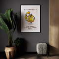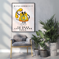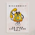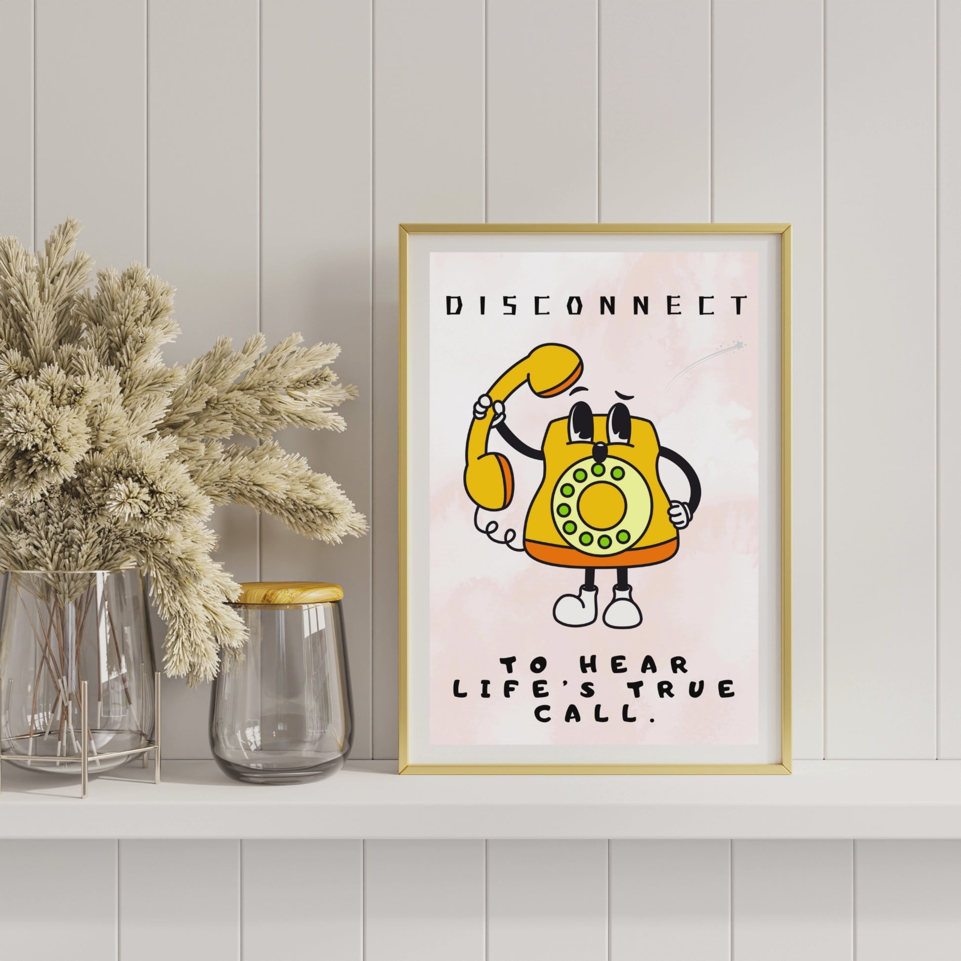 Bring a touch of whimsy and wisdom to your space with this charming retro-inspired wall art print. This elegant painting features a playful yellow cartoon telephone character, complete with expressive eyes and legs, holding its receiver. Set against a soft pink background. This unique piece combines vintage aesthetics with a modern twist, perfect for offices, living rooms, or any area needing a boost of inspiration. Ideal for those who appreciate retro design and motivational art, this print serves as a delightful reminder of the importance of effective communication.