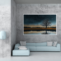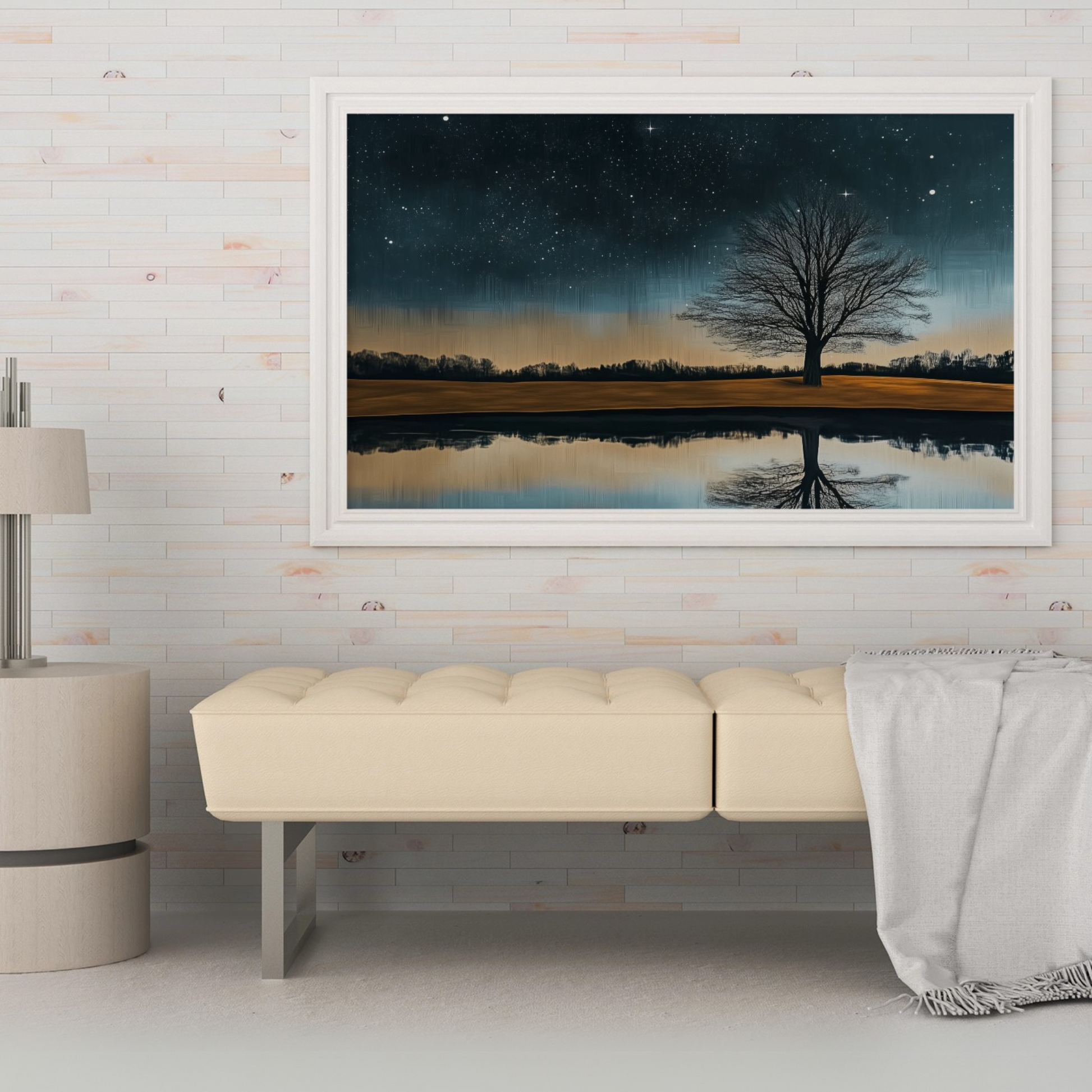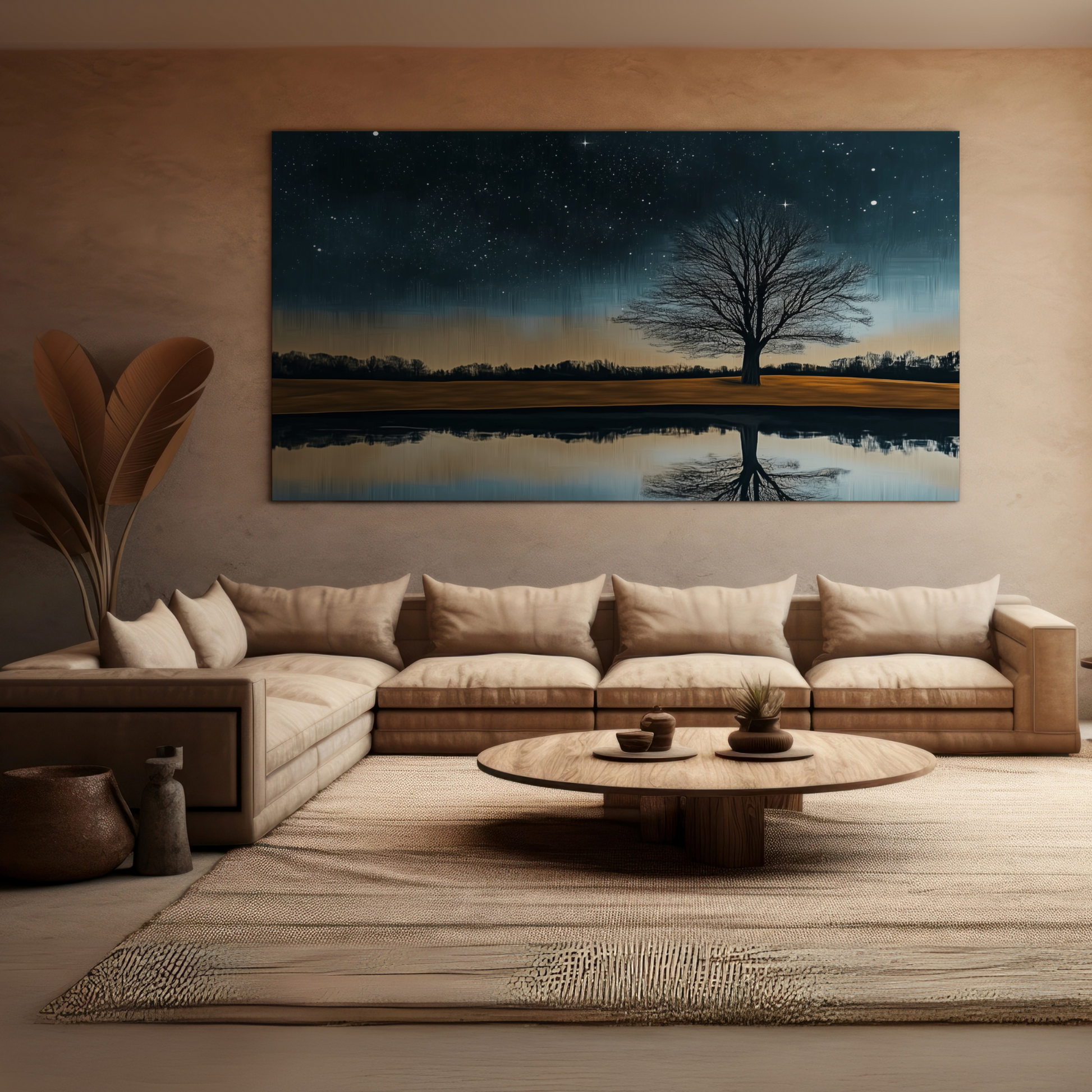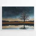 Transform your space with this mesmerizing wall art featuring a captivating nocturnal scene. A solitary bare tree stands sentinel by a tranquil lake, its stark silhouette perfectly mirrored in the still waters below. The dark blue sky above is adorned with a multitude of twinkling stars, creating a celestial canopy that draws the eye and invites contemplation. This piece beautifully captures the serene magic of a quiet night in nature. The contrasting elements in this artwork create a striking visual impact. The yellow ground provides a warm counterpoint to the cool tones of the night sky, while the shadowy forms of distant trees add depth to the composition. The interplay of light and shadow, reflection and reality, makes this piece a fascinating focal point for any room. Whether displayed in a bedroom, living area, or office, this art print brings a touch of natural wonder and nocturnal tranquility to your decor.