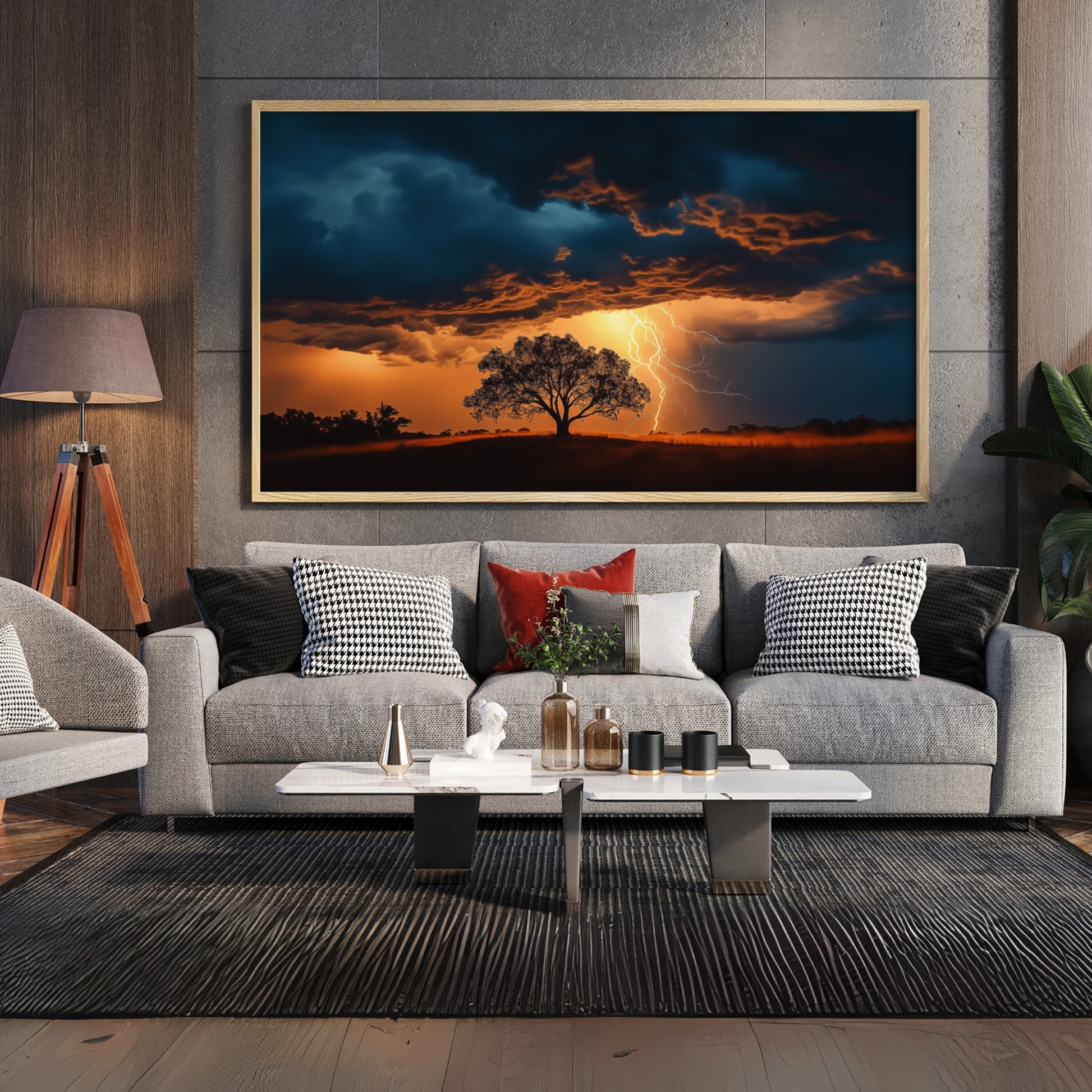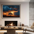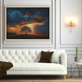 Experience the dramatic beauty of nature with this captivating wall art piece. A solitary tree stands resilient atop a gentle hill, its silhouette stark against a vibrant sunset sky. In the distance, an approaching storm looms, its dark clouds illuminated by flashes of lightning. This artwork masterfully captures the tension between tranquility and impending turbulence, creating a visually striking and emotionally evocative scene. The interplay of warm sunset hues and cool storm tones adds depth and contrast to the composition. The lone tree, a symbol of strength and solitude, anchors the piece, while the distant lightning promises excitement and change. Perfect for nature enthusiasts and those who appreciate the raw beauty of weather phenomena, this art print brings a touch of drama and wonder to any room. It serves as a powerful reminder of nature's ever-changing moods and the quiet strength found in solitude.