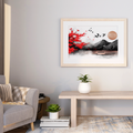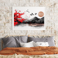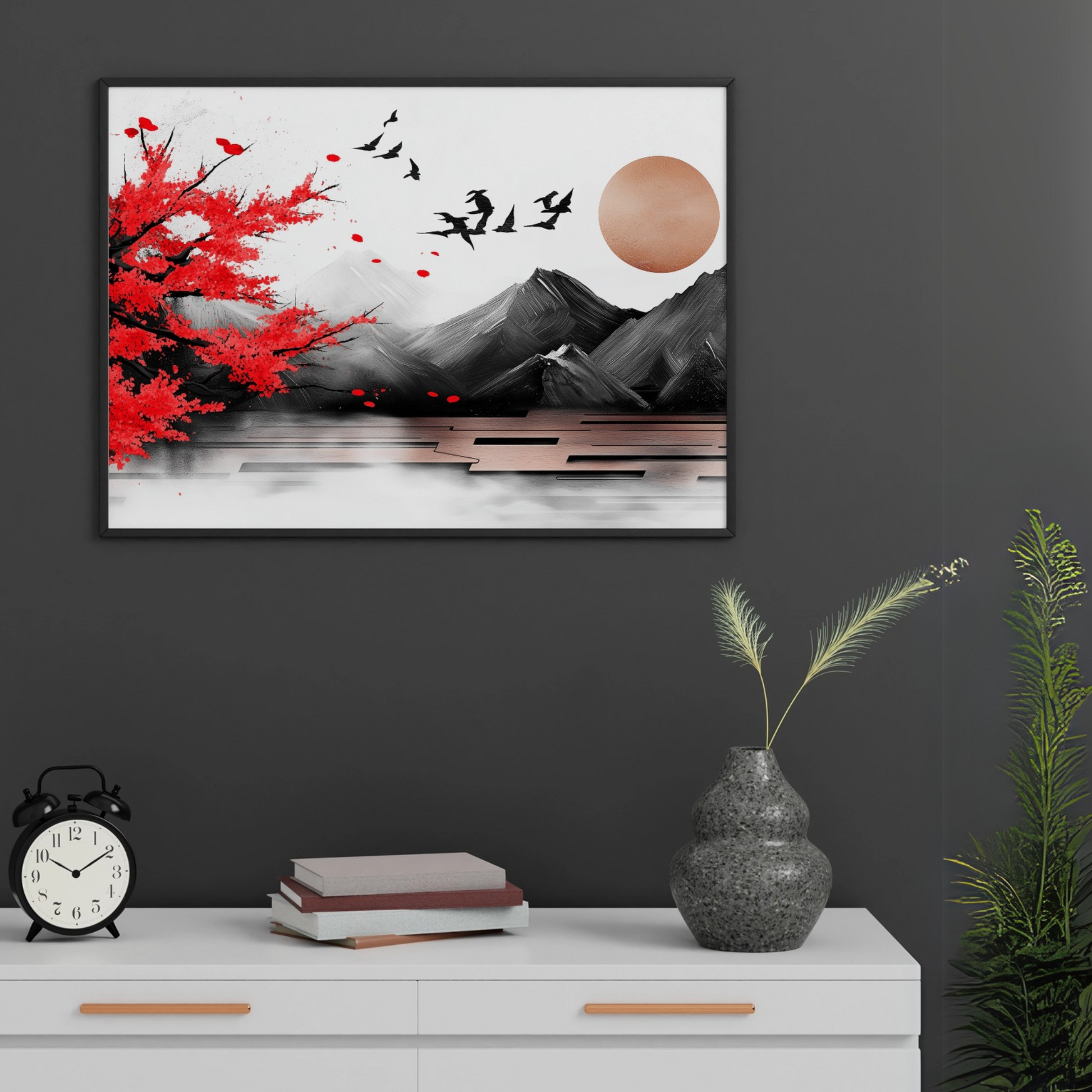 Immerse yourself in the breathtaking beauty of this captivating landscape wall art. A majestic orange sun rises over serene gray mountains, casting a warm glow across the scene. The focal point is a vibrant red cherry blossom tree, its delicate petals dancing in the air, creating a stunning contrast against the muted background. Black birds soar gracefully through the sky, adding movement and depth to the composition. A wooden platform in the foreground grounds the piece, inviting viewers to step into this mesmerizing world. This art masterfully balances bold colors with subtle tones, creating a visually striking effect that will command attention in any room. The interplay of red, black, and gray hues evokes a sense of drama and tranquility simultaneously. Perfect for those who appreciate Asian-inspired art or seek to add a touch of nature's beauty to their space, this landscape piece will transform your walls into a window to a serene yet powerful scene. Whether displayed in a living room, bedroom, or office, this artwork promises to be a conversation starter and a daily source of inspiration.