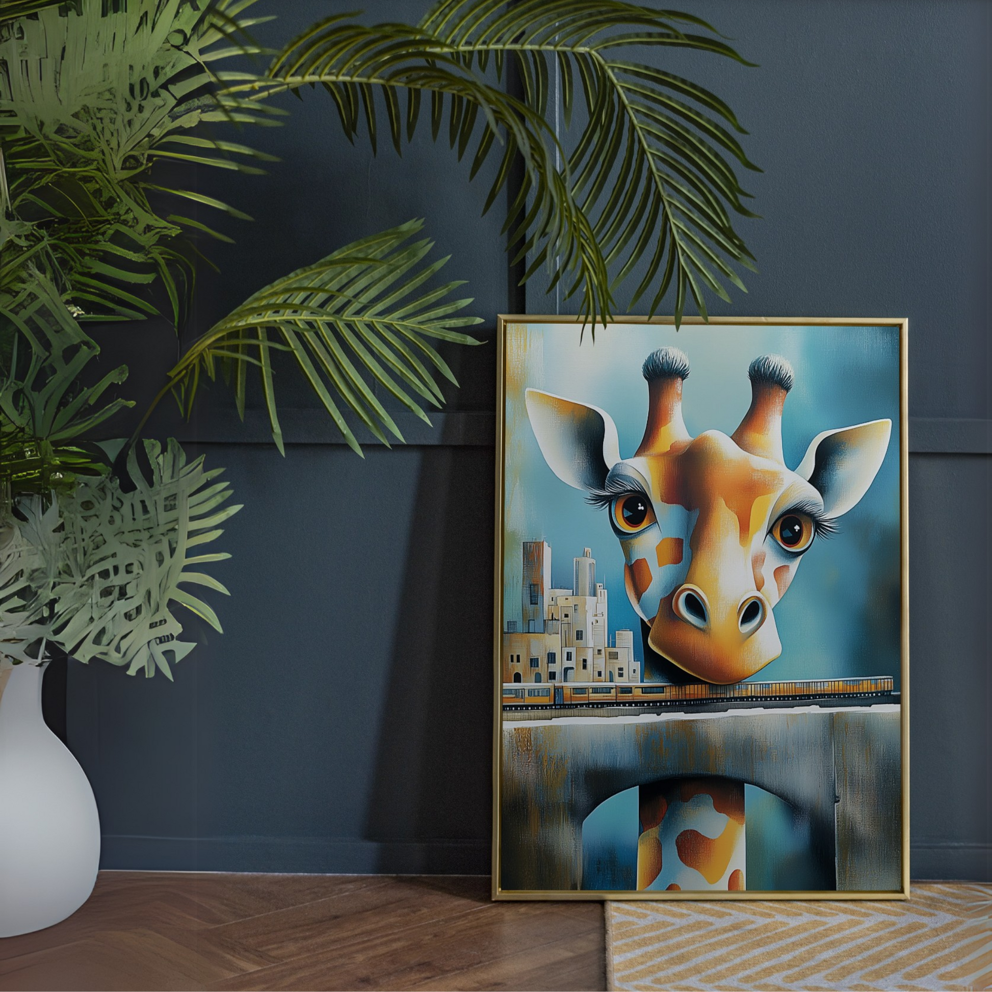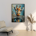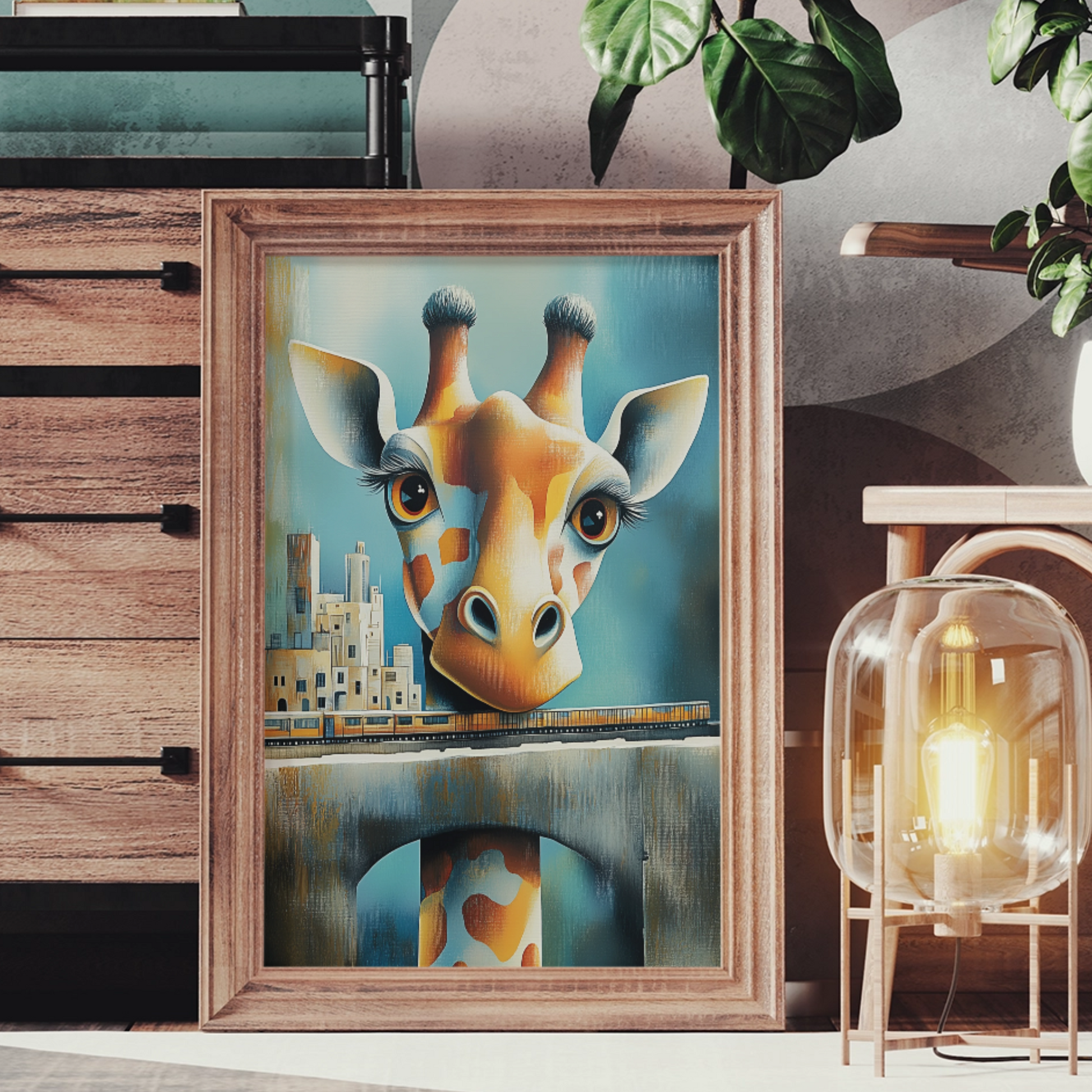 Transform your space with this captivating watercolor poster that blends cubism, Greek-inspired colors, and surrealism into a truly unique work of art. This elegant painting showcases a mesmerizing robot giraffe, its elongated neck stretching towards the sky, while its head houses an entire bustling cityscape complete with a winding railway. This striking poster seamlessly merges the natural world with futuristic elements, as the mechanical giraffe serves as a canvas for urban life. The intricate details of the city nestled within the giraffe's head invite viewers to explore the miniature world, discovering new elements with each glance. Perfect for art enthusiasts, lovers of surrealism, or anyone looking to add a conversation piece to their decor, this watercolor poster brings a touch of whimsy and sophistication to any room. Its unique blend of styles and themes makes it a versatile addition to modern, eclectic, or artistic interiors.