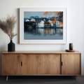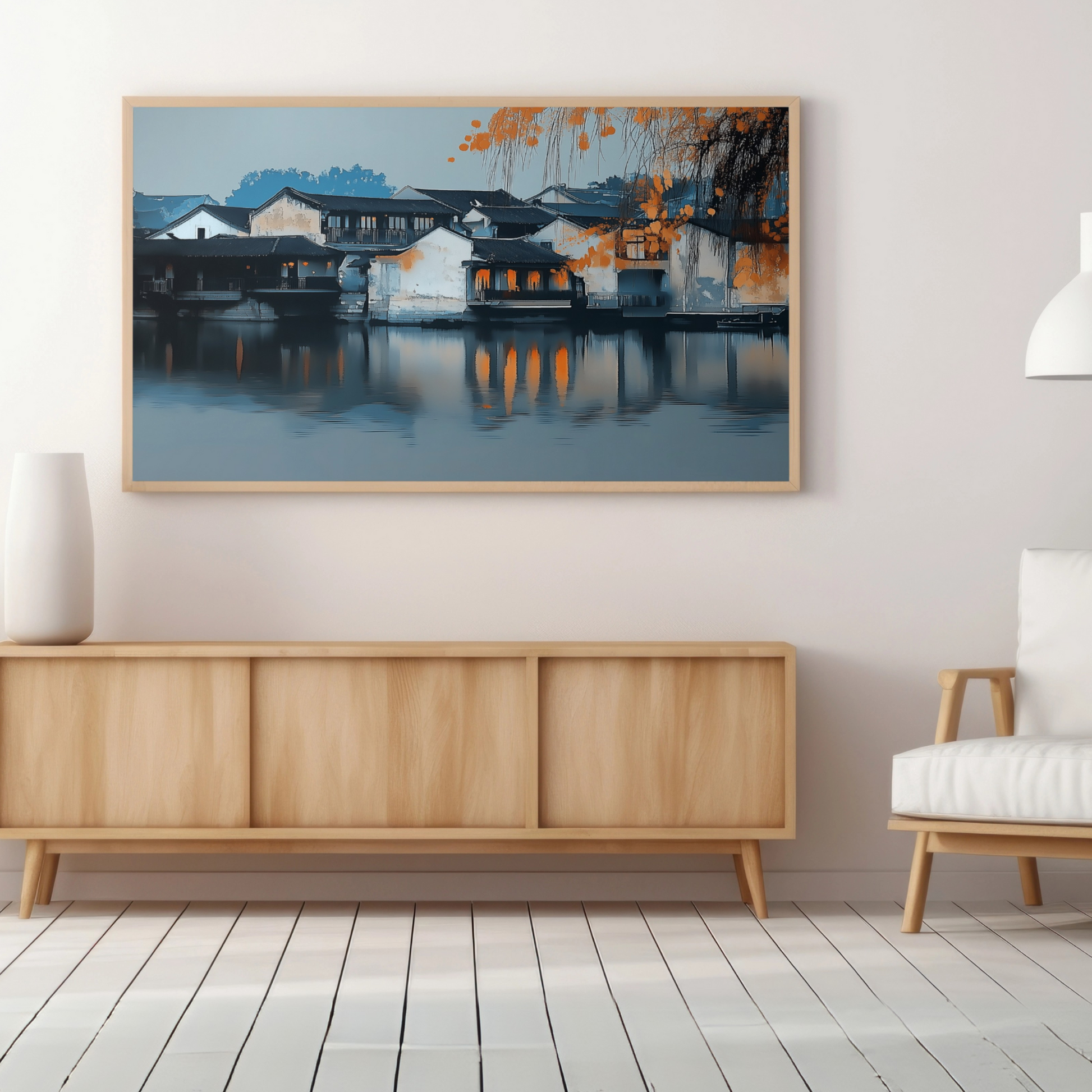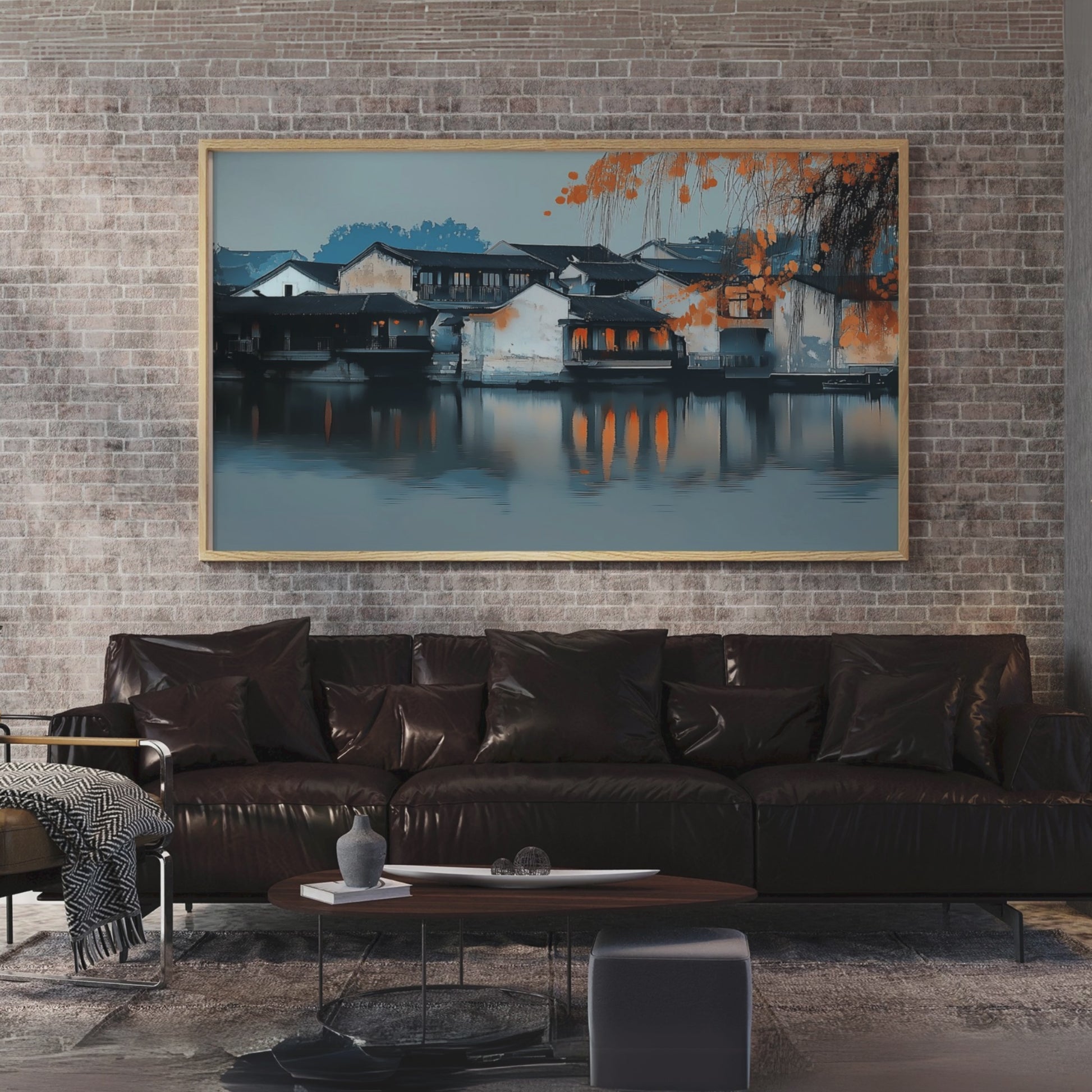 Immerse yourself in the rich heritage of China's historic water towns with this captivating wall art. This stunning piece showcases the intricate network of canals, bridges, and traditional architecture that have defined these unique communities for centuries. The artwork captures the essence of a lifestyle deeply intertwined with water, where ancient traditions of fishing and water transportation continue to thrive. This evocative print brings the serene beauty of water town culture into your home. Delicate brushstrokes depict the interplay of light and shadow on tranquil waterways, while meticulously rendered details of time-worn stone bridges and weathered wooden boats transport viewers to a bygone era. Perfect for those who appreciate cultural heritage and scenic landscapes, this art piece adds a touch of timeless elegance and Eastern charm to any room, inviting contemplation of a way of life shaped by water for over a millennium.
