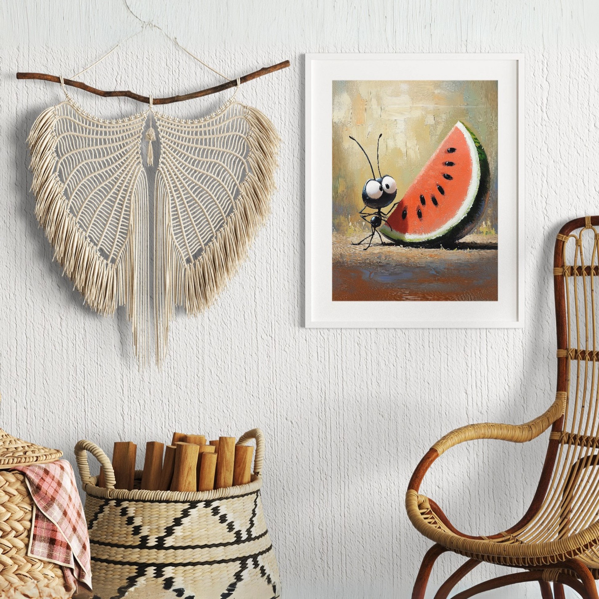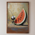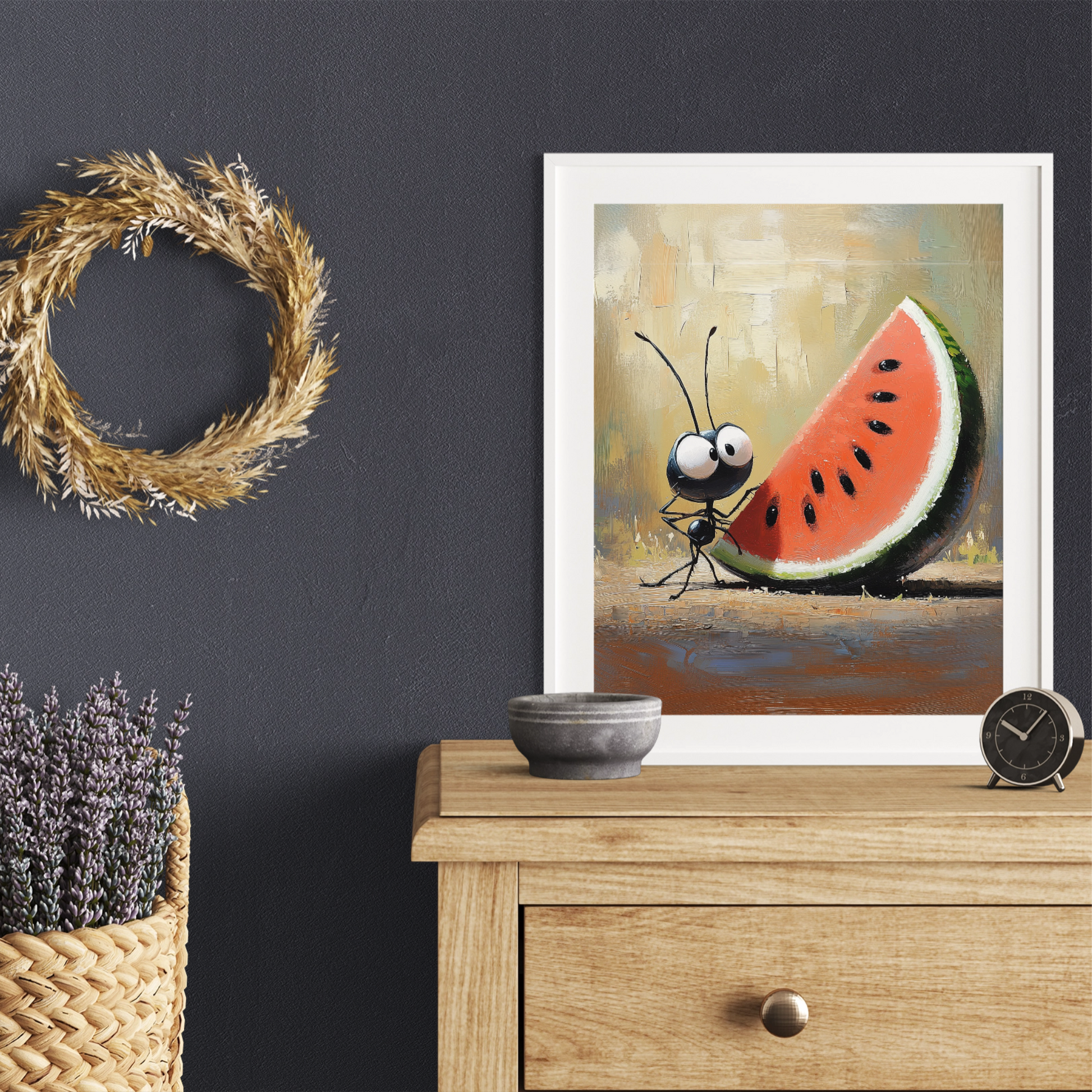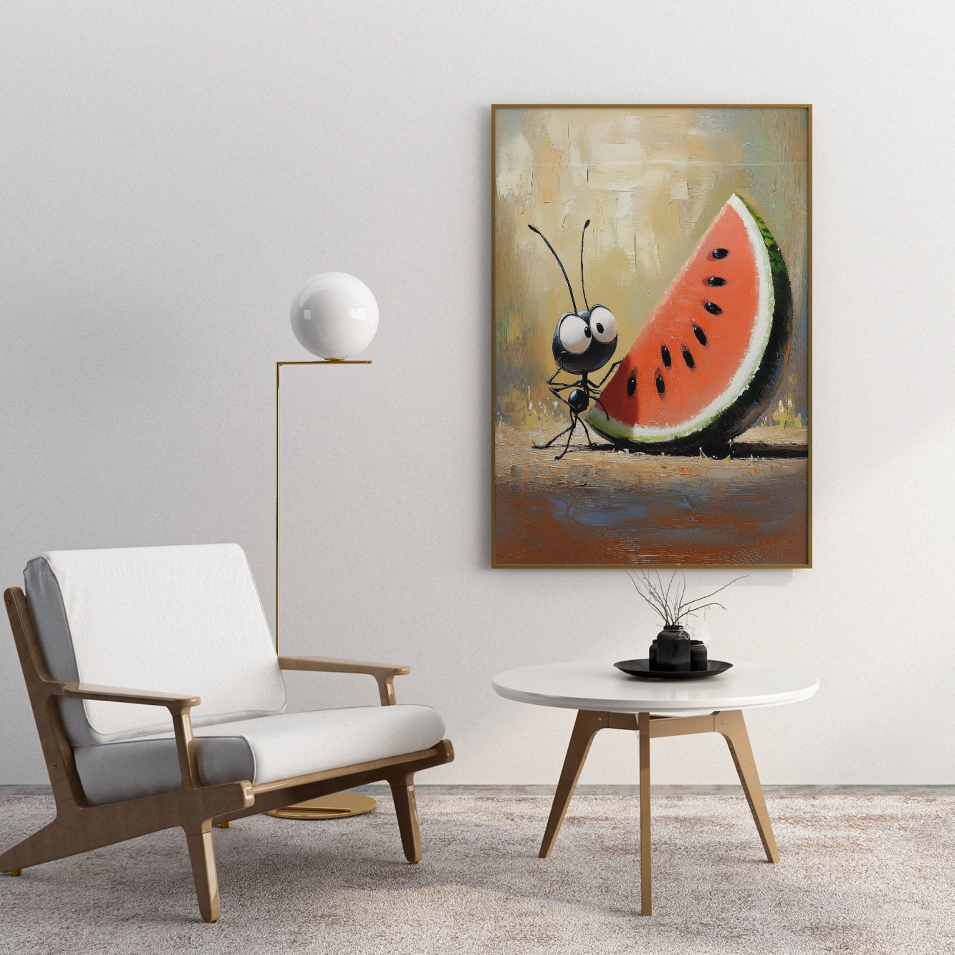 Discover the charm of unexpected encounters with our captivating oil painting, "Tiny Explorer's Delight." This whimsical piece showcases a delightful scene that's sure to bring a smile to your face and add a touch of wonder to any room. The painting depicts a cute, intricately detailed ant encountering an enormous slice of juicy watermelon. The ant's expression of shock and amazement is masterfully rendered, creating an endearing and relatable character. The contrast between the tiny ant and the colossal fruit slice adds a surreal and humorous element to the artwork. The elegant oil painting technique brings depth and richness to the scene, while the subject matter keeps it light-hearted and fun. It's an ideal blend of fine art and playful imagery that appeals to both adults and children alike. Bring a touch of wonder and a splash of summer to your walls with this delightful oil painting