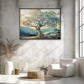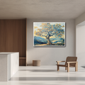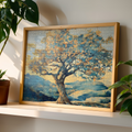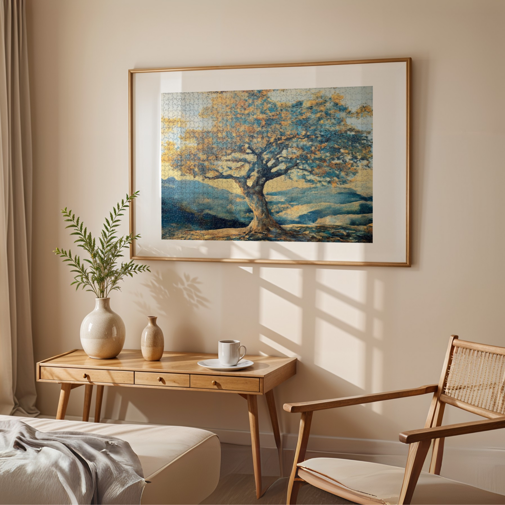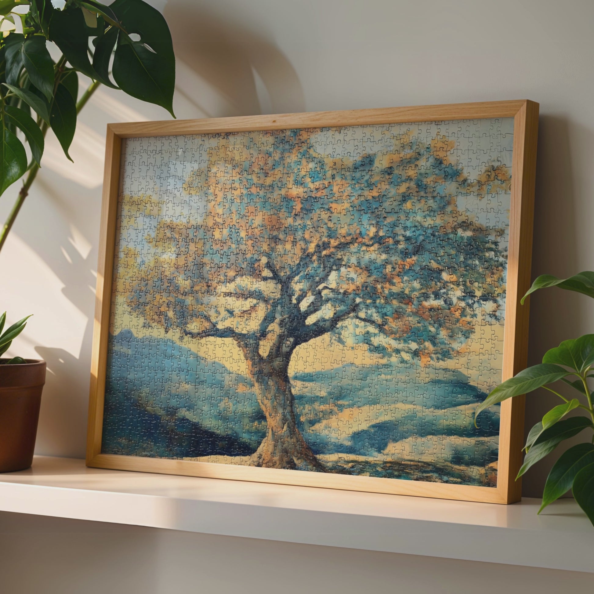 This symbolic wall art features a beautifully crafted tree puzzle set against a serene outdoor landscape, representing the passage of time and the intricate web of interconnectedness. The design harmonizes cozy tones of blue, beige, and yellow, blending nostalgic warmth with contemporary aesthetics. Each puzzle piece subtly aligns with natural elements in the background, drawing viewers into a story that celebrates both memory and connection. Perfect for living spaces, offices, or meditation rooms, this artwork invites calm reflection and emotional resonance. Its balanced color palette and thought-provoking design make it an ideal centerpiece for any room that values meaning and tranquility in its decor.