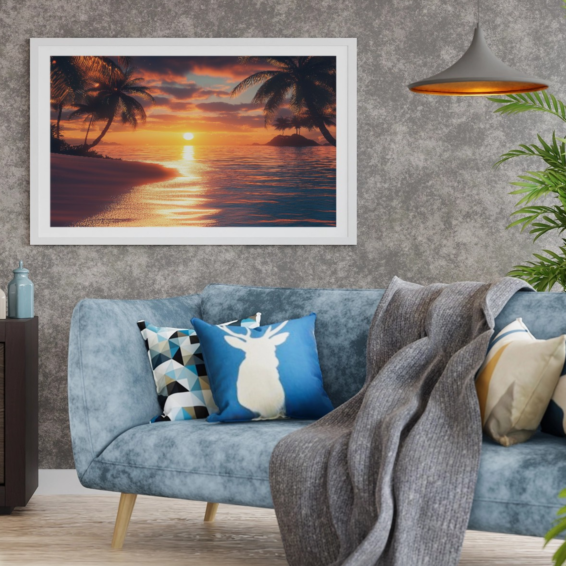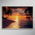 Transport yourself to a breathtaking island getaway with this stunning wall art piece. This hyper-realistic canvas captures the essence of a tropical paradise at the magical moment of sunset. Golden light bathes the scene, illuminating a pristine beach flanked by majestic palm trees swaying gently in the ocean breeze. The vivid colors of the sky reflect off the calm waters, creating a mesmerizing interplay of warm hues that invite viewers to lose themselves in the serene beauty of this idyllic coastal landscape. Perfect for those dreaming of far-off shores or seeking to bring a touch of paradise into their home, this artwork offers an escape to tranquility. The meticulous attention to detail in every aspect - from the texture of the sand to the individual fronds of the palm trees - creates an immersive experience that transports viewers directly to this sun-kissed beach. Whether displayed in a living room, bedroom, or office, this piece serves as a window to a world of relaxation and natural beauty, inspiring a sense of calm and wanderlust in equal measure.