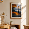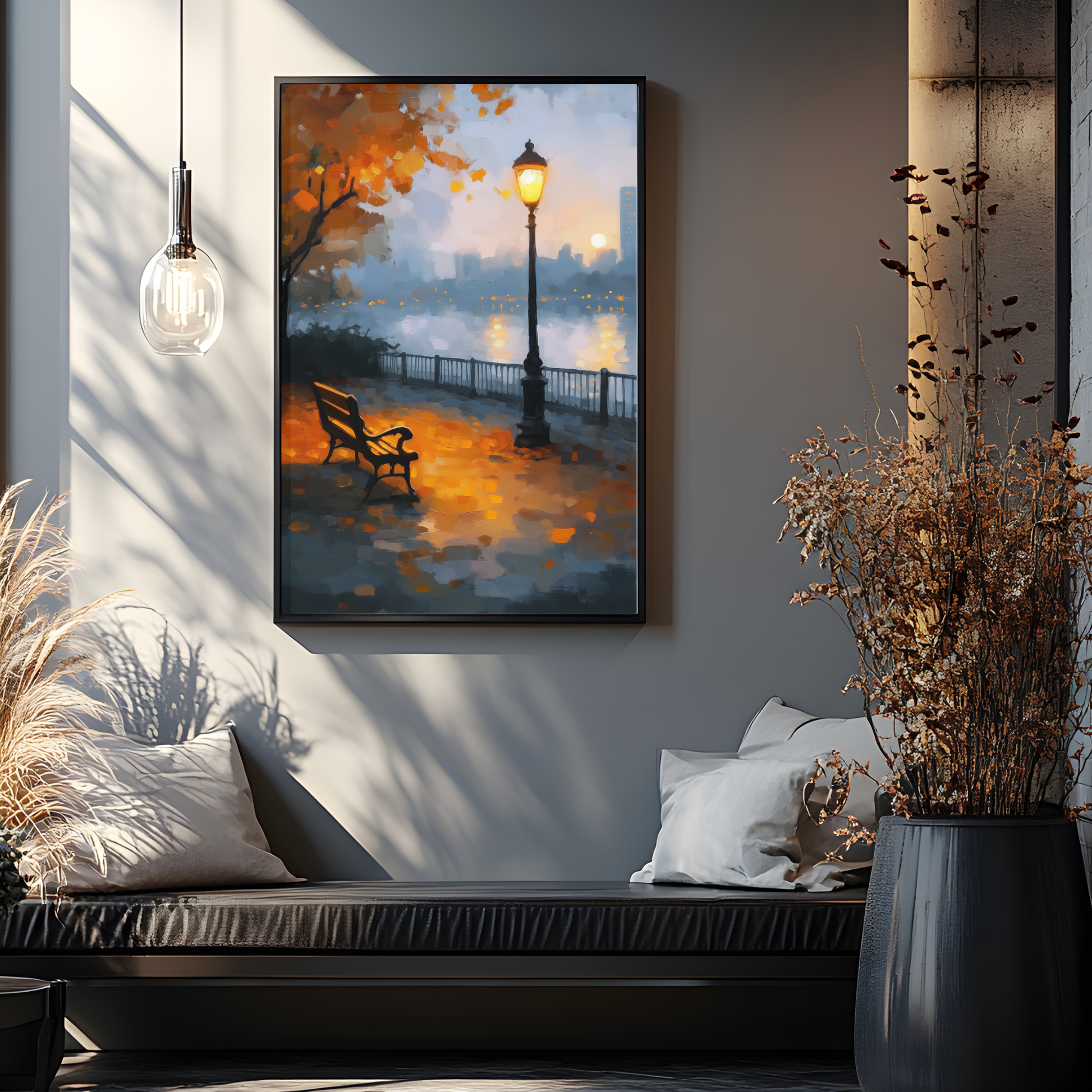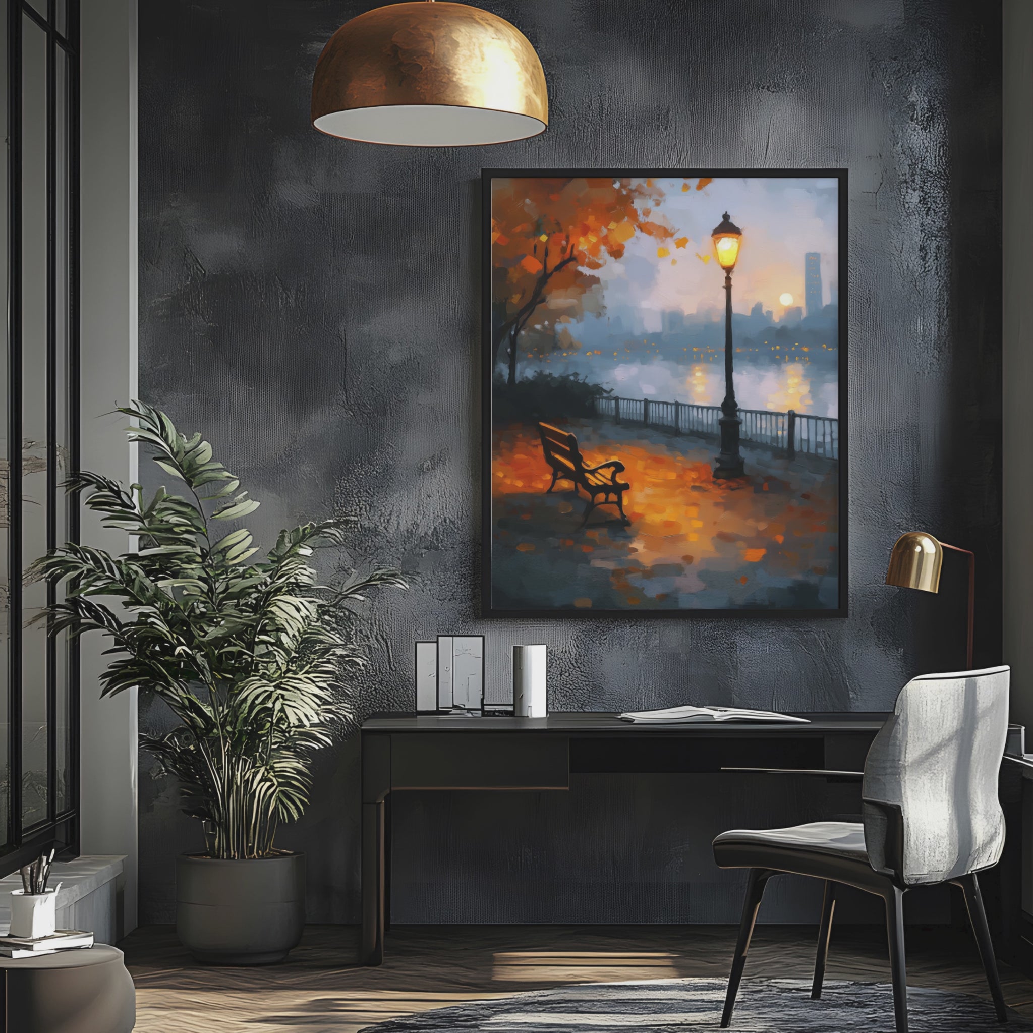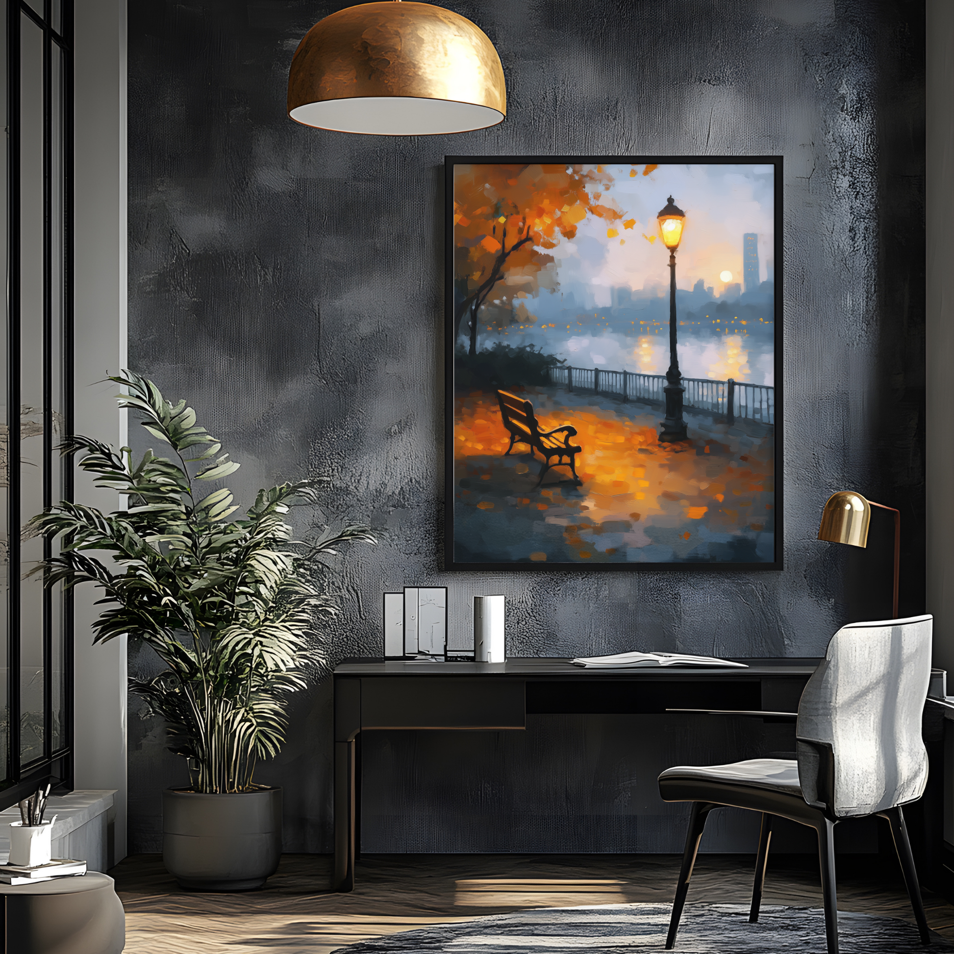 Capture the nostalgic charm of New York City with this evocative oil painting, inspired by the Upper East River Promenade near historic Gracie Mansion. A vintage wooden bench faces the river from a gentle 15-degree angle, illuminated by the warm amber glow of an antique lamp post. Autumn leaves are scattered across the cobblestone path, while a delicate crescent moon hangs in the twilight sky. Misty silhouettes of the East River skyline fade into the background, creating a richly textured, cinematic atmosphere that blends classic impressionist style with modern artistry. The scene’s moody interplay of warm oranges and cool blues, along with the glowing lamplight and river views, evokes a sense of comfort and timelessness. This artwork is perfect for anyone who loves New York’s hidden gems, autumn evenings, and the tranquil beauty of riverside strolls near Gracie Mansion a landmark nestled in Carl Schurz Park and overlooking the East River