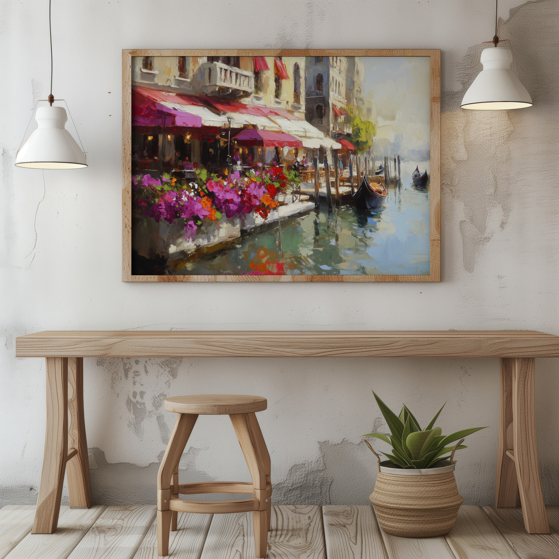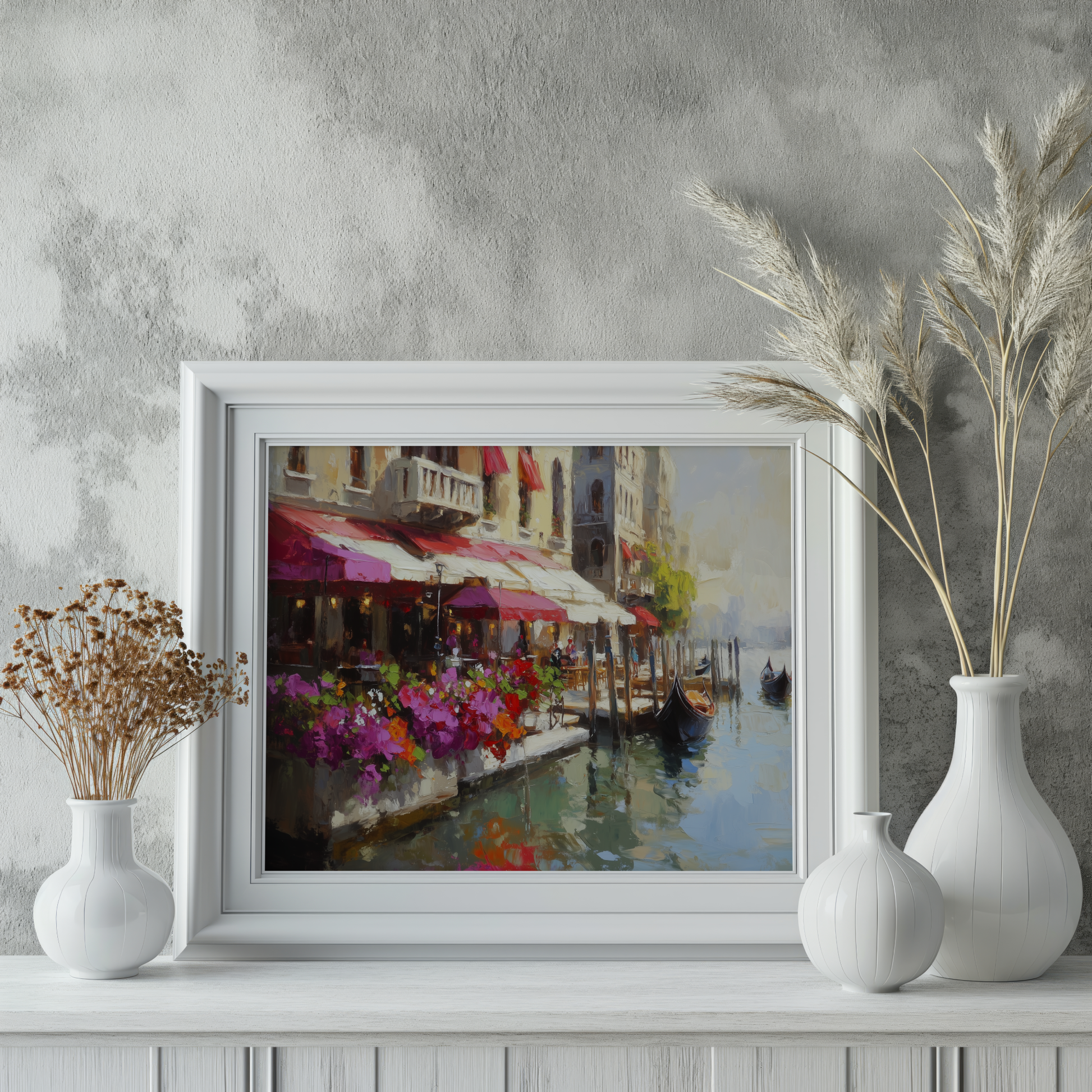 Venice Canal Wall Art Realist Oil Flowers Boats Historic Awnings. High Resolution Digital Download 300 DPI.