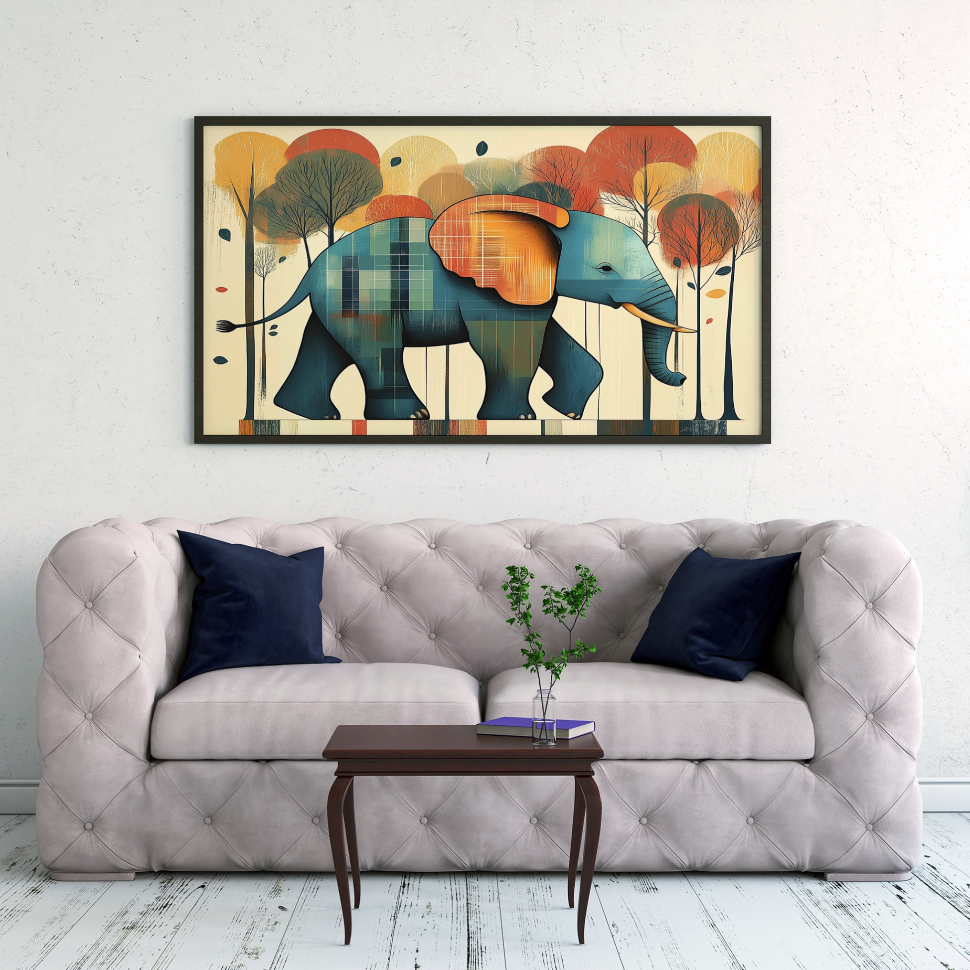 Bring the wild beauty of nature into your home with this stunning abstract elephant painting. This elegant artwork captures the majestic presence of an elephant amidst a vibrant forest, rendered in a captivating array of bold colors. The canvas comes alive with rich blues, fiery reds, warm oranges, and sunny yellows, creating a visual symphony that's both striking and harmonious. Ideal for adding a pop of color to any room, this eye-catching print serves as a conversation starter and a focal point in your decor. Whether displayed in a living room, bedroom, or office space, it's sure to evoke feelings of joy and wonder. This vibrant elephant painting is more than just wall art – it's a celebration of life, color, and the untamed spirit of the natural world.