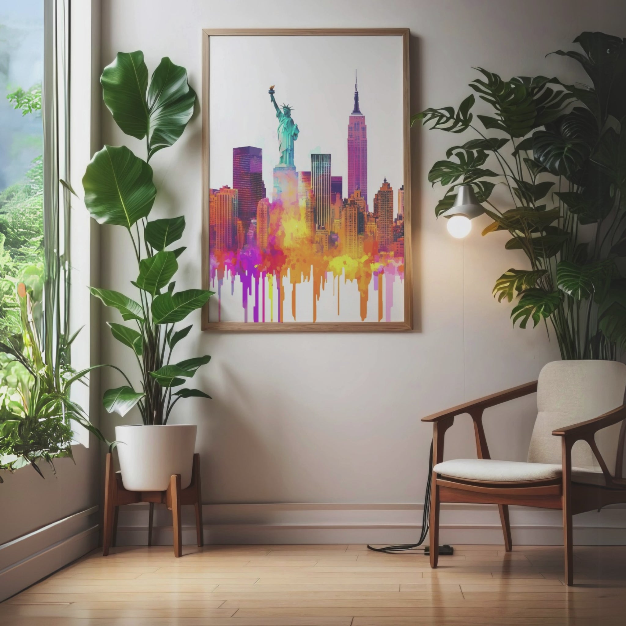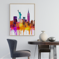 Transform your space with this stunning watercolor print of the iconic New York City skyline. This elegant painting captures the essence of the Big Apple in a burst of vibrant, abstract colors. Renowned landmarks like the Empire State Building and the Statue of Liberty stand out against a crisp white background, creating a dynamic visual spectacle. Perfect for urban dwellers, NYC lovers, and modern art enthusiasts, this eye-catching wall art print brings the energy and diversity of New York City into your home or office. Ideal as a statement piece or a thoughtful gift, this colorful skyline poster adds a touch of metropolitan flair to any room.