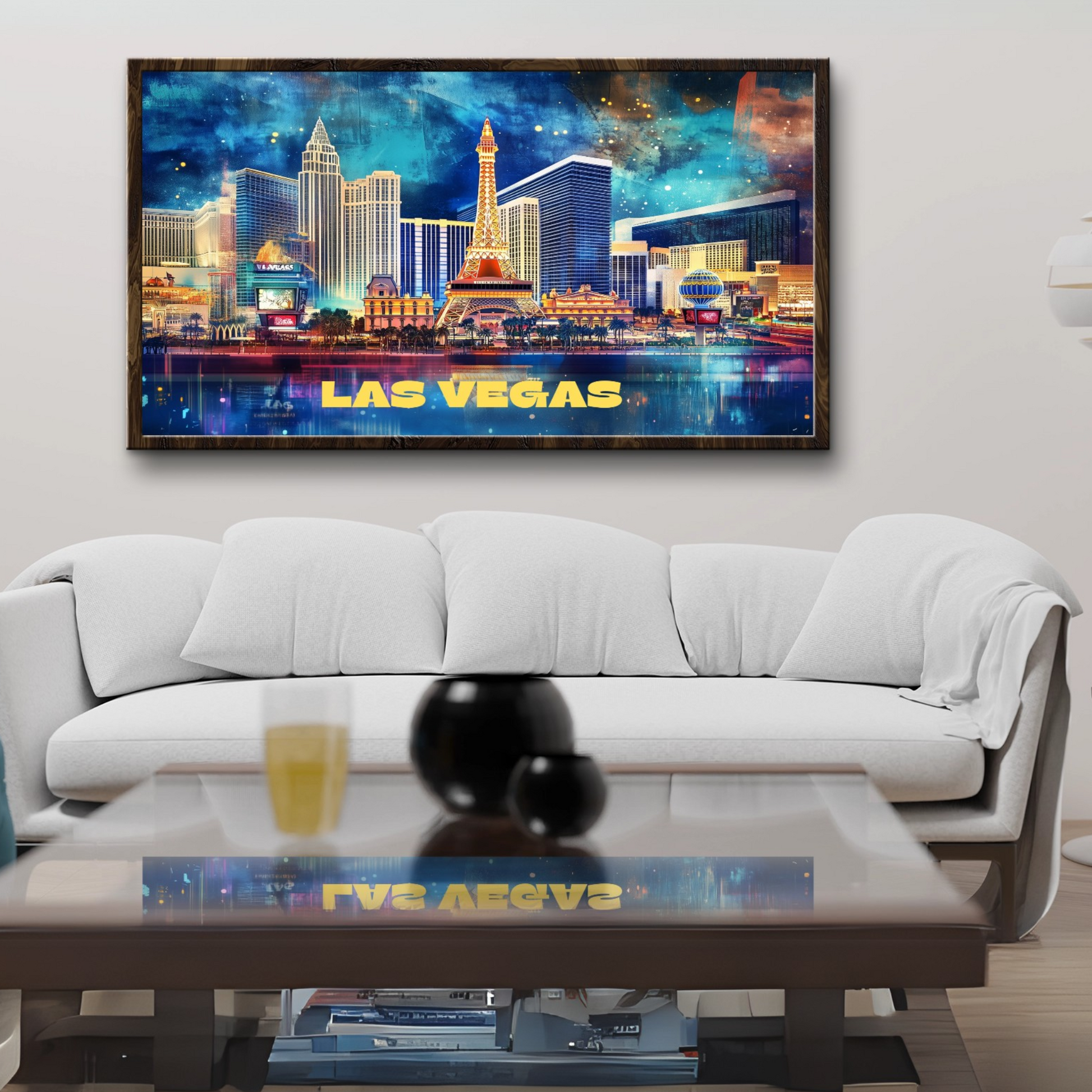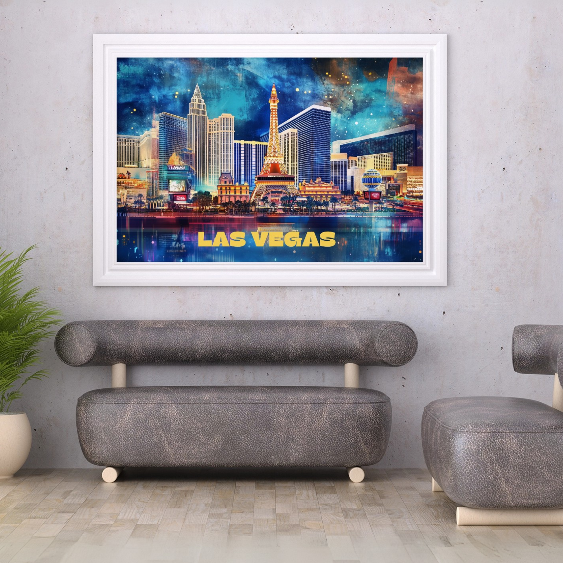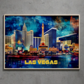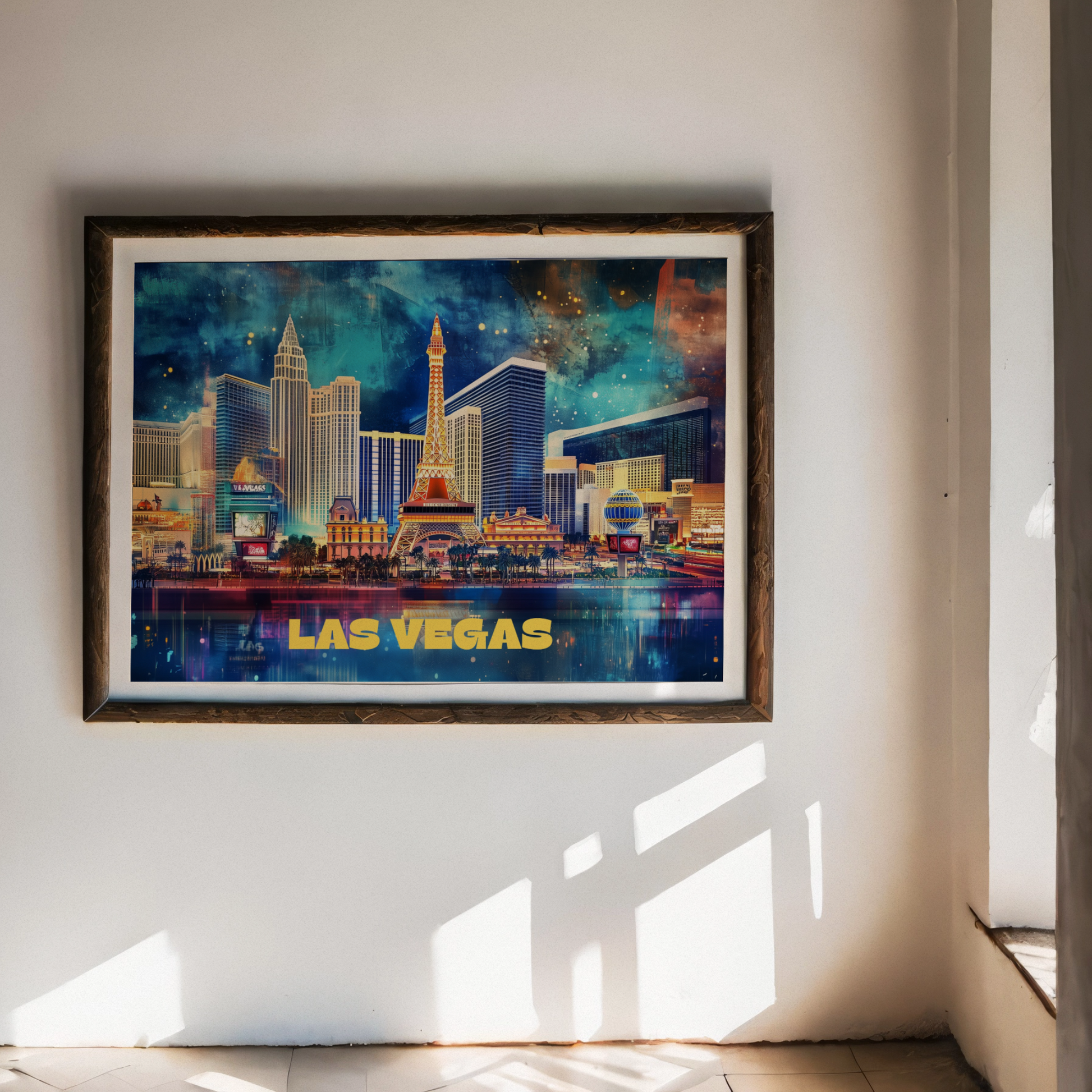 Step into the dazzling world of Las Vegas with this elegant painting that captures the city's essence in one breathtaking scene. This artwork showcases the iconic Las Vegas Strip in all its nocturnal glory, featuring a vibrant cityscape of towering skyscrapers and world-famous landmarks, including the striking Eiffel Tower replica. Set against a mesmerizing night sky, the scene is brought to life with a symphony of neon lights that dance across the canvas. A classic vintage touch adds a nostalgic feel, while the dreamlike reflection in the water creates a surreal, captivating atmosphere. Perfect for Vegas enthusiasts, travel lovers, or anyone seeking to add a touch of glamour to their space, this art print brings the magic of Sin City into your home or office.