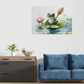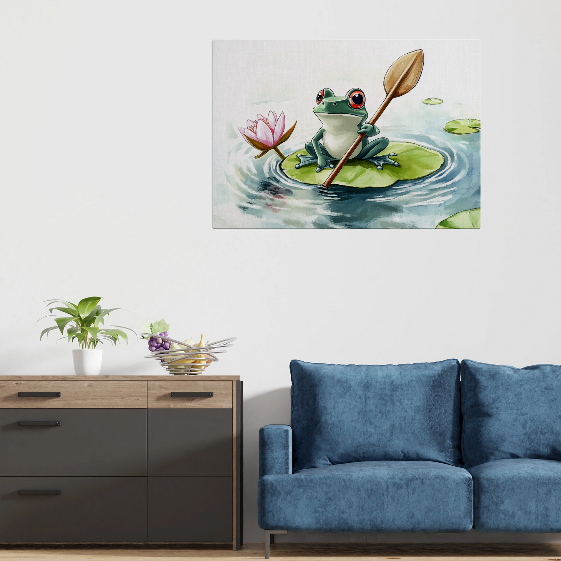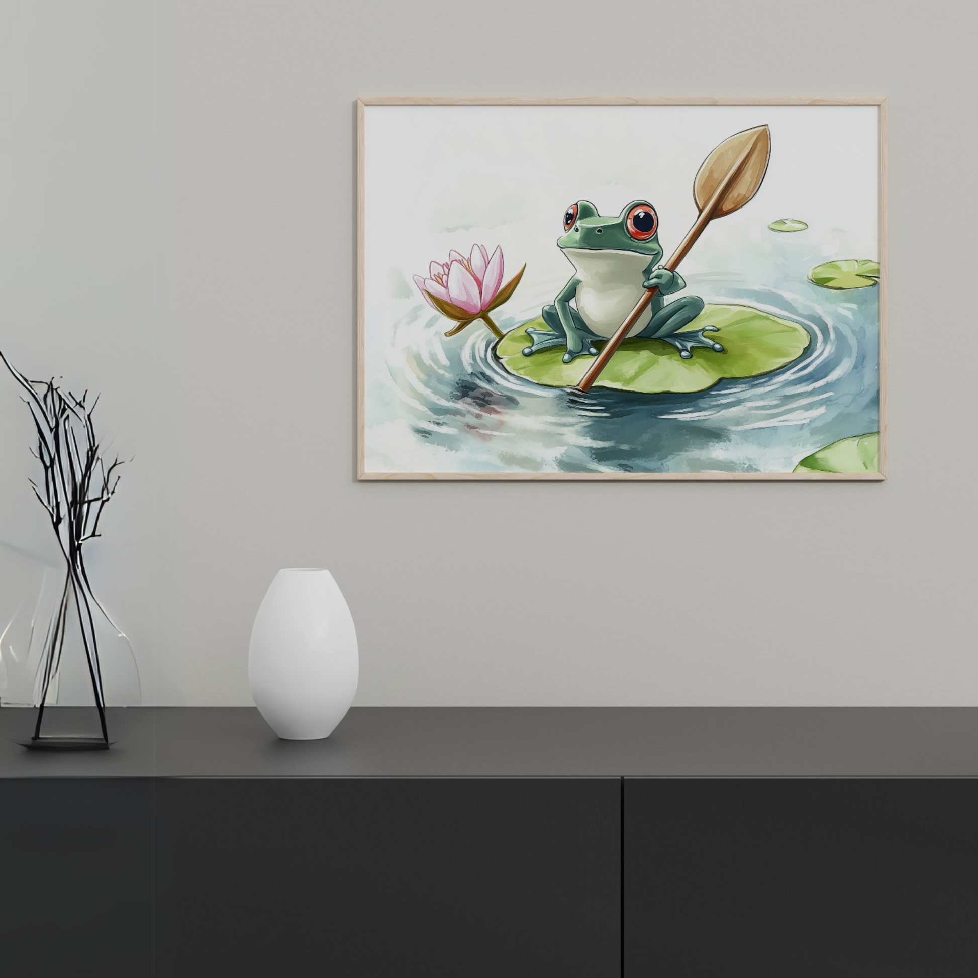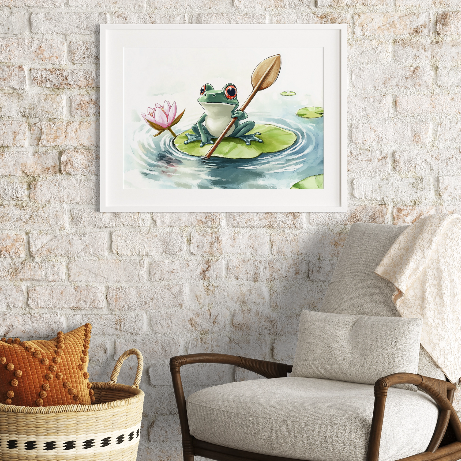 Bring a touch of whimsy and charm to your space with this delightful watercolor painting of a playful frog's aquatic adventure. This elegant artwork captures the essence of joy and serenity in a vibrant, illustrative style that's sure to brighten any room. The painting showcases an adorable frog, rendered in soft watercolors, as he floats contentedly on a serene body of water. With a cheerful smile on his face, the frog grasps a tiny paddle, creating the illusion of rowing through his tranquil habitat. A verdant lily pad floats nearby, adding a pop of natural beauty to the scene. This playful yet sophisticated piece is perfect for nature lovers, art enthusiasts, or anyone looking to add a touch of lighthearted elegance to their decor. Ideal for nurseries, children's rooms, bathrooms, or any space in need of a cheerful focal point, this frog watercolor print is sure to spark joy and imagination.