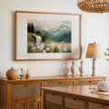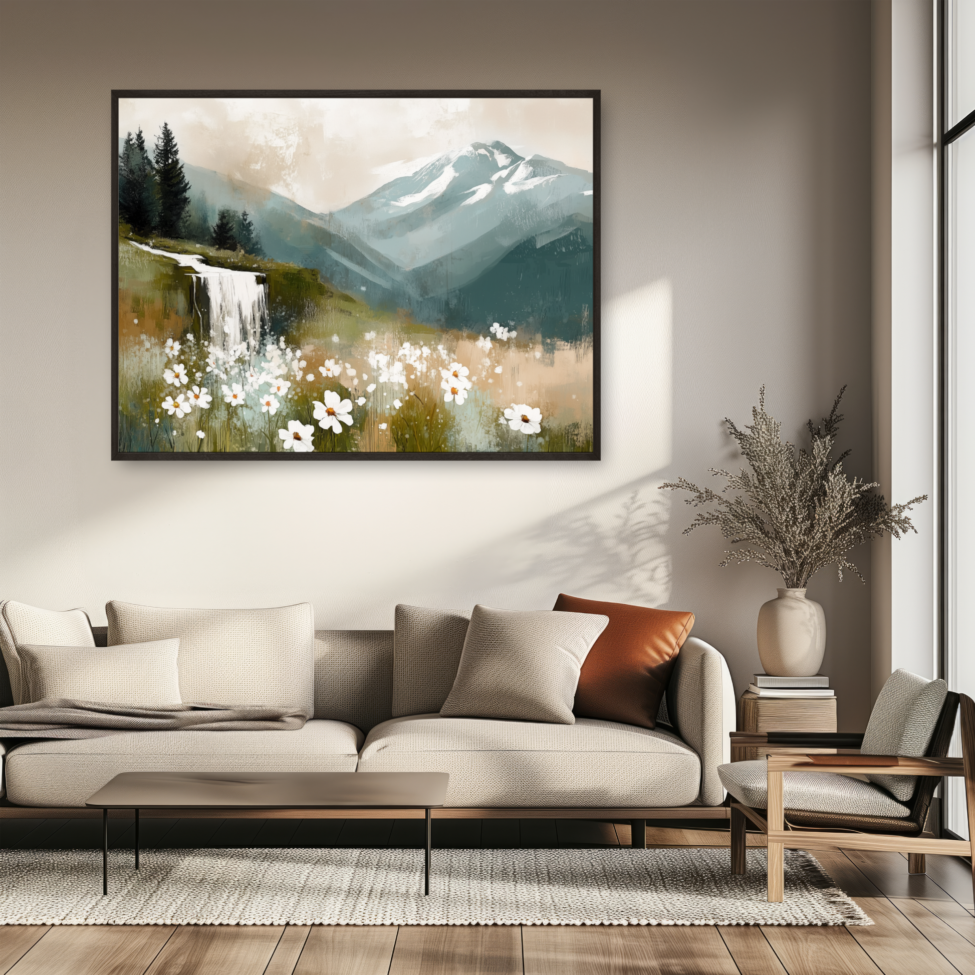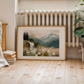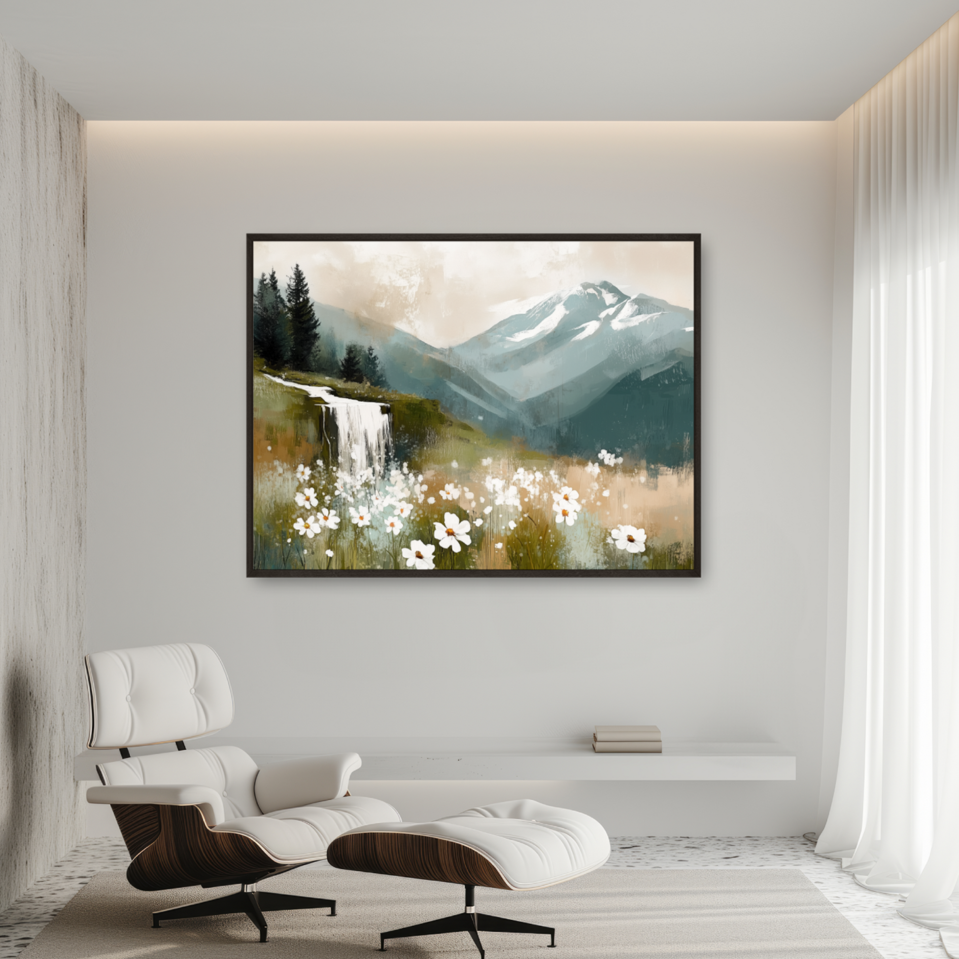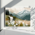 Bring a touch of enchantment to your home with this whimsical wall art featuring a vibrant field of violets set beneath a beautiful sky. In the distance, majestic snow-capped mountains rise above the landscape, while a charming small waterfall adds a sense of tranquility and movement. The dreamy composition and lively colors create a captivating scene that evokes wonder and serenity, making it a perfect centerpiece for any living room, bedroom, or creative space. Ideal for nature lovers and those who appreciate imaginative landscapes, this artwork combines the delicate beauty of violets with the grandeur of mountains and the peaceful allure of flowing water. The harmonious blend of sky, flowers, and natural elements invites you to escape into a world of scenic beauty and calm. Elevate your decor with this unique and uplifting piece.