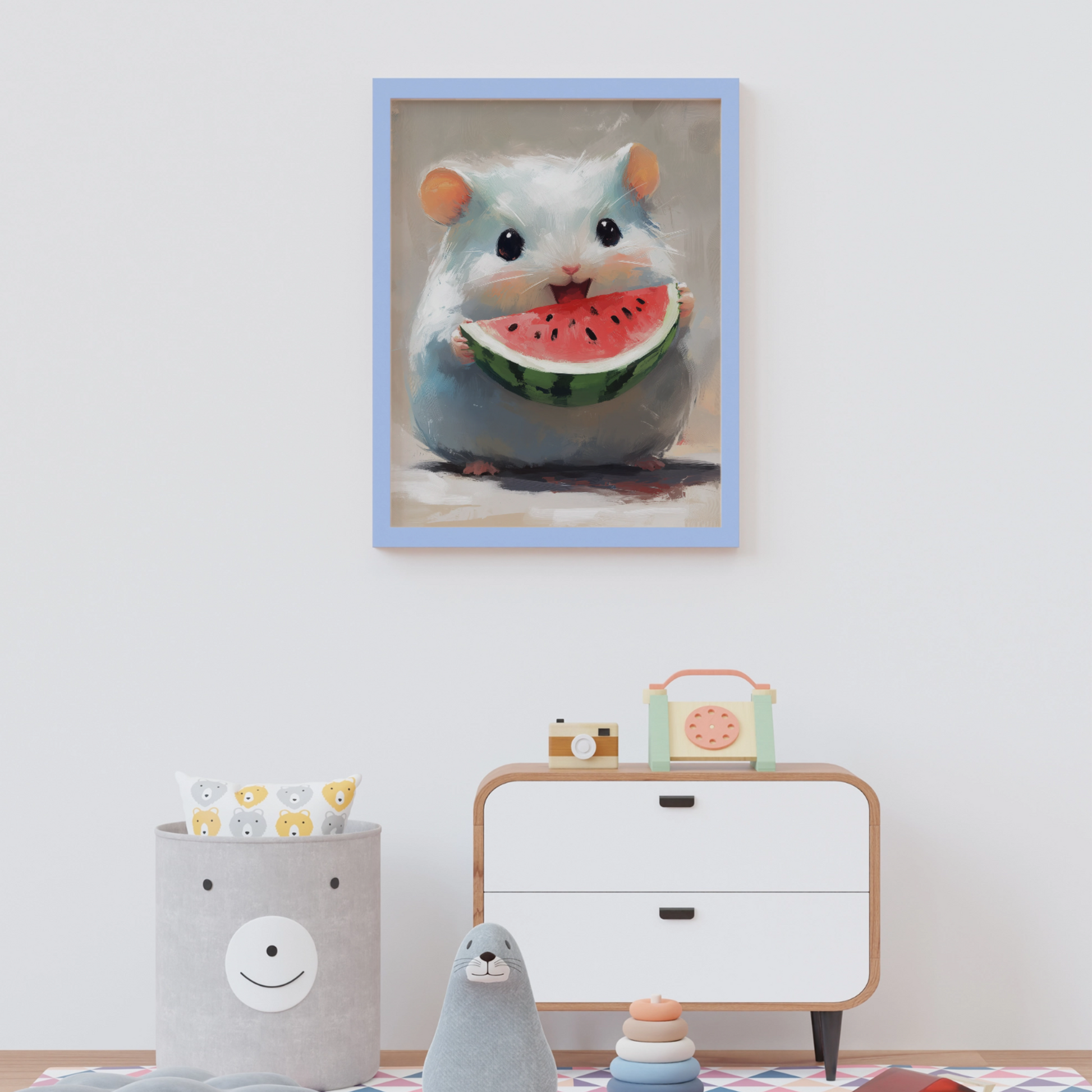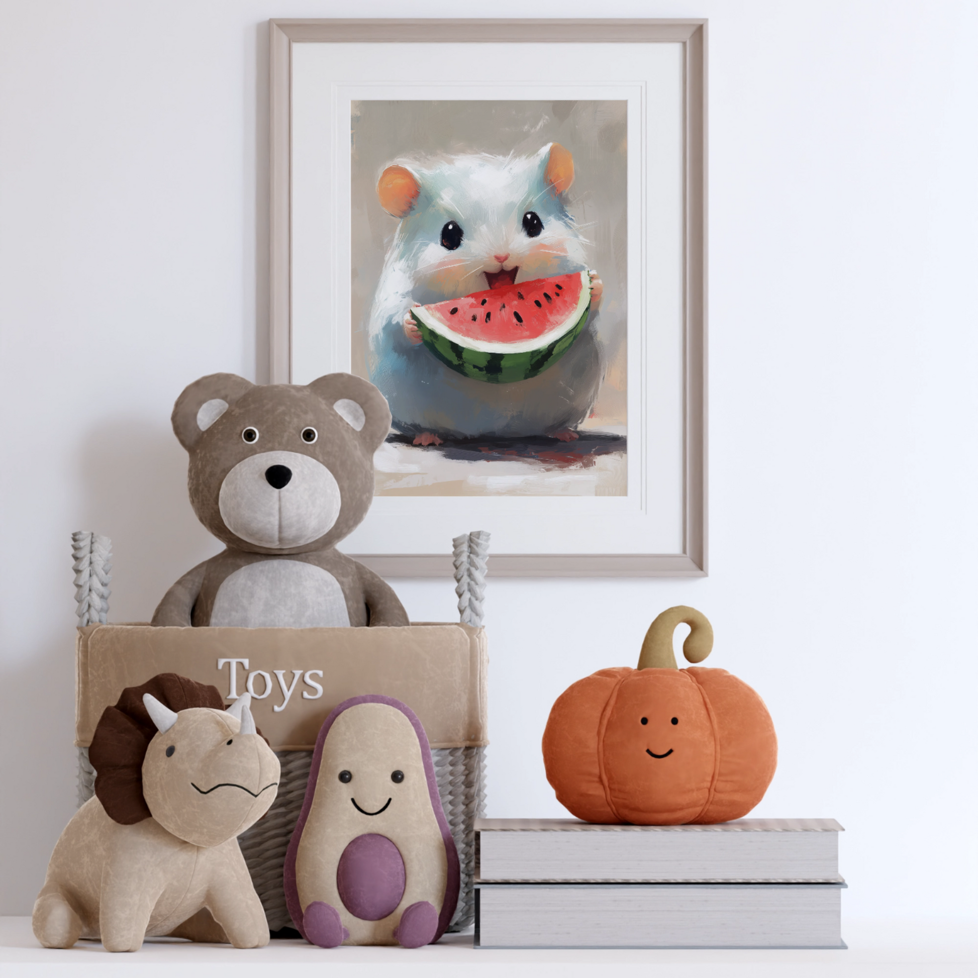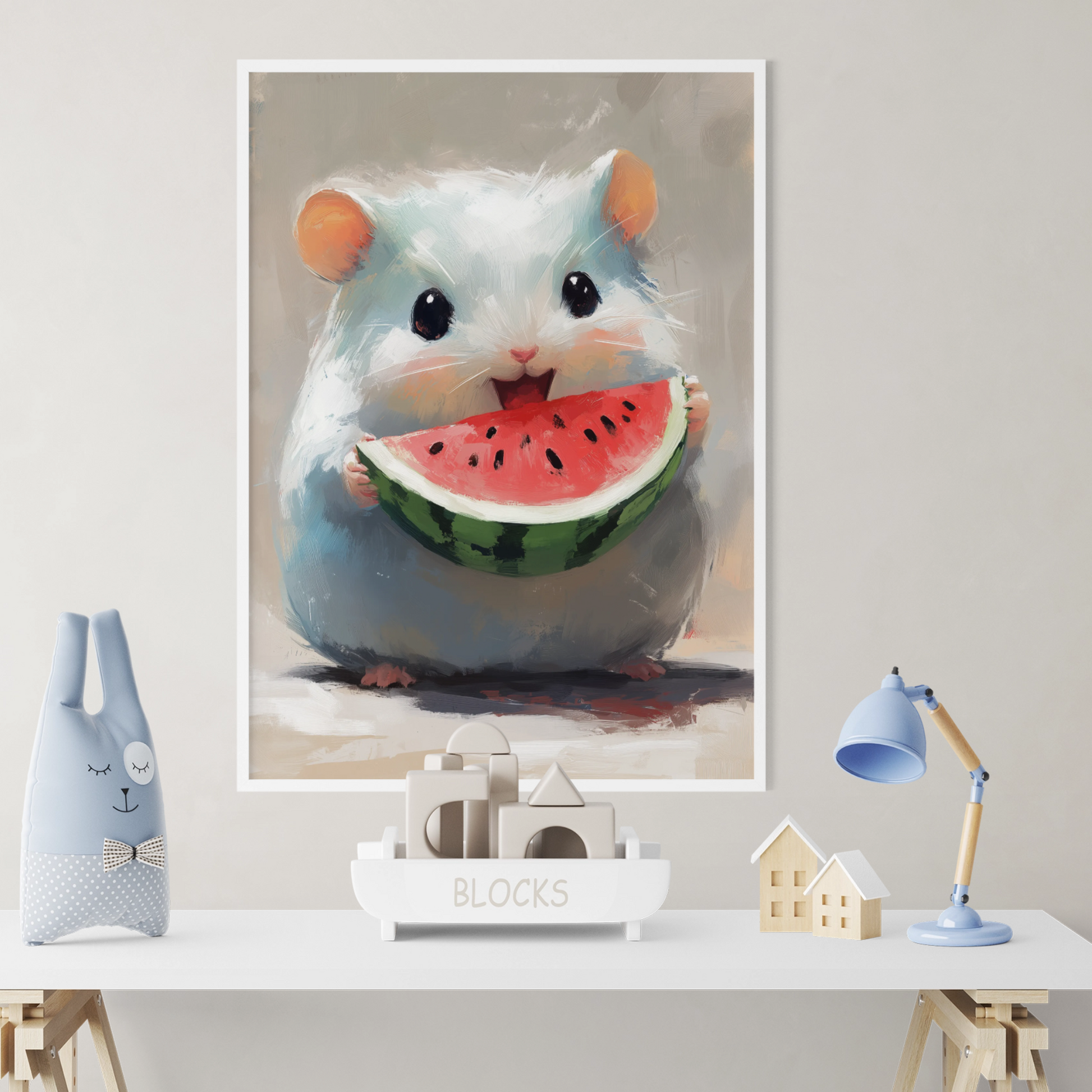Bring a touch of charm and whimsy to your space with this delightful oil painting of an adorable hamster enjoying a slice of juicy watermelon. This elegant artwork captures the essence of innocence and joy in a vibrant, textured style that's sure to captivate viewers of all ages. The hamster's endearing expression as it indulges in its fruity treat brings a sense of playfulness and delight to any room. This unique combination of a beloved pet and a summer favorite creates a whimsical scene that's both heartwarming and visually appealing. Perfect for animal lovers, art enthusiasts, or anyone looking to add a pop of color and joy to their decor, this hamster painting is versatile enough to complement various interior styles. Whether displayed in a living room, bedroom, children's room, or office space, it's sure to bring smiles and start conversations. This charming canvas print makes an ideal gift for hamster owners, art collectors, or as a delightful addition to your own home. Let this cute hamster's watermelon feast brighten your day and add a touch of whimsy to your walls.
