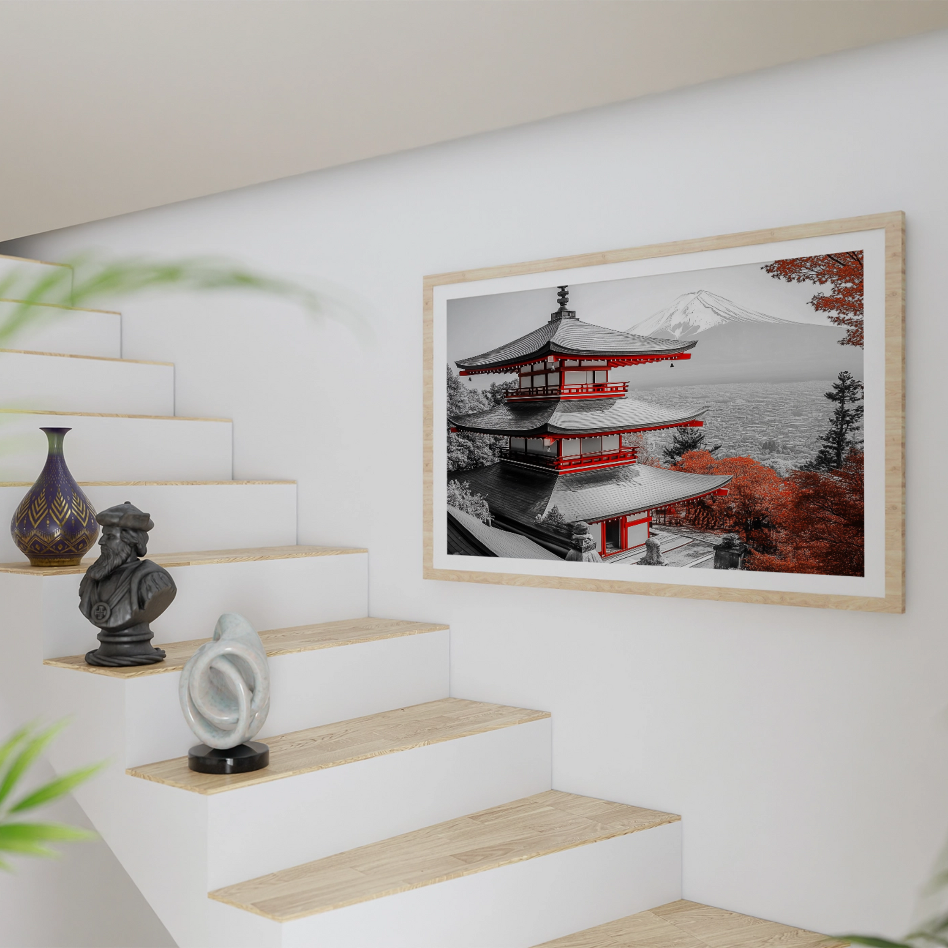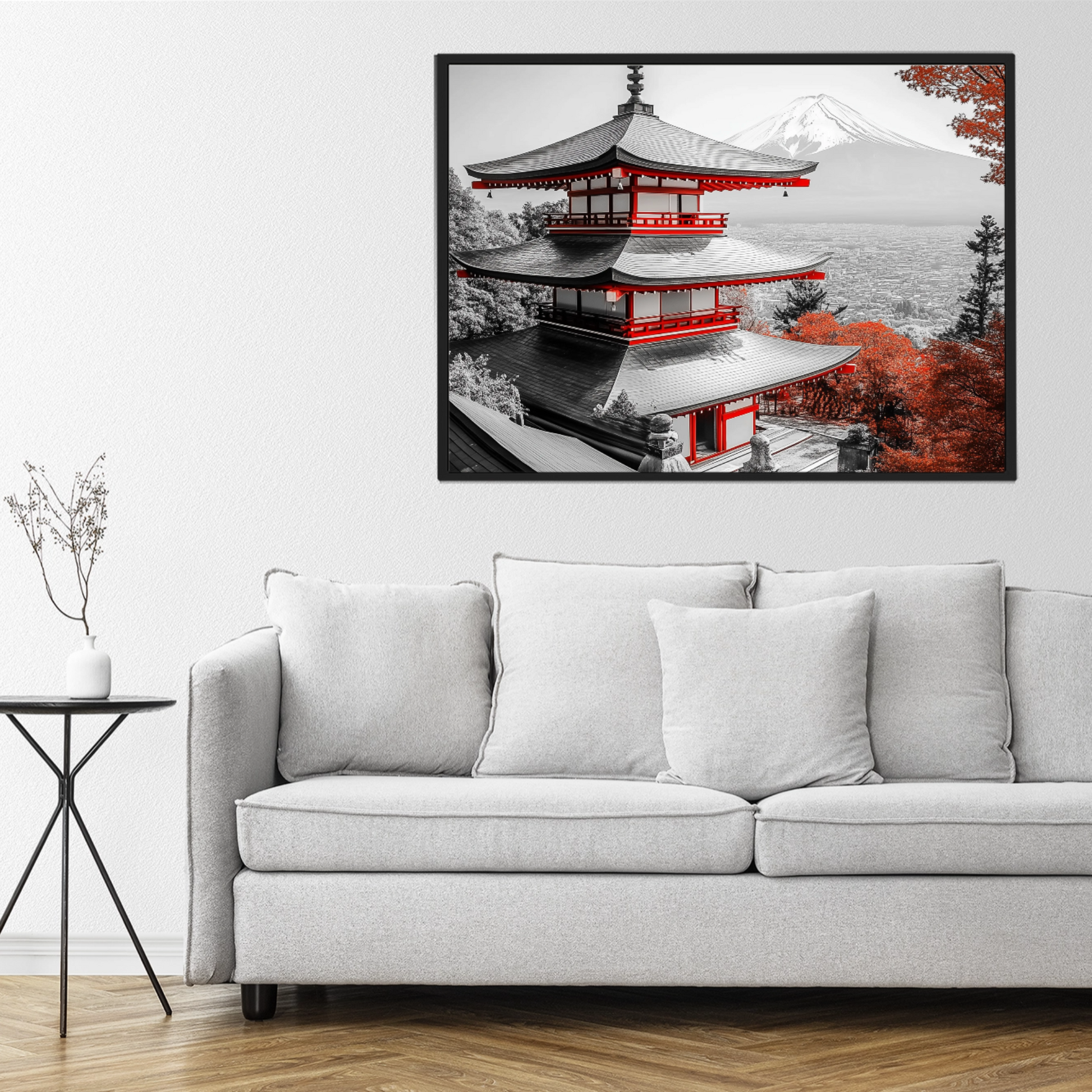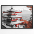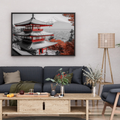 Transform your space with this elegant painting that captures the essence of Japanese tranquility. This exquisite artwork showcases a traditional temple nestled in the heart of nature, surrounded by a breathtaking autumnal landscape. Vibrant red maple trees frame the serene temple, their rich colors creating a stunning contrast against the structure's timeless architecture. The misty, mountainous backdrop adds depth and mystery, evoking a sense of calm and contemplation. Ideal for living rooms, bedrooms, meditation spaces, or offices, this art print offers a daily escape into a world of serenity. It serves as a focal point for relaxation and reflection, inviting viewers to pause and appreciate the beauty of the changing seasons. Whether you're a seasoned art collector or simply looking to add a touch of tranquility to your environment, this Japanese temple print is sure to inspire and soothe.